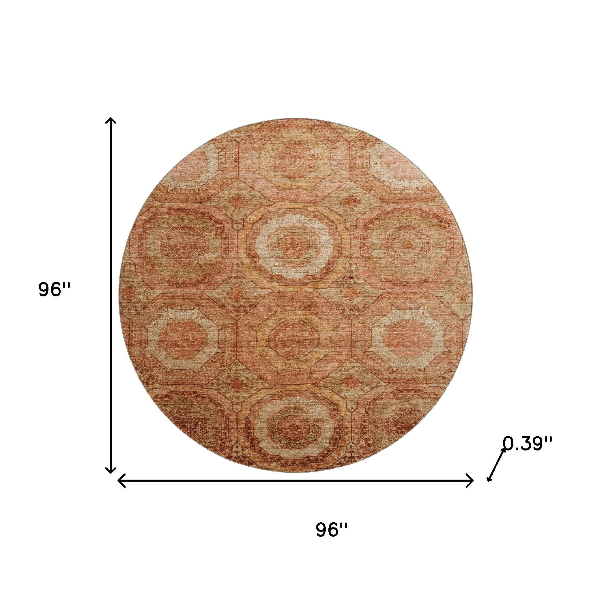 This 8-foot terra cotta and copper geometric washable round rug with uv protection, is a great way to add warmth to a room. Ideal for spaces with kids and pets, this rug is stain resistant to help repel dirt and spilled liquids. Built to last, this rug crafted from polyester fibers is known for its durability and long lasting appeal. Rugs are a great way to showcase your style, hide imperfections, warm your home and reduce noise. This larger sized, transitional styled rug is ready to create a focal point or statement piece in your room. 96.00-inch h x 96.00-inch w x 0.39-inch d.
