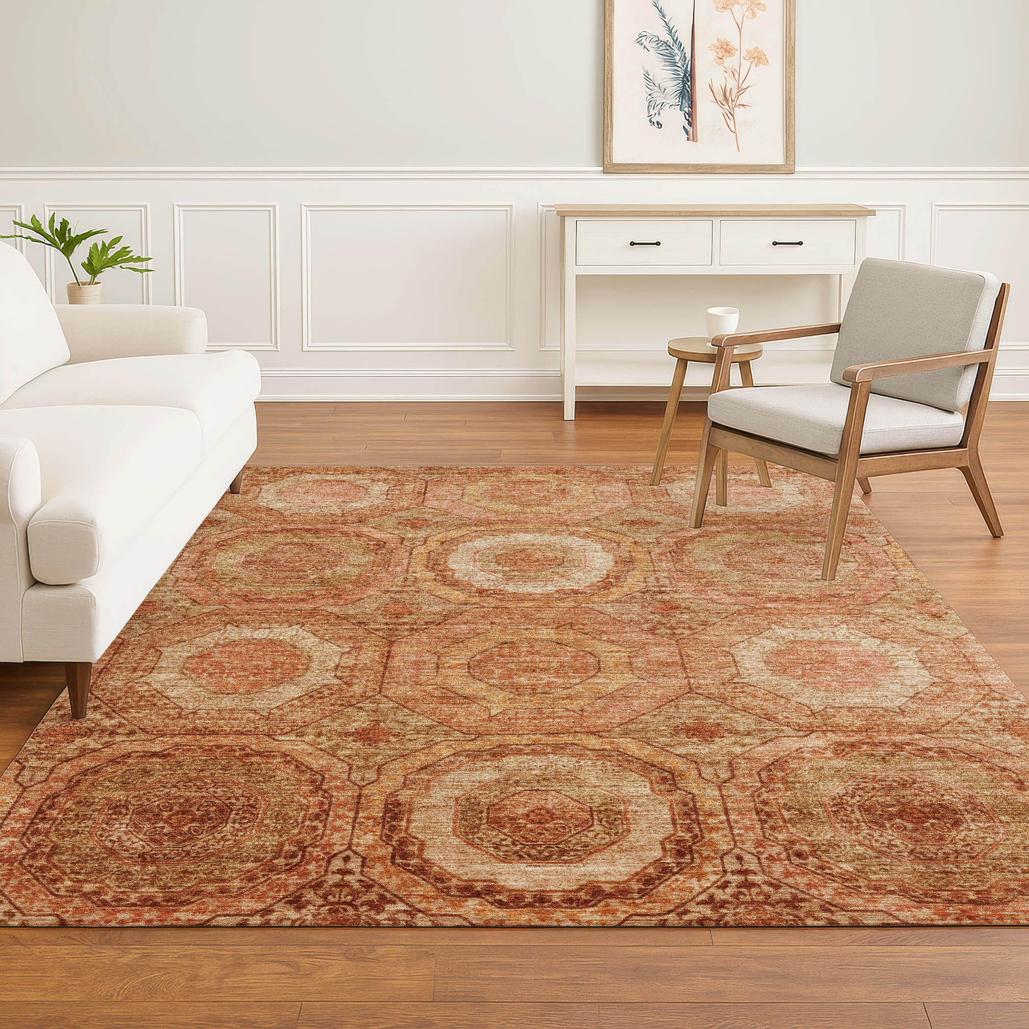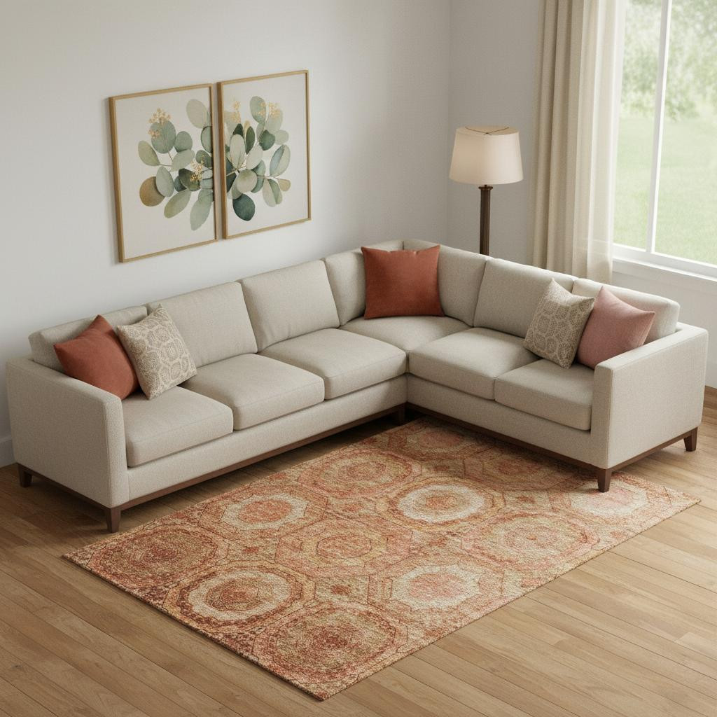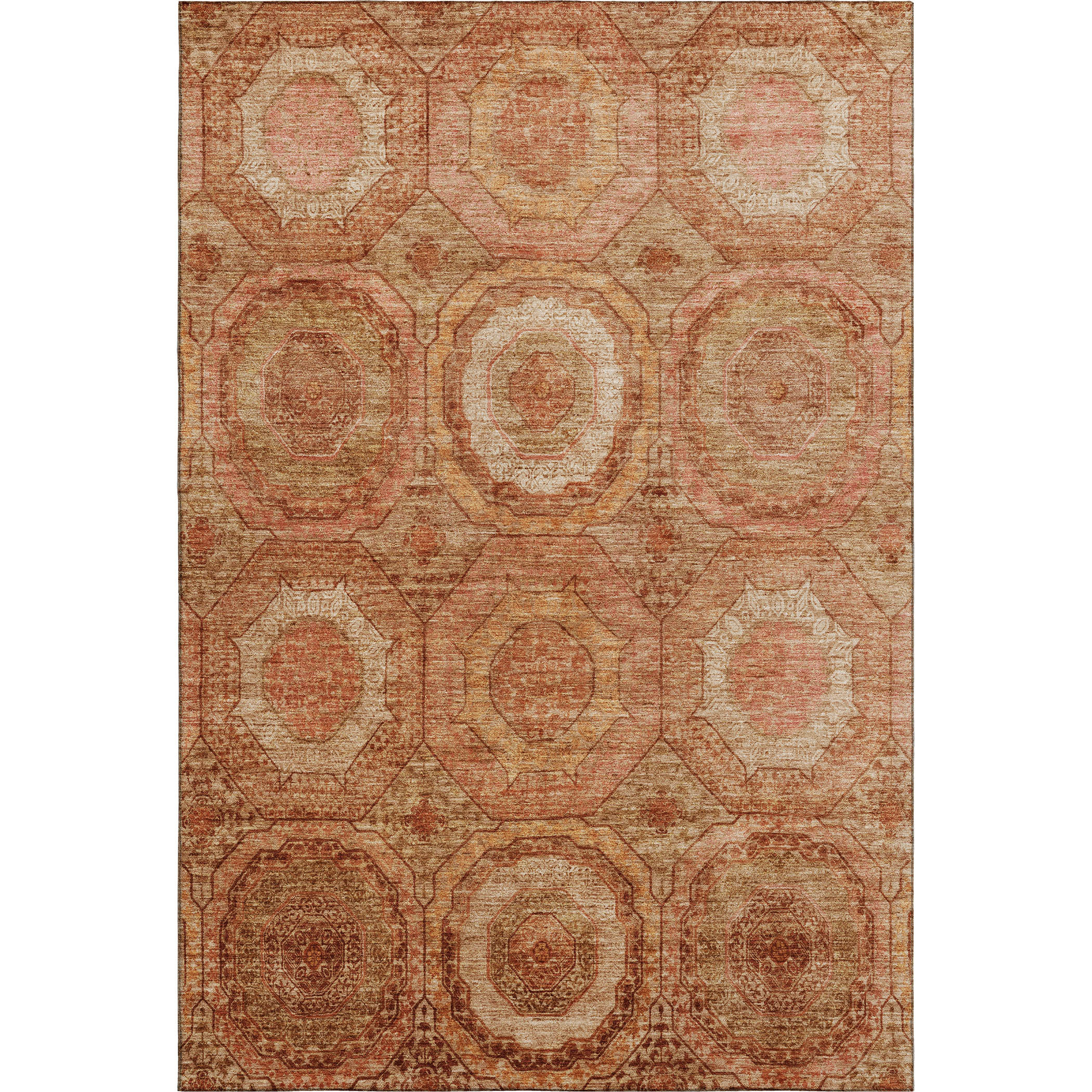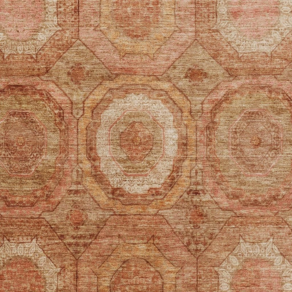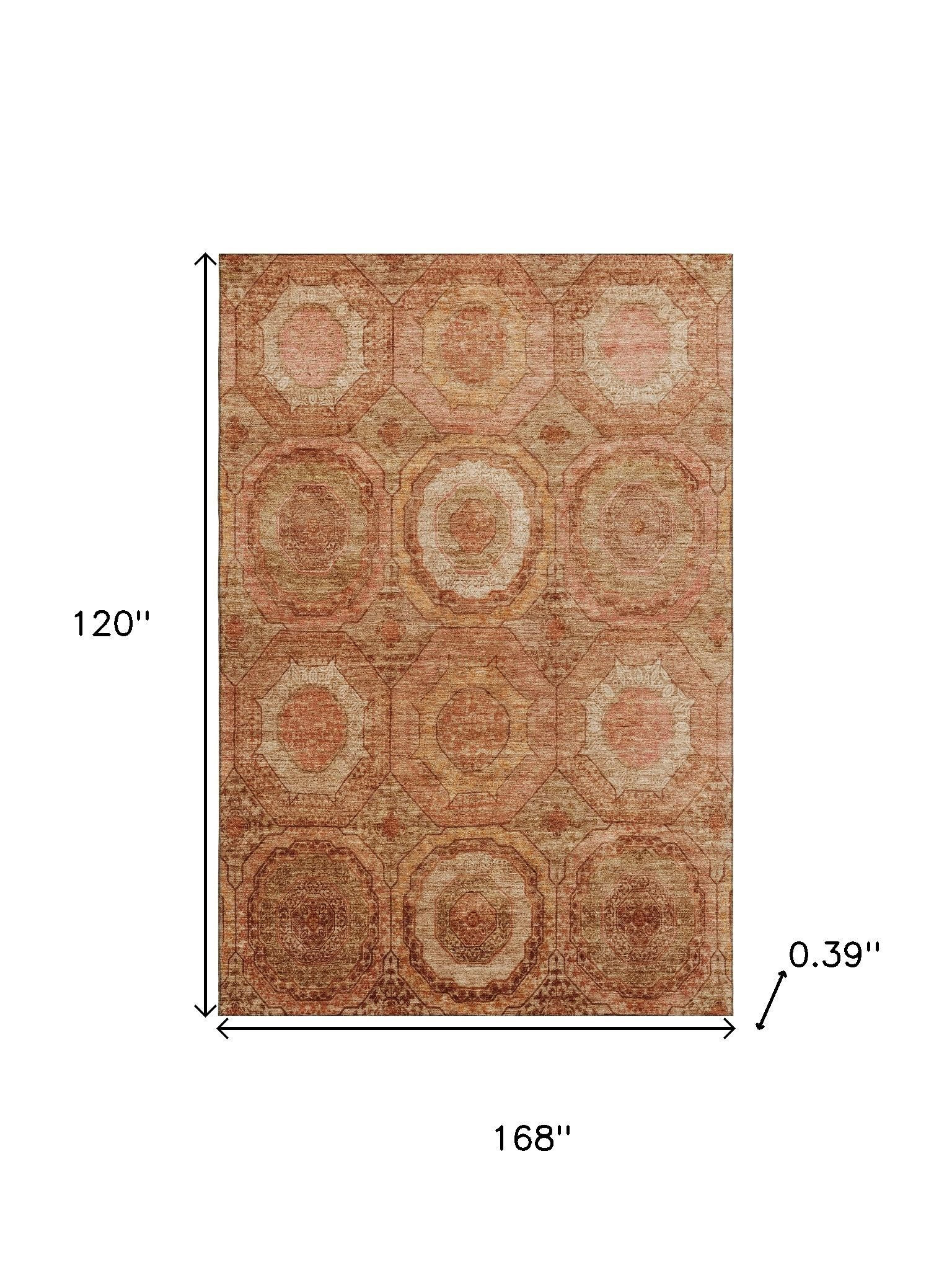 Add some artistry to your room with this 10-foot x 14-foot terra cotta and copper geometric washable area rug with uv protection. Ideal for spaces with kids and pets, this rug is stain resistant to help repel dirt and spilled liquids. Built to last, this rug crafted from polyester fibers is known for its durability and long lasting appeal. Rugs are a great way to showcase your style, hide imperfections, warm your home and reduce noise. This larger sized, transitional styled rug is ready to create a focal point or statement piece in your room. 120.00-inch h x 168.00-inch w x 0.39-inch d.