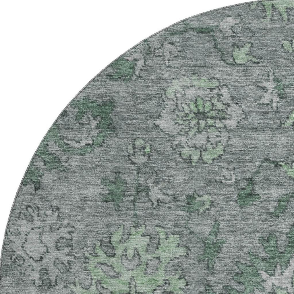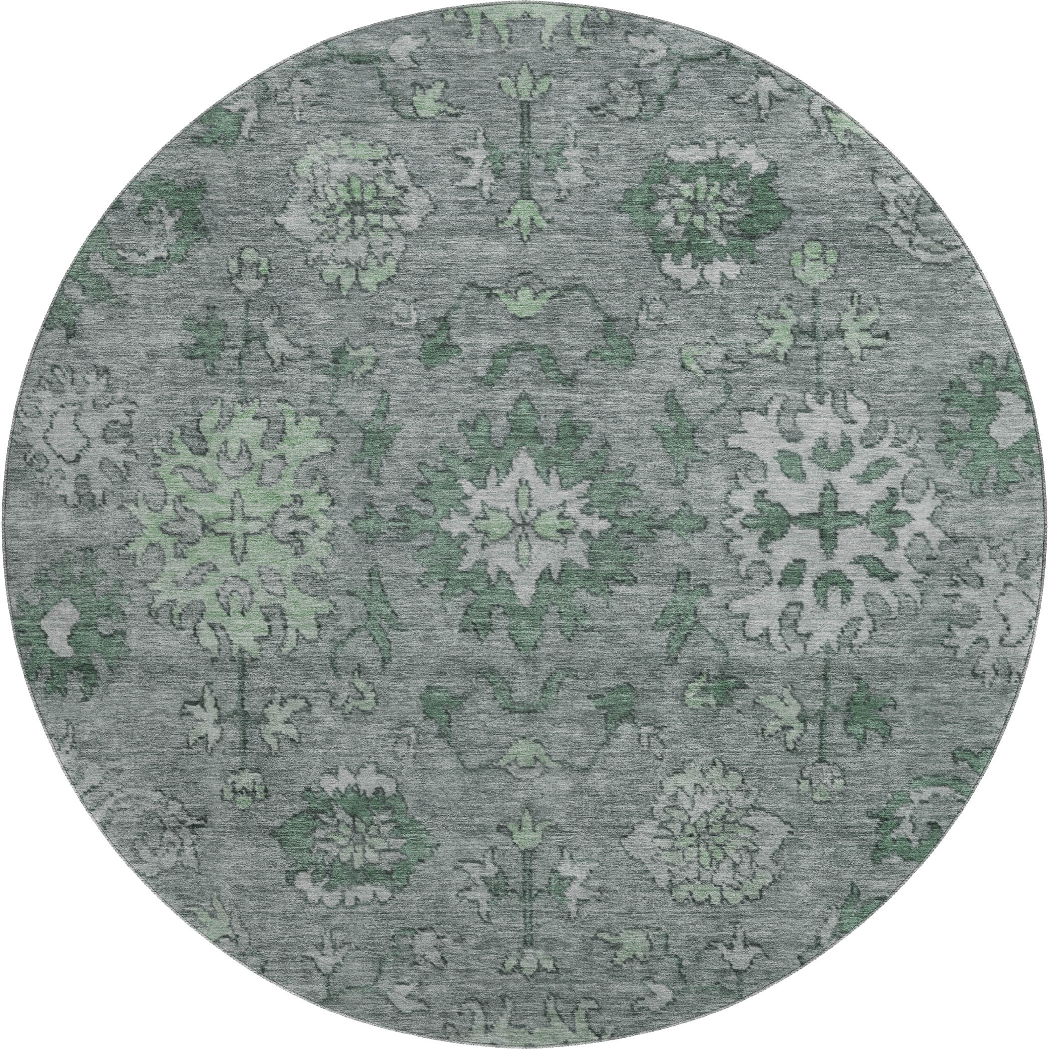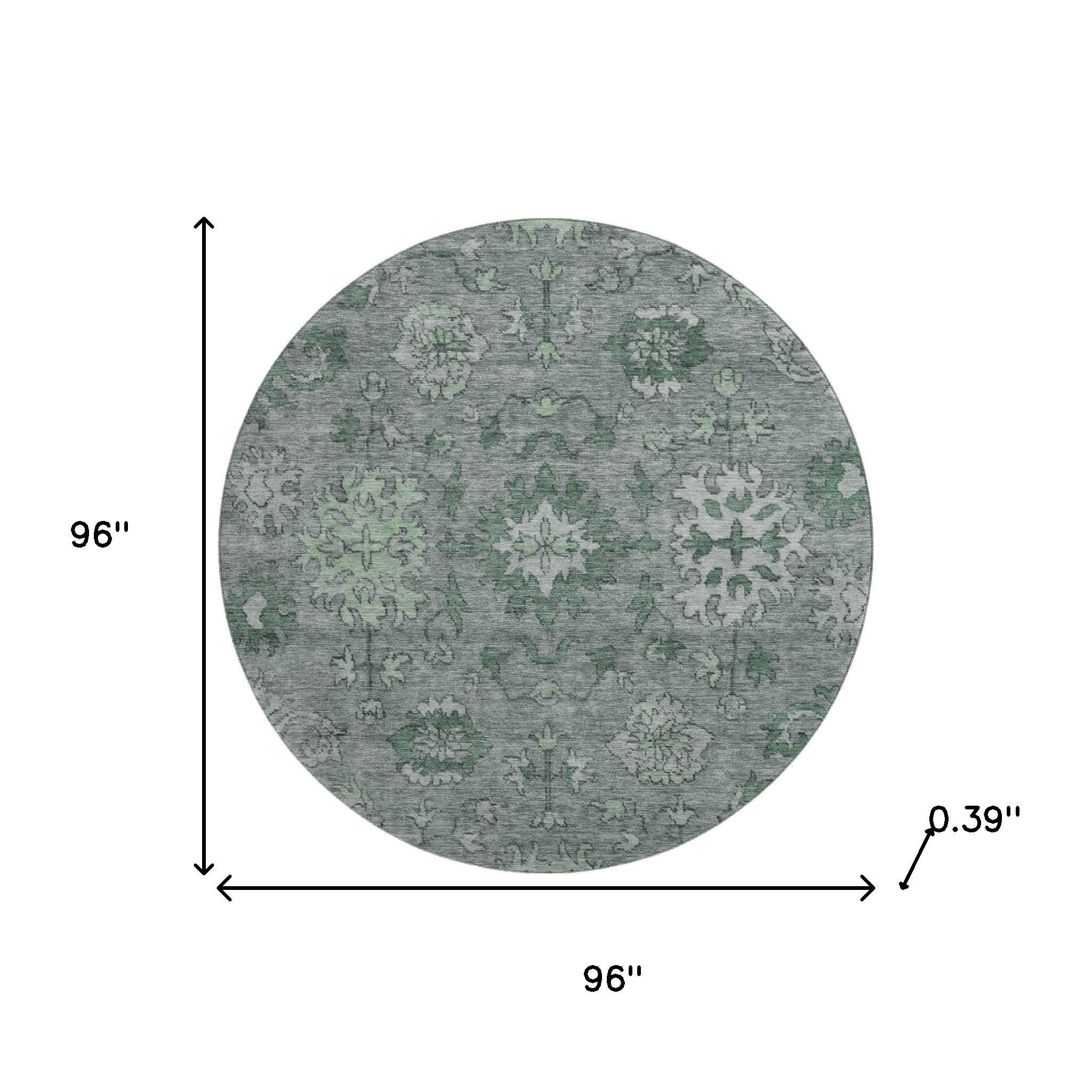 This 8-foot sage and gray oriental washable round rug with uv protection, is a great way to add warmth to a room. Ideal for spaces with kids and pets, this rug is stain resistant to help repel dirt and spilled liquids. Built to last, this rug crafted from polyester fibers is known for its durability and long lasting appeal. Rugs are a great way to showcase your style, hide imperfections, warm your home and reduce noise. This larger sized, traditional styled rug is ready to create a focal point or statement piece in your room. 96.00-inch h x 96.00-inch w x 0.39-inch d.
