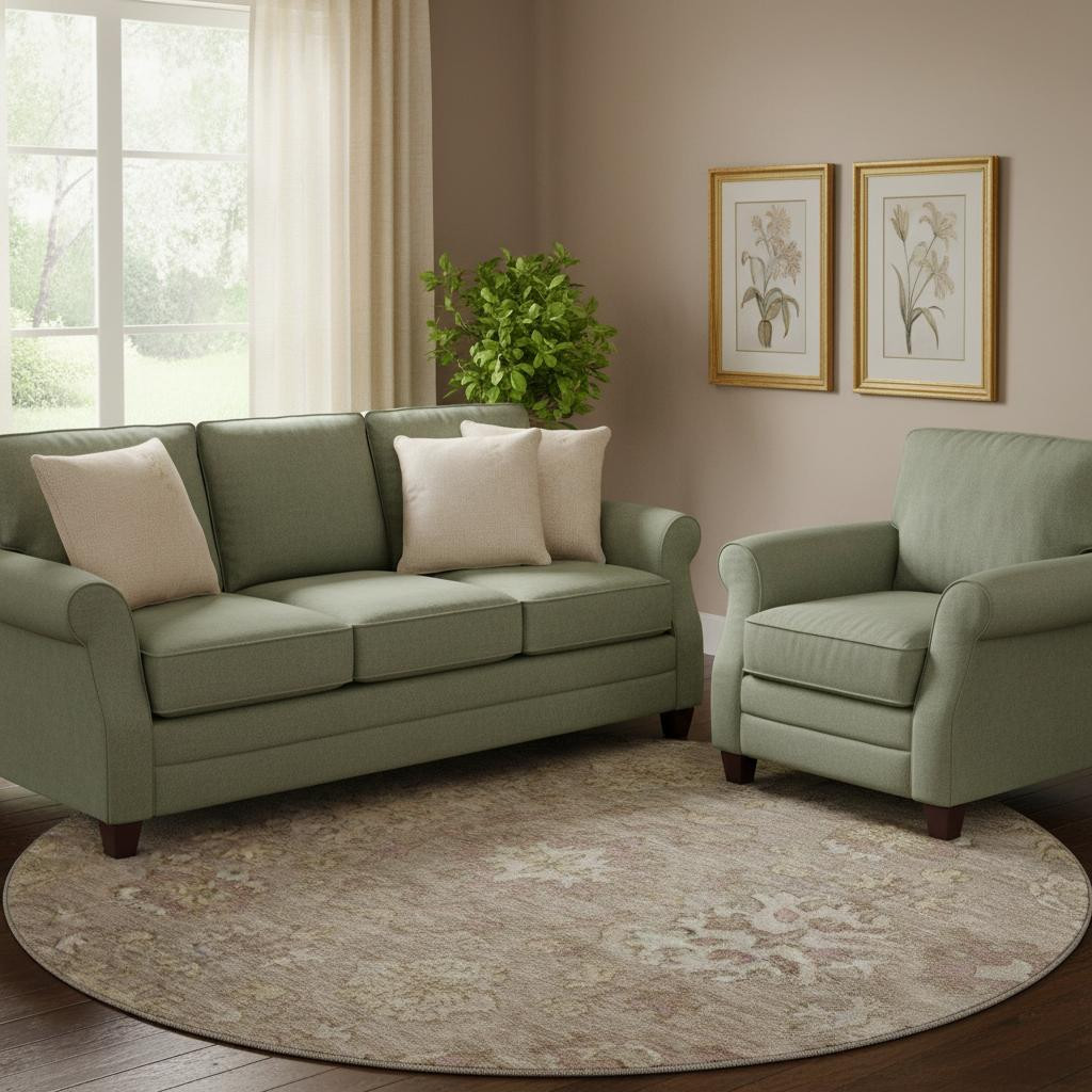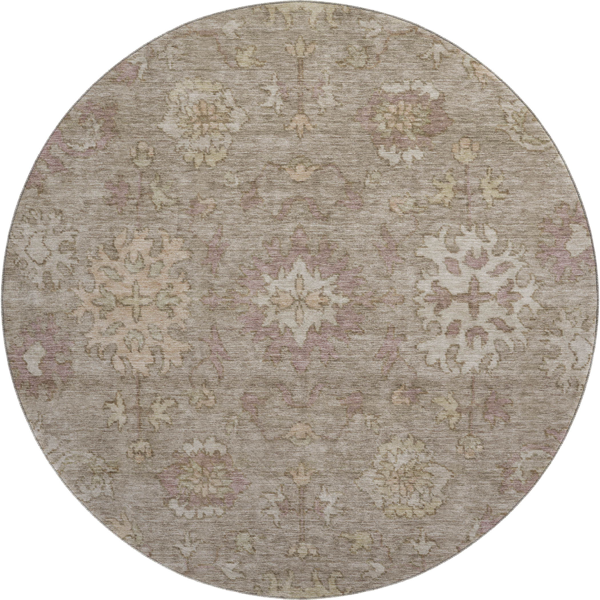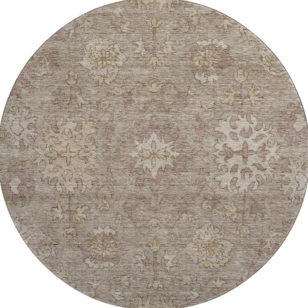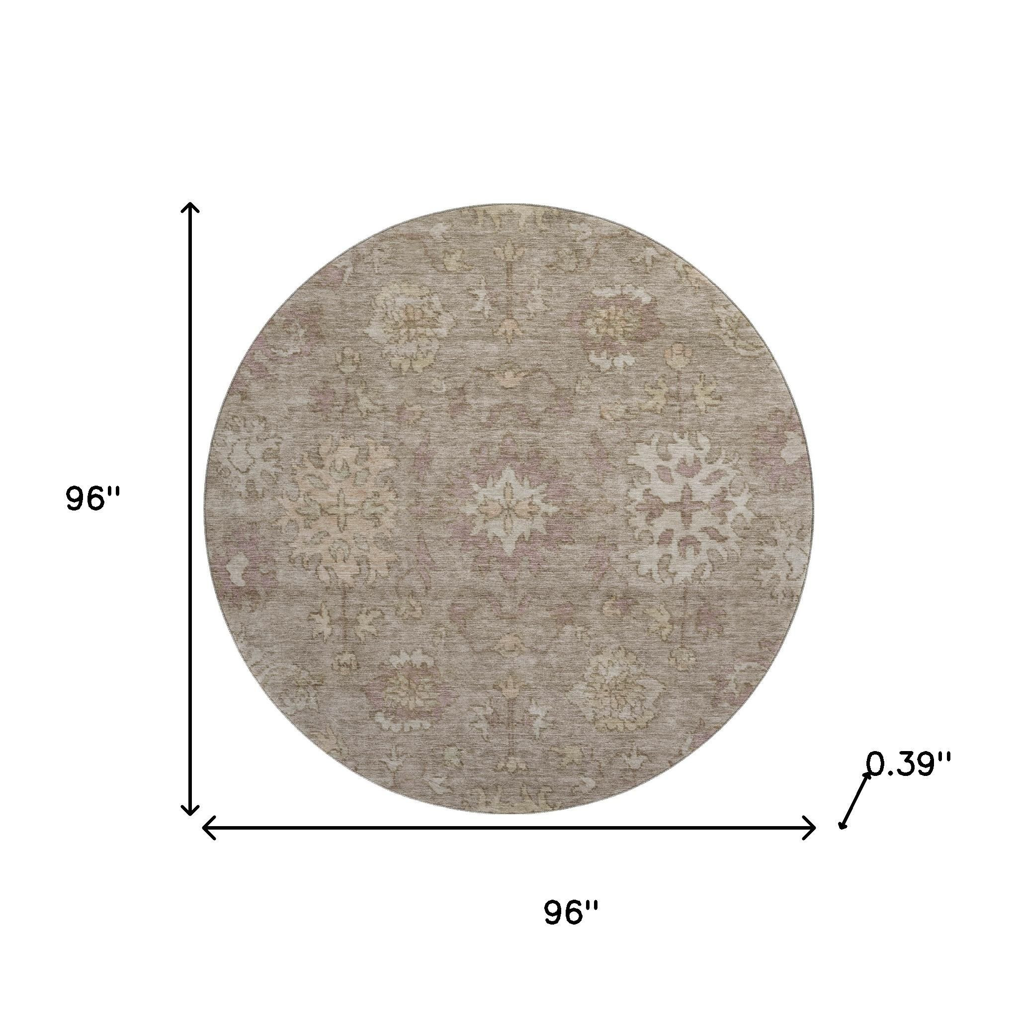 Set an inviting tone in your space with this 8-foot khaki and beige oriental washable round rug with uv protection. Ideal for spaces with kids and pets, this rug is stain resistant to help repel dirt and spilled liquids. Built to last, this rug crafted from polyester fibers is known for its durability and long lasting appeal. Rugs are a great way to showcase your style, hide imperfections, warm your home and reduce noise. This larger sized, traditional styled rug is ready to create a focal point or statement piece in your room. 96.00-inch h x 96.00-inch w x 0.39-inch d.