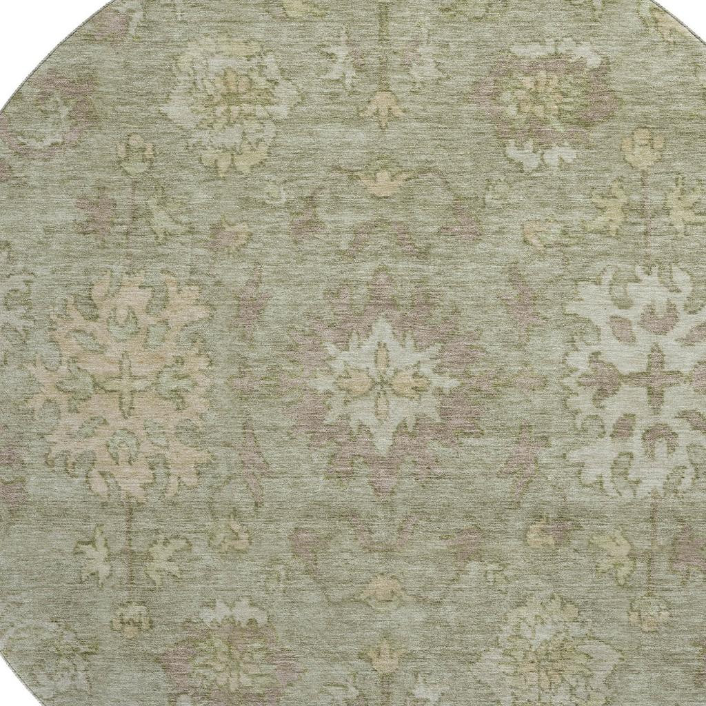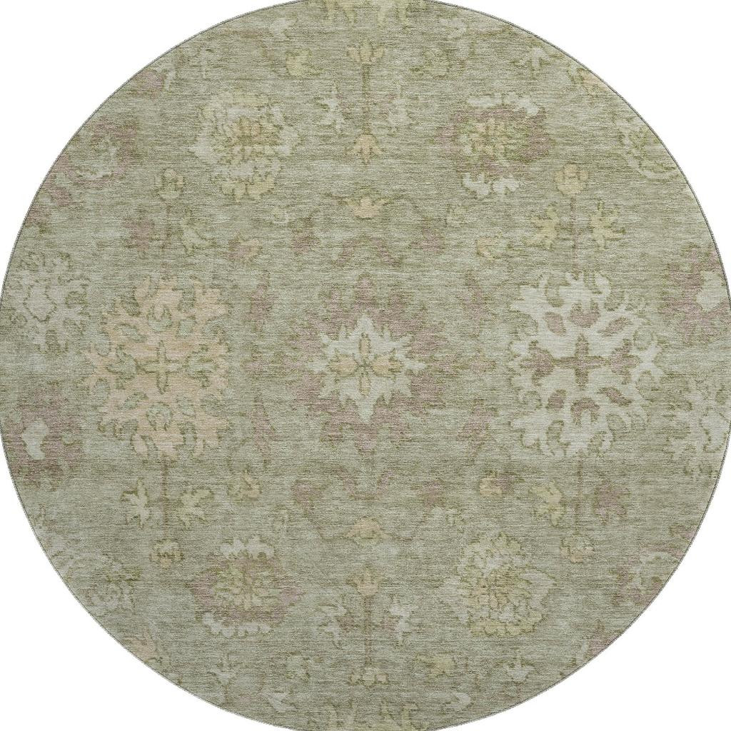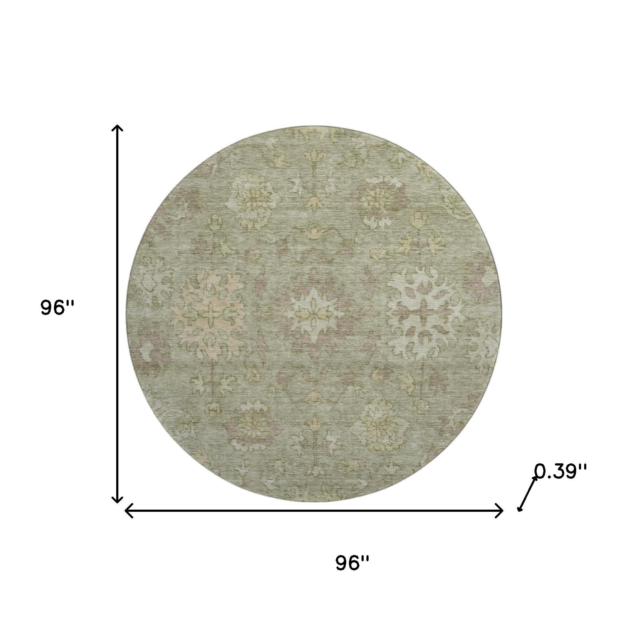 Add some artistry to your room with this 8-foot sage and beige oriental washable round rug with uv protection. Ideal for spaces with kids and pets, this rug is stain resistant to help repel dirt and spilled liquids. Built to last, this rug crafted from polyester fibers is known for its durability and long lasting appeal. Rugs are a great way to showcase your style, hide imperfections, warm your home and reduce noise. This larger sized, traditional styled rug is ready to create a focal point or statement piece in your room. 96.00-inch h x 96.00-inch w x 0.39-inch d.