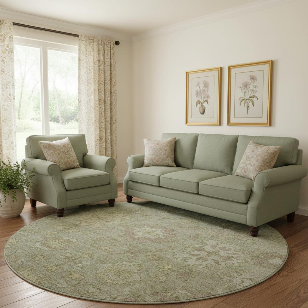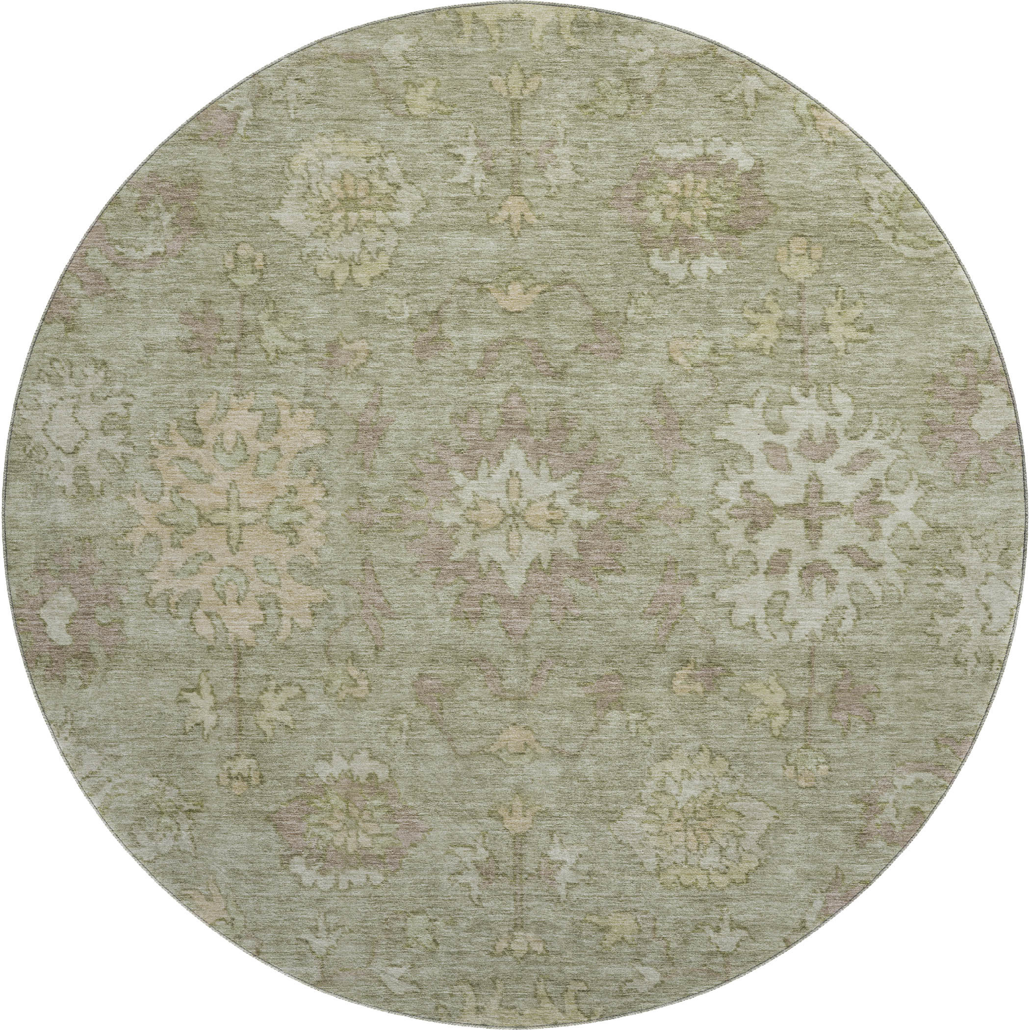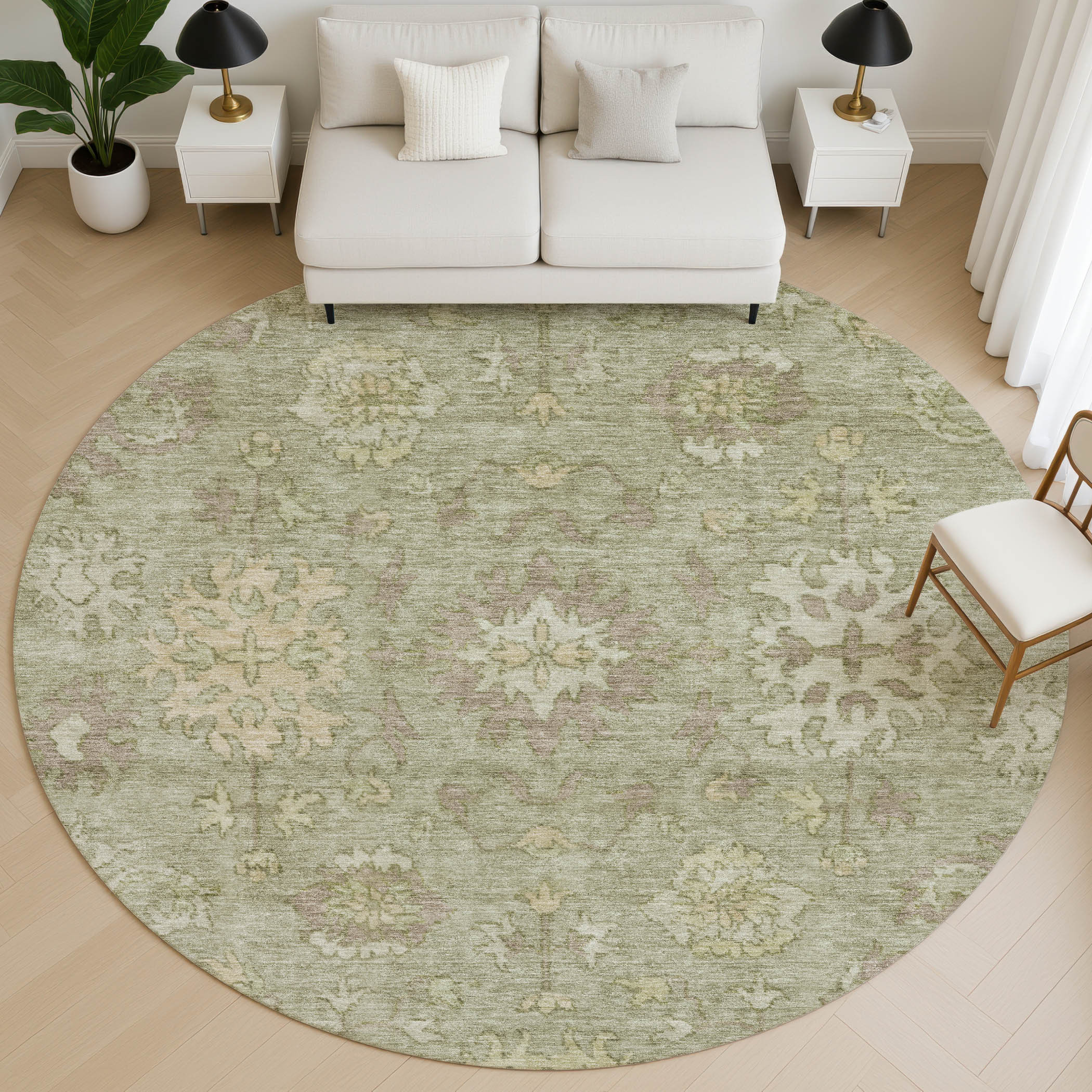 Add some artistry to your room with this 8-foot sage and beige oriental washable round rug with uv protection. Ideal for spaces with kids and pets, this rug is stain resistant to help repel dirt and spilled liquids. Built to last, this rug crafted from polyester fibers is known for its durability and long lasting appeal. Rugs are a great way to showcase your style, hide imperfections, warm your home and reduce noise. This larger sized, traditional styled rug is ready to create a focal point or statement piece in your room. 96.00-inch h x 96.00-inch w x 0.39-inch d.