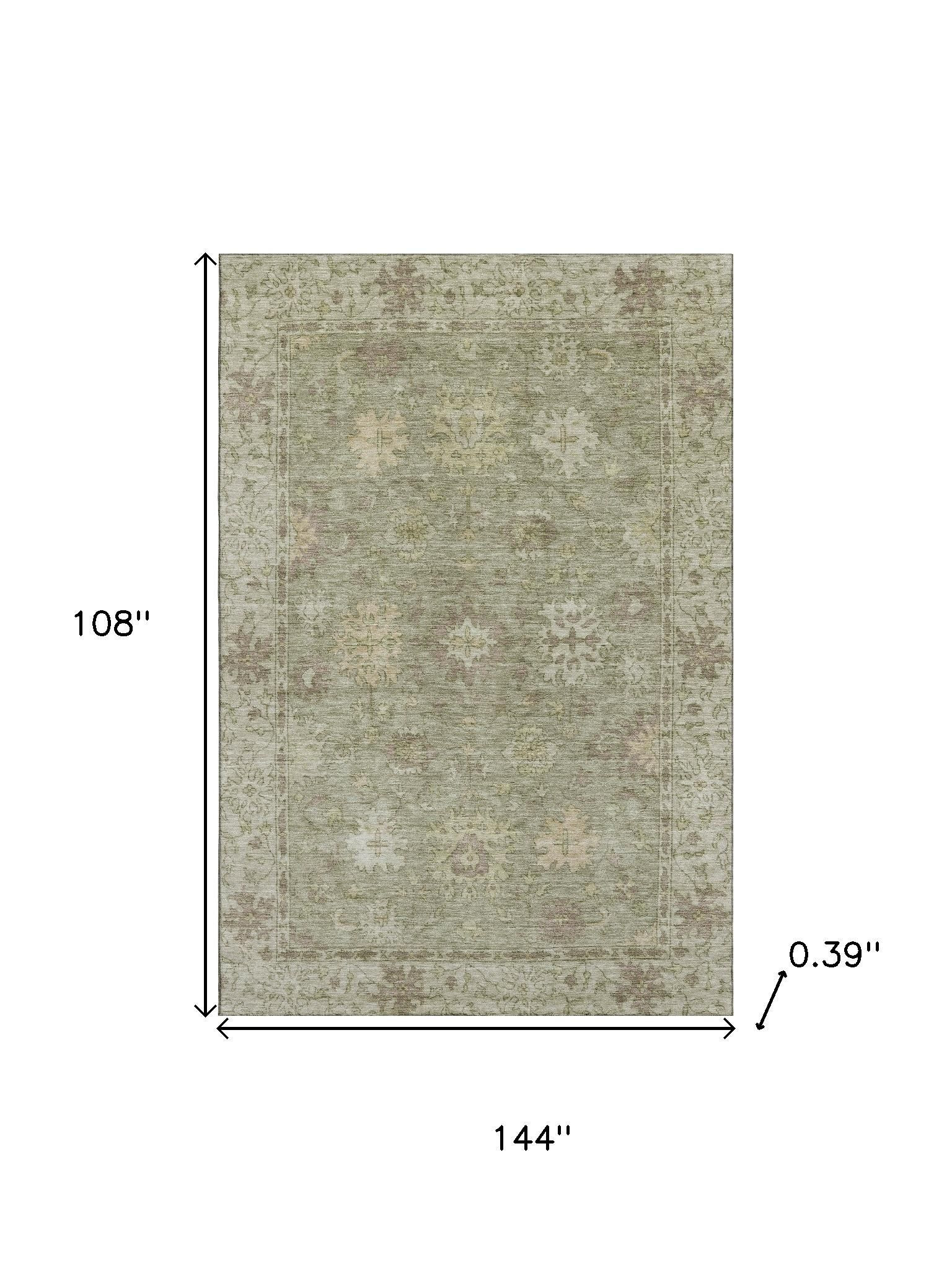 This 9-foot x 12-foot sage and beige oriental washable area rug with uv protection, is a great way to add warmth to a room. Ideal for spaces with kids and pets, this rug is stain resistant to help repel dirt and spilled liquids. Built to last, this rug crafted from polyester fibers is known for its durability and long lasting appeal. Rugs are a great way to showcase your style, hide imperfections, warm your home and reduce noise. This larger sized, traditional styled rug is ready to create a focal point or statement piece in your room. 108.00-inch h x 144.00-inch w x 0.39-inch d.
