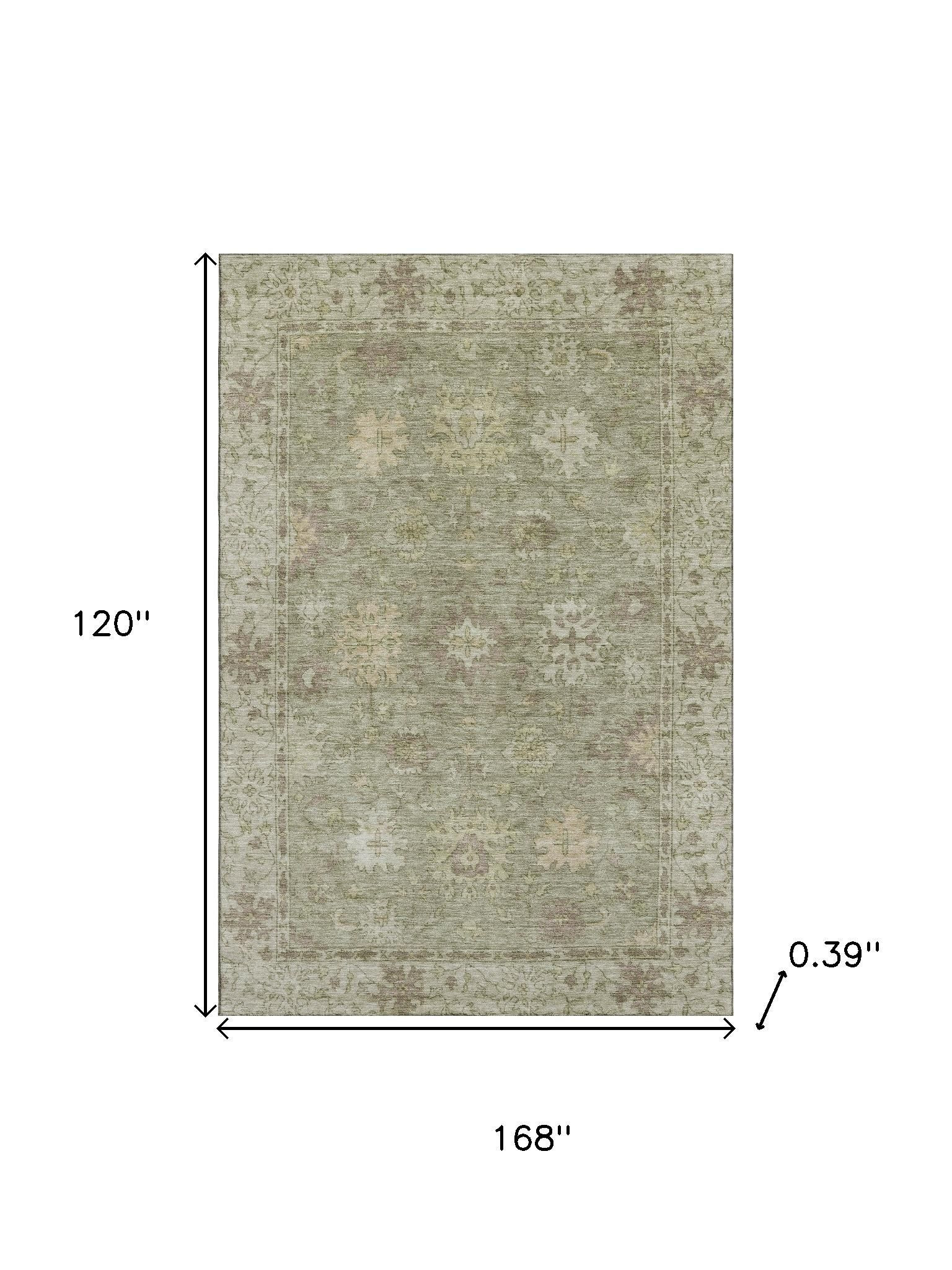 Add great coloration and comfortable texture to your space with this 10-foot x 14-foot sage and beige oriental washable area rug with uv protection. Ideal for spaces with kids and pets, this rug is stain resistant to help repel dirt and spilled liquids. Built to last, this rug crafted from polyester fibers is known for its durability and long lasting appeal. Rugs are a great way to showcase your style, hide imperfections, warm your home and reduce noise. This larger sized, traditional styled rug is ready to create a focal point or statement piece in your room. 120.00-inch h x 168.00-inch w x 0.39-inch d.
