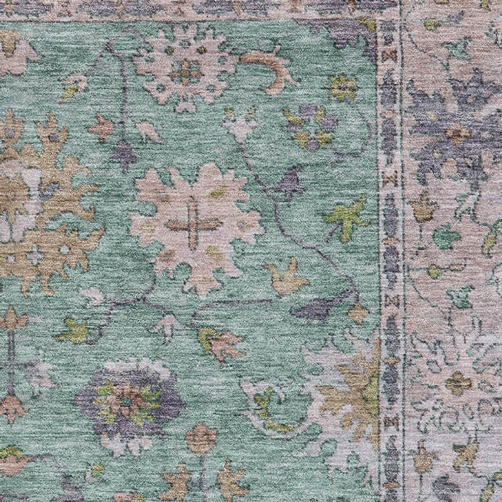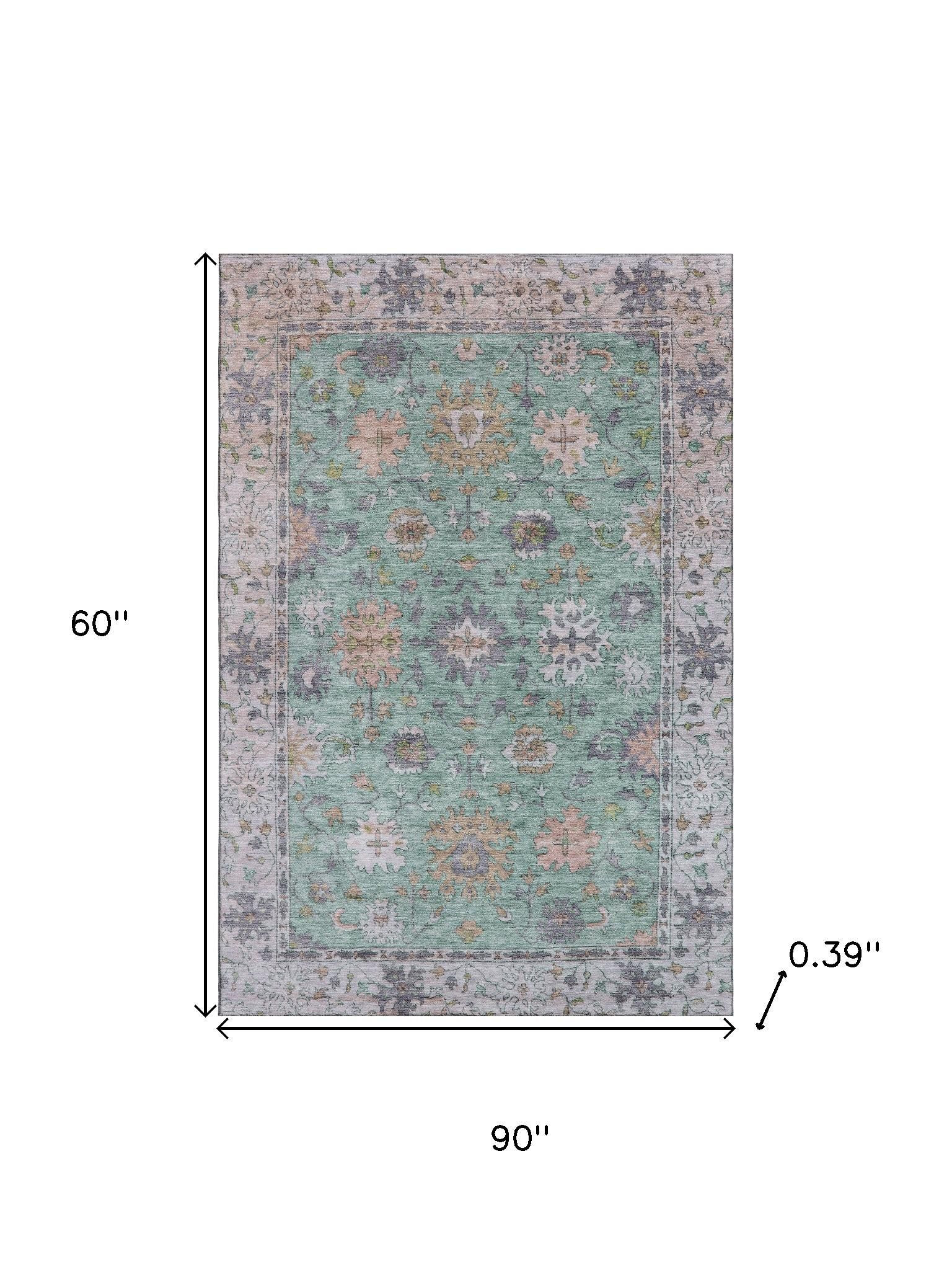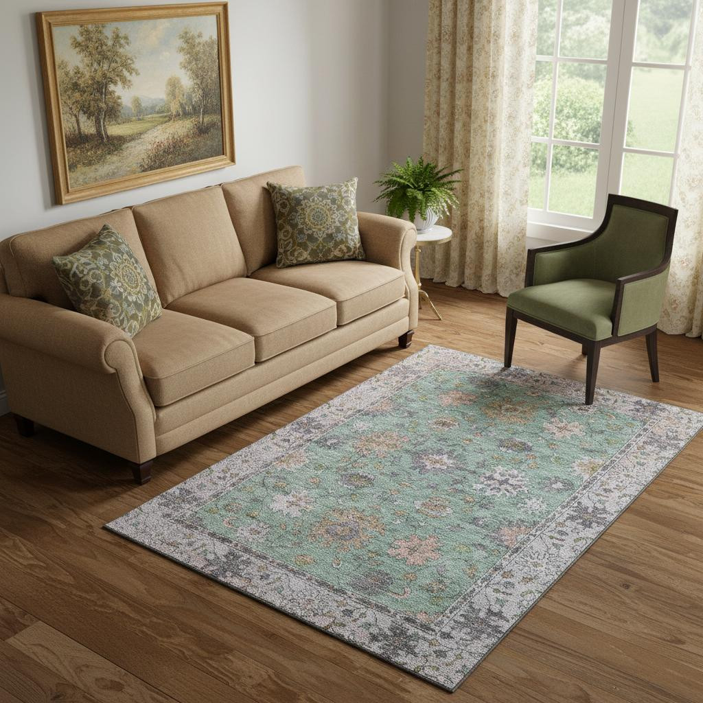 Add some artistry to your room with this 5-foot x 8-foot mint green and peach oriental washable area rug with uv protection. Ideal for spaces with kids and pets, this rug is stain resistant to help repel dirt and spilled liquids. Built to last, this rug crafted from polyester fibers is known for its durability and long lasting appeal. Rugs are a great way to showcase your style, hide imperfections, warm your home and reduce noise. This larger sized, traditional styled rug is ready to create a focal point or statement piece in your room. 60.00-inch h x 90.00-inch w x 0.39-inch d.
