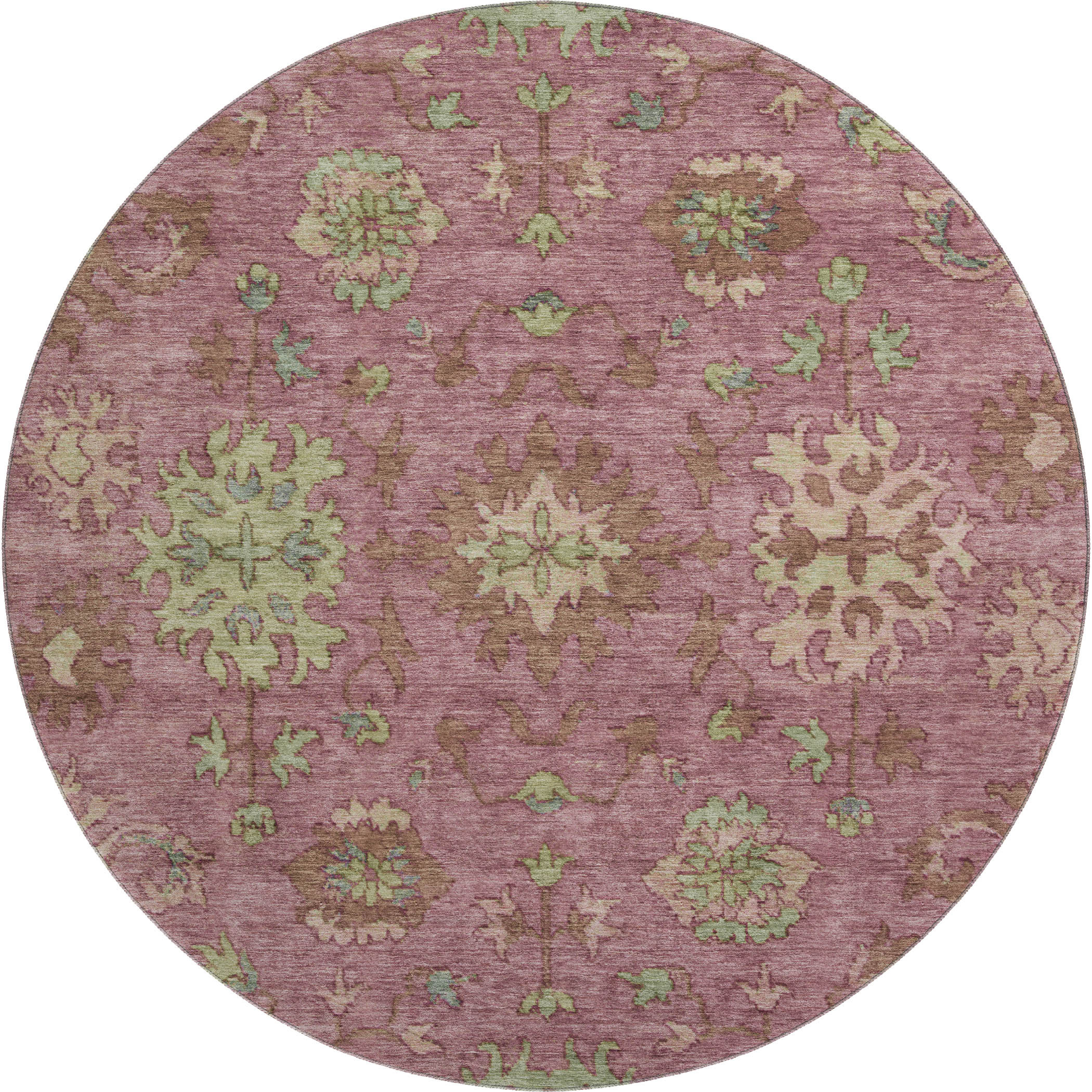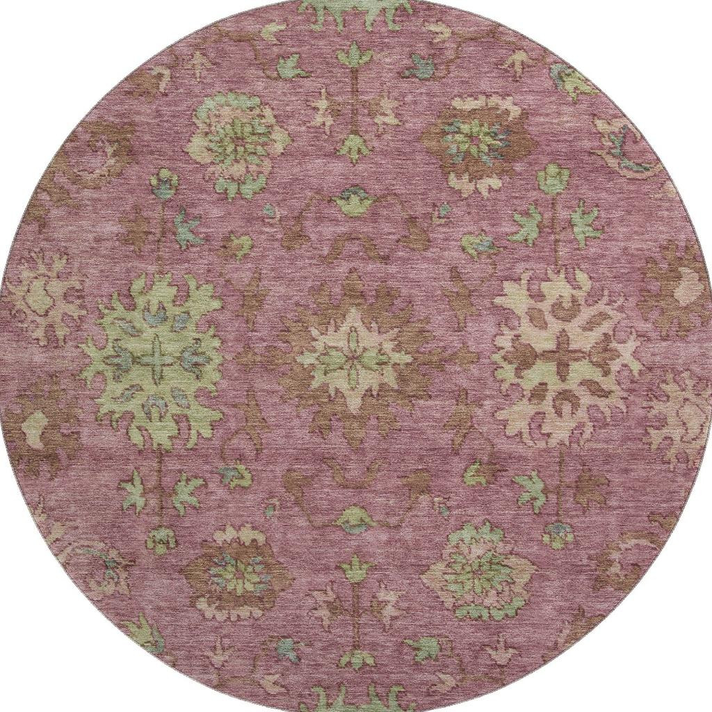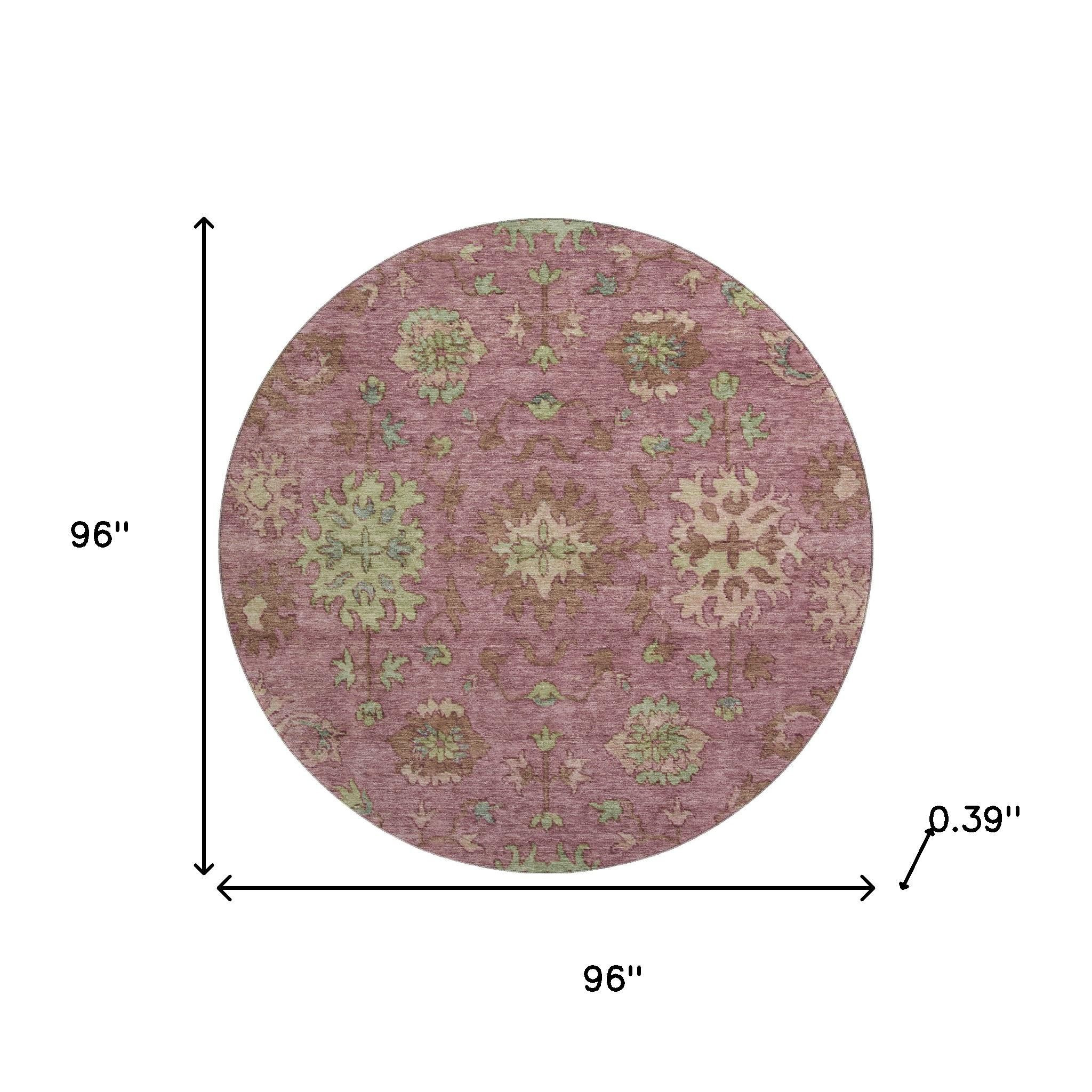 This 8-foot pink and beige oriental washable round rug with uv protection, is a great way to add warmth to a room. Ideal for spaces with kids and pets, this rug is stain resistant to help repel dirt and spilled liquids. Built to last, this rug crafted from polyester fibers is known for its durability and long lasting appeal. Rugs are a great way to showcase your style, hide imperfections, warm your home and reduce noise. This larger sized, traditional styled rug is ready to create a focal point or statement piece in your room. 96.00-inch h x 96.00-inch w x 0.39-inch d.