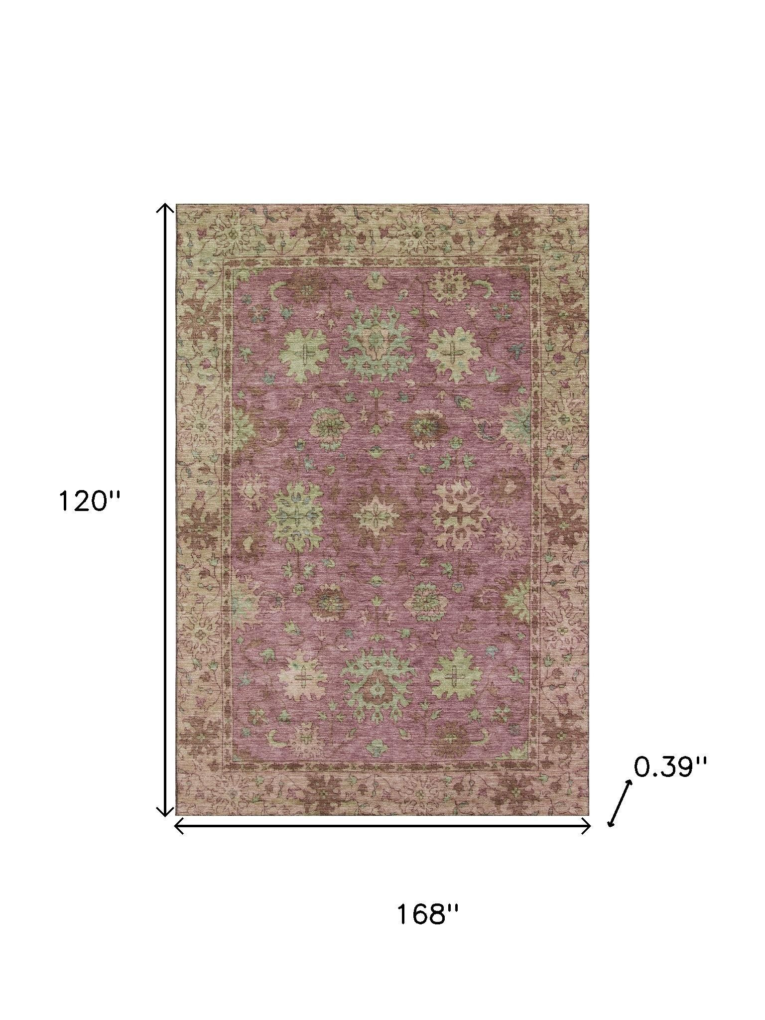 Add some artistry to your room with this 10-foot x 14-foot pink and beige oriental washable area rug with uv protection. Ideal for spaces with kids and pets, this rug is stain resistant to help repel dirt and spilled liquids. Built to last, this rug crafted from polyester fibers is known for its durability and long lasting appeal. Rugs are a great way to showcase your style, hide imperfections, warm your home and reduce noise. This larger sized, traditional styled rug is ready to create a focal point or statement piece in your room. 120.00-inch h x 168.00-inch w x 0.39-inch d.