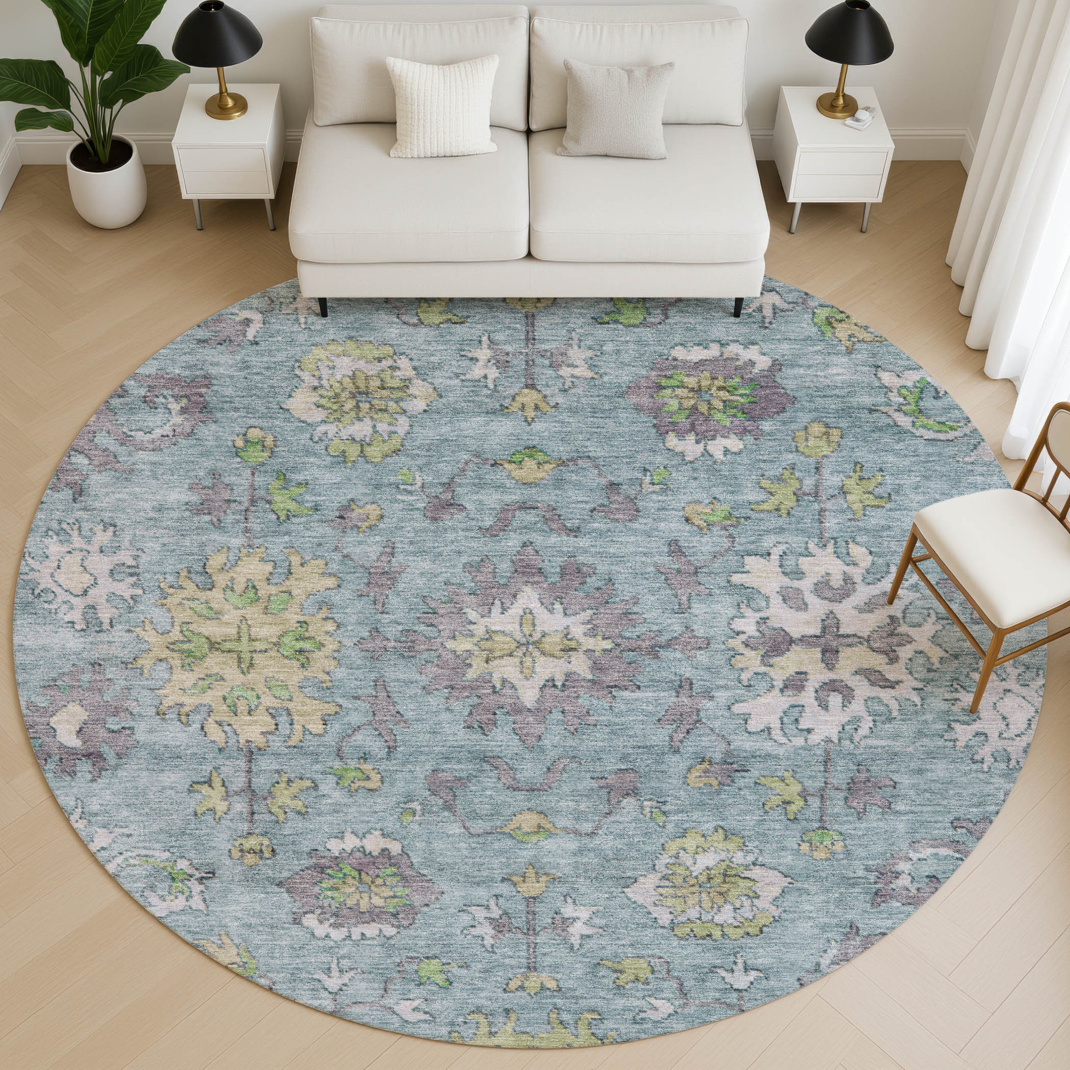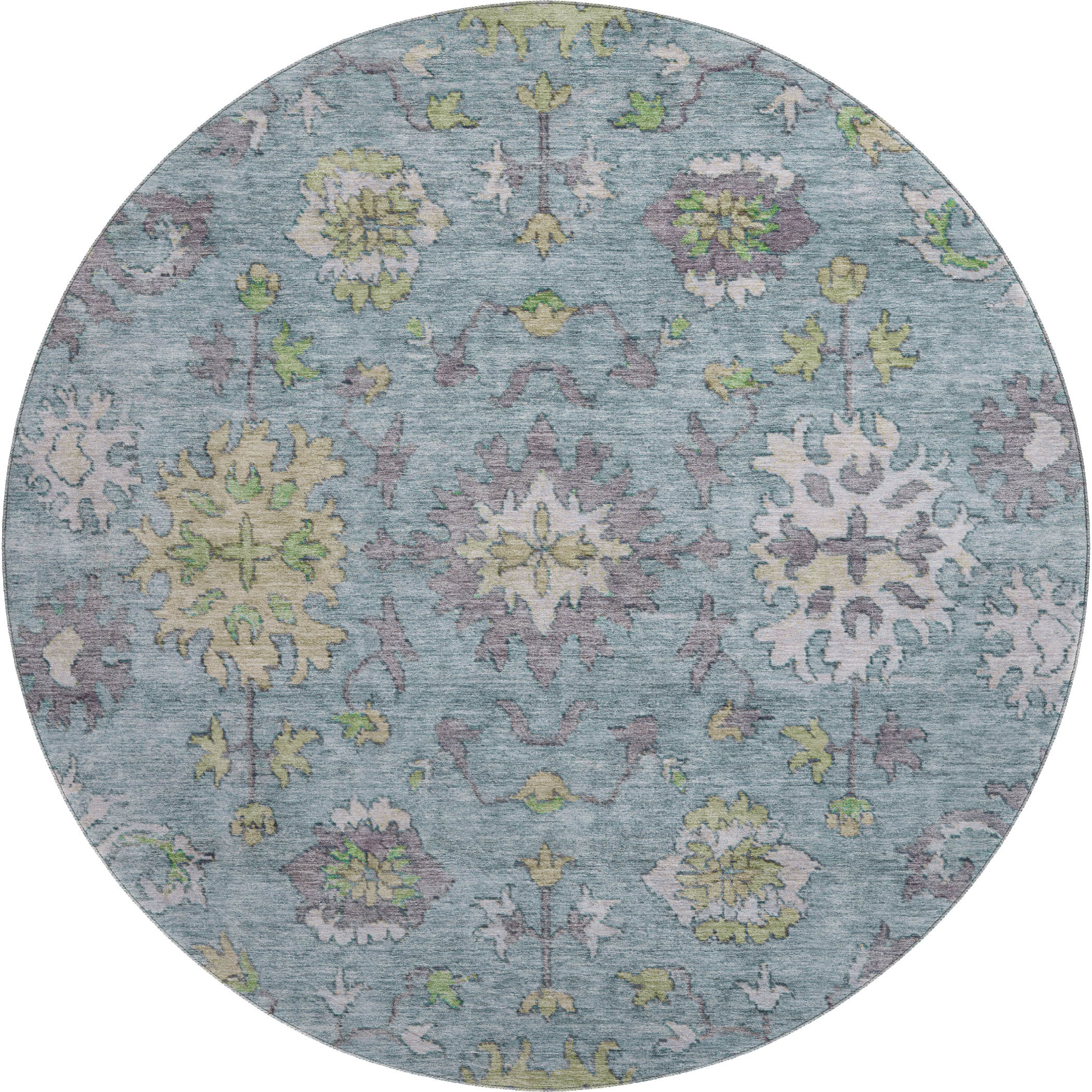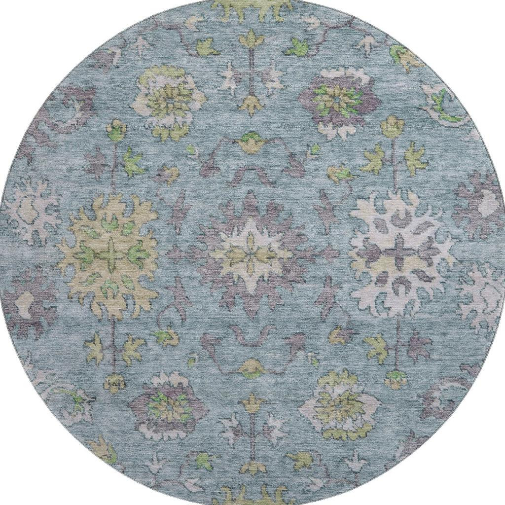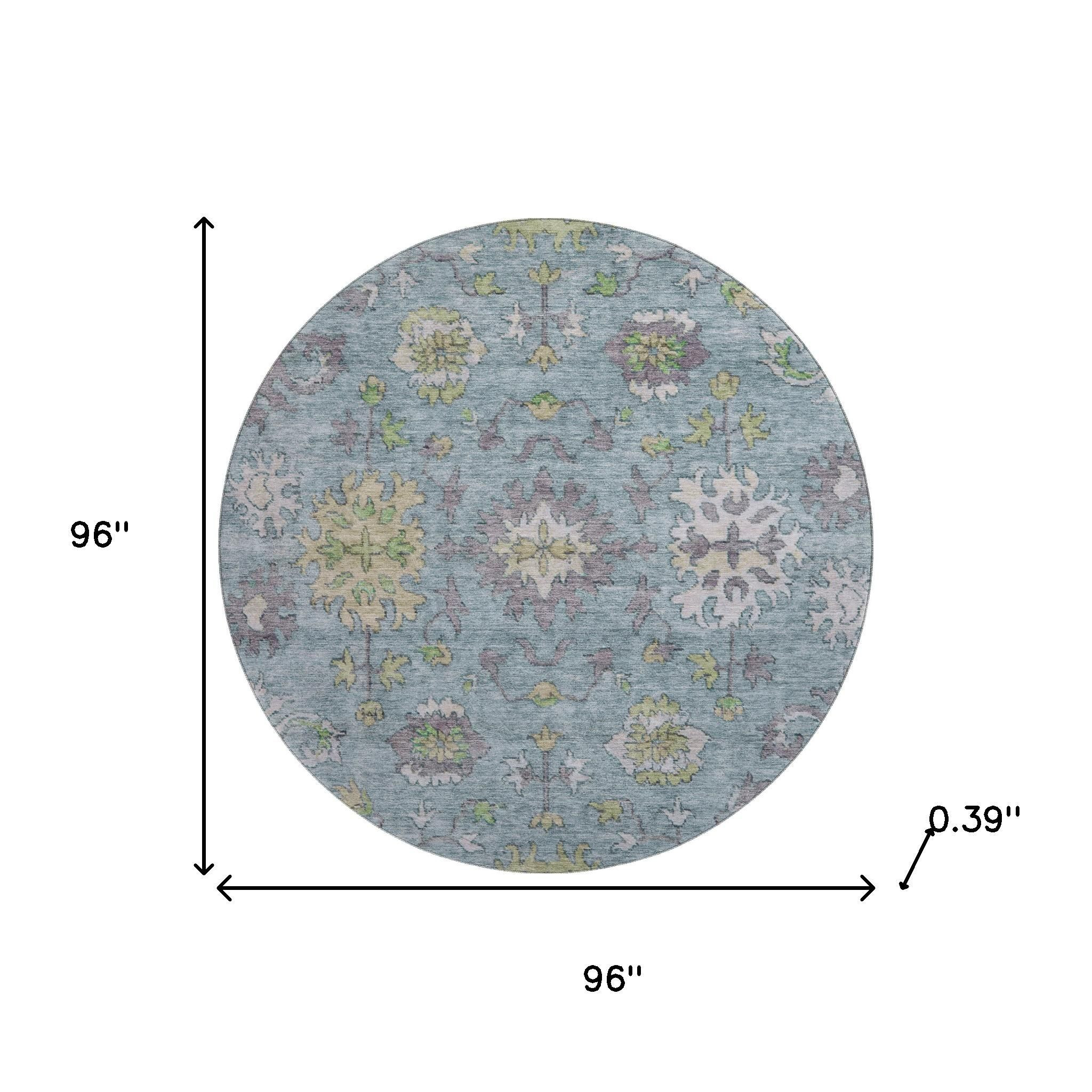 This 8-foot pale aqua and teal oriental washable round rug with uv protection, is a great way to add warmth to a room. Ideal for spaces with kids and pets, this rug is stain resistant to help repel dirt and spilled liquids. Built to last, this rug crafted from polyester fibers is known for its durability and long lasting appeal. Rugs are a great way to showcase your style, hide imperfections, warm your home and reduce noise. This larger sized, traditional styled rug is ready to create a focal point or statement piece in your room. 96.00-inch h x 96.00-inch w x 0.39-inch d.