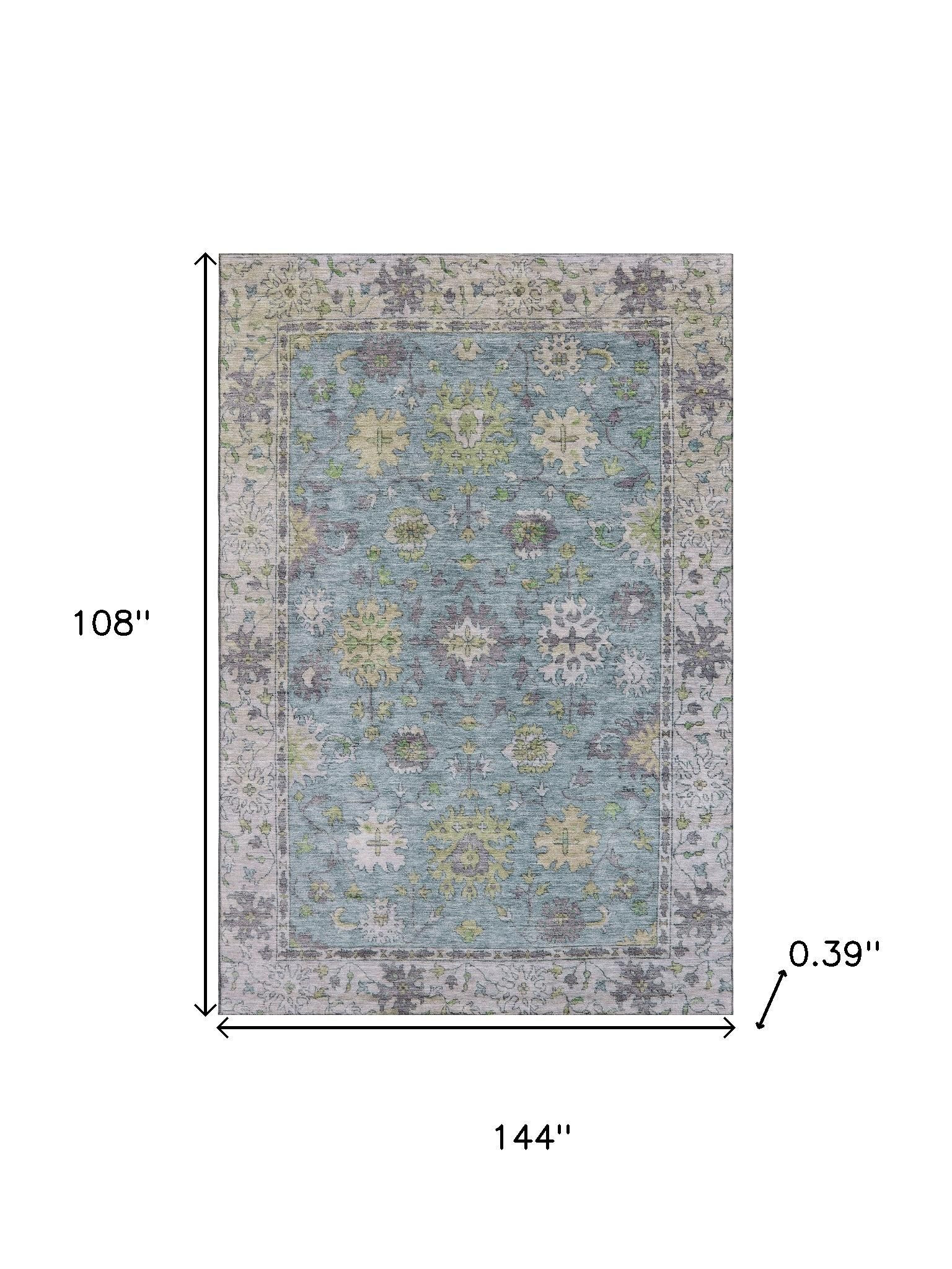 Set an inviting tone in your space with this 9-foot x 12-foot pale aqua and teal oriental washable area rug with uv protection. Ideal for spaces with kids and pets, this rug is stain resistant to help repel dirt and spilled liquids. Built to last, this rug crafted from polyester fibers is known for its durability and long lasting appeal. Rugs are a great way to showcase your style, hide imperfections, warm your home and reduce noise. This larger sized, traditional styled rug is ready to create a focal point or statement piece in your room. 108.00-inch h x 144.00-inch w x 0.39-inch d.