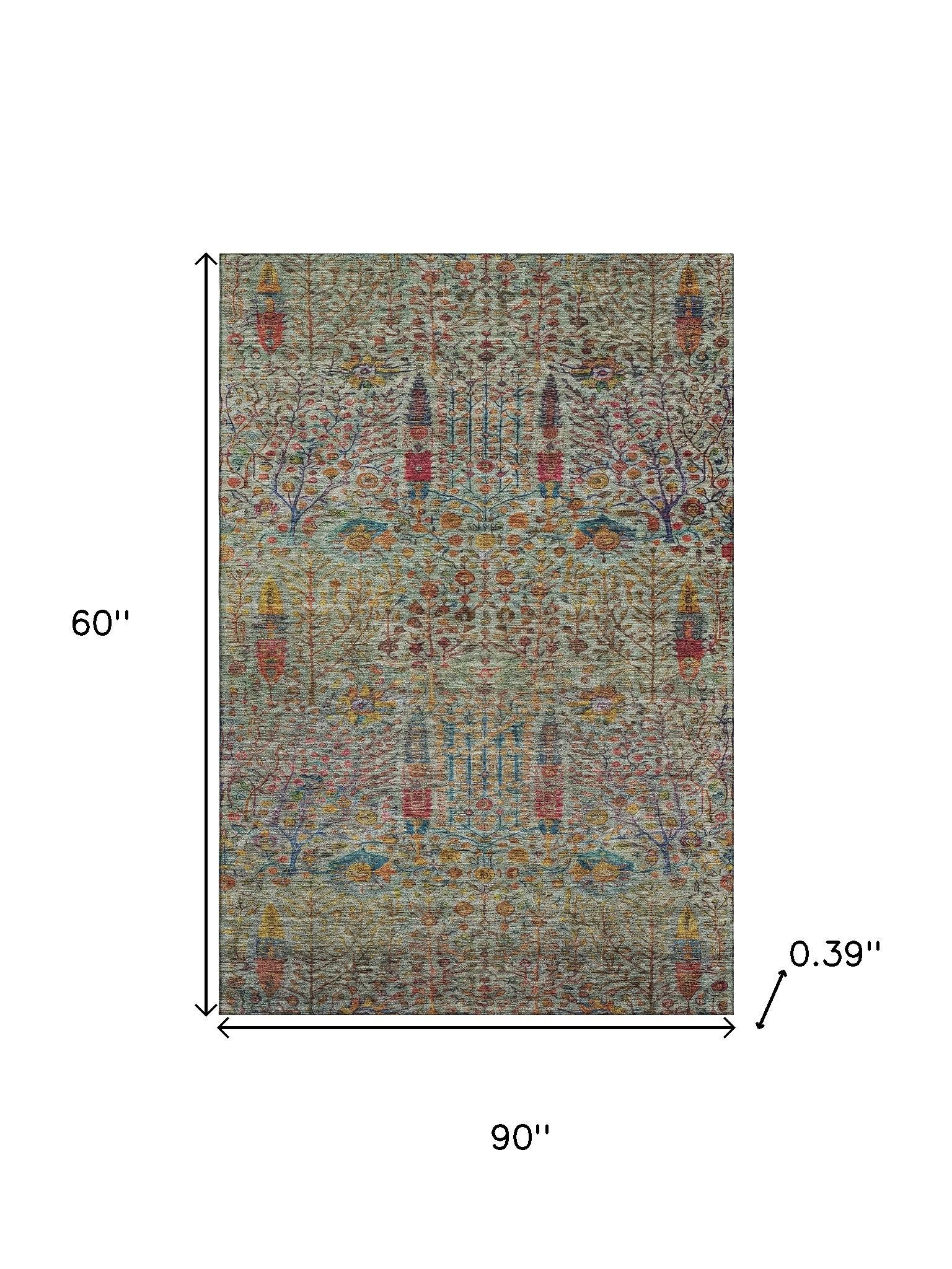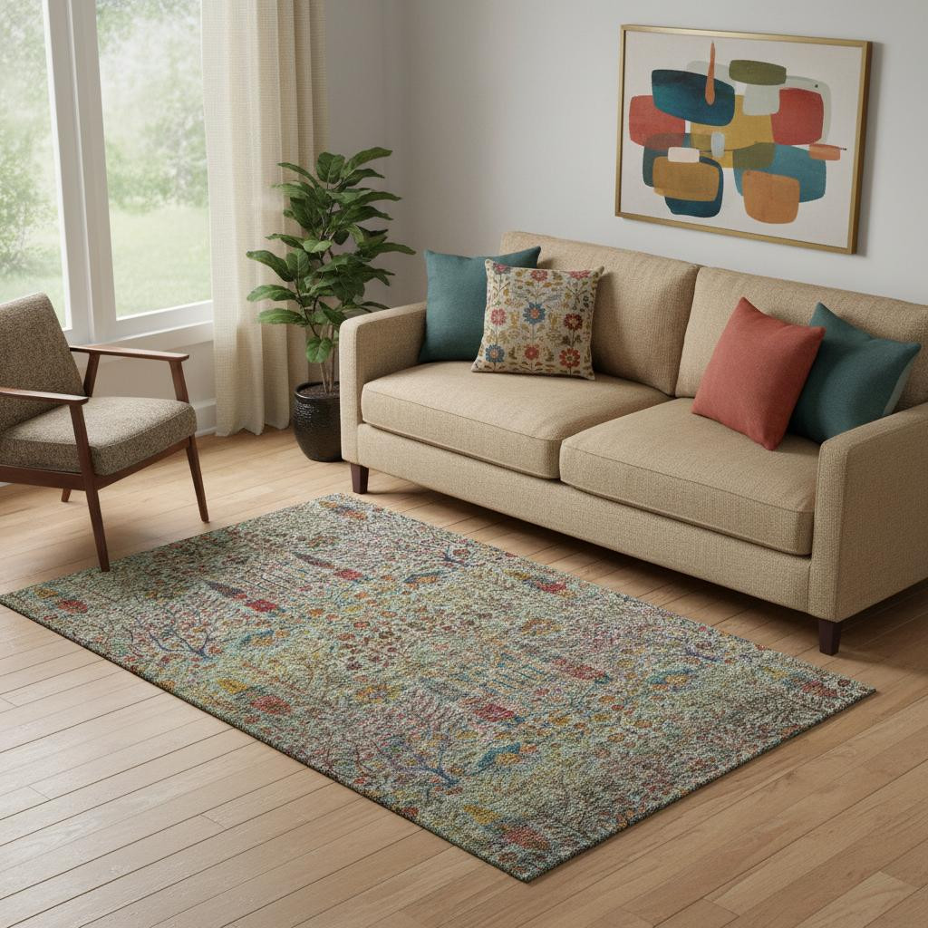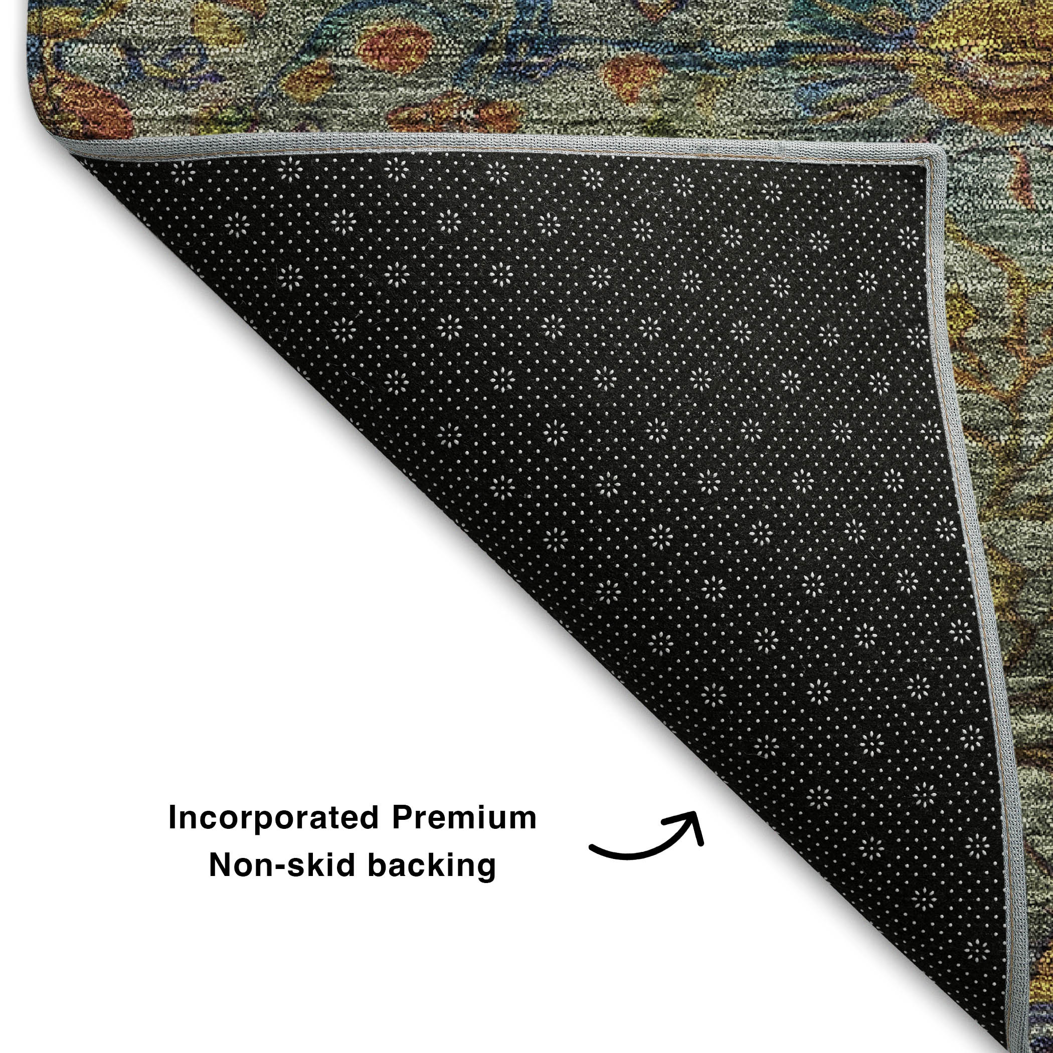 This 5-foot x 8-foot green and red floral vines washable area rug with uv protection, is a great way to add warmth to a room. Ideal for spaces with kids and pets, this rug is stain resistant to help repel dirt and spilled liquids. Built to last, this rug crafted from polyester fibers is known for its durability and long lasting appeal. Rugs are a great way to showcase your style, hide imperfections, warm your home and reduce noise. This larger sized, transitional styled rug is ready to create a focal point or statement piece in your room. 60.00-inch h x 90.00-inch w x 0.39-inch d.