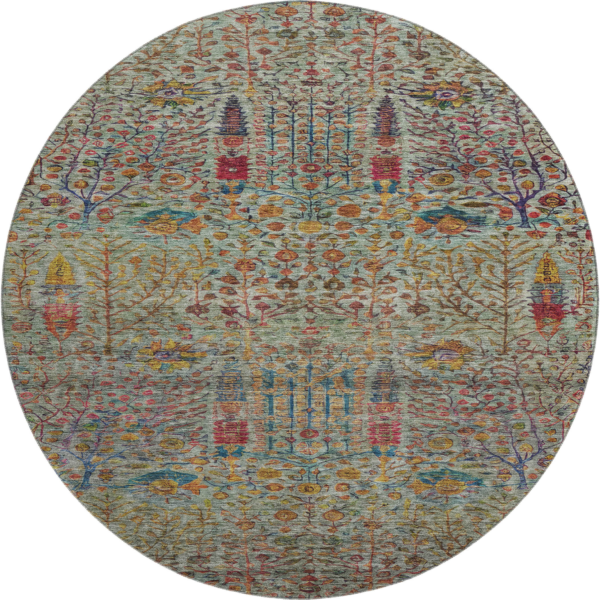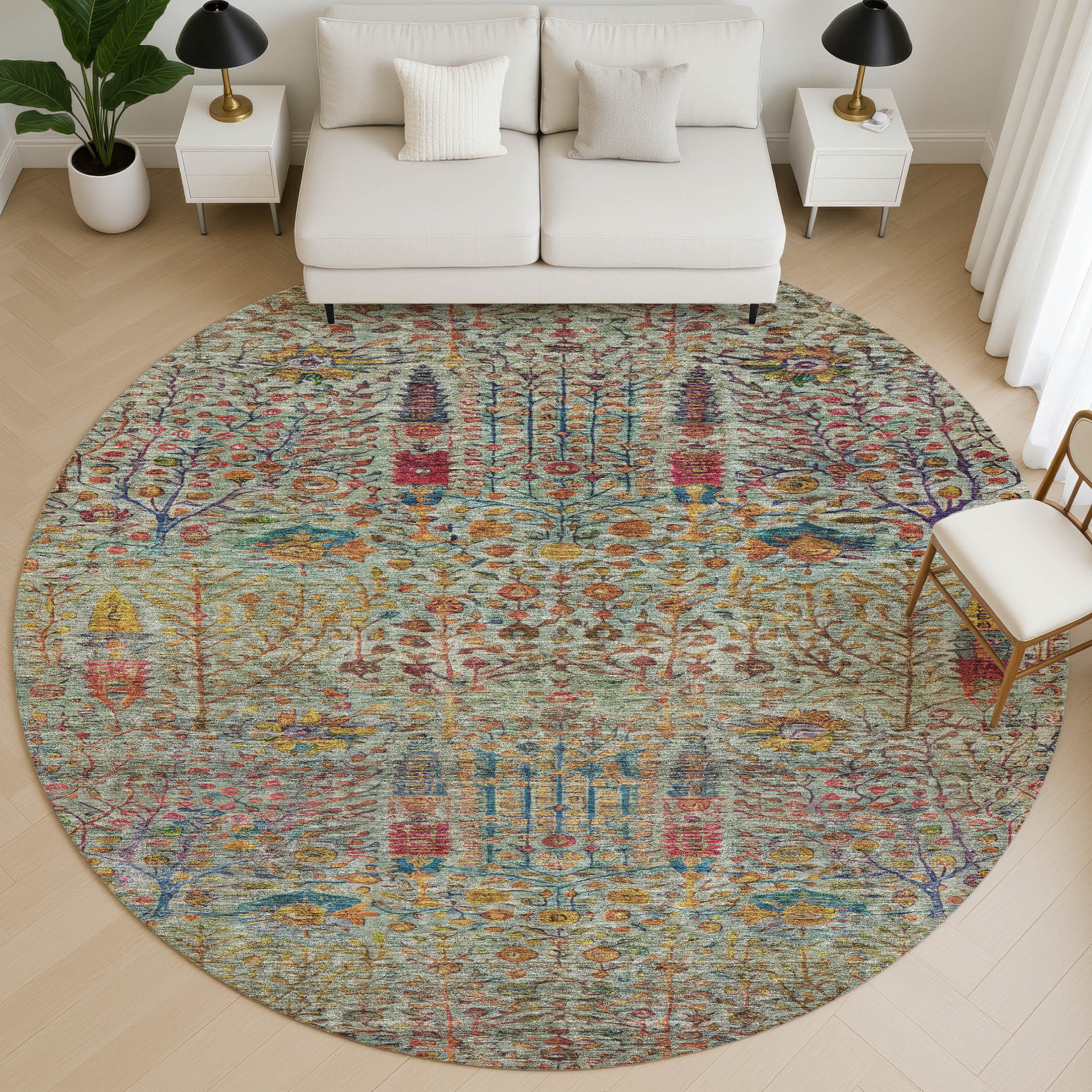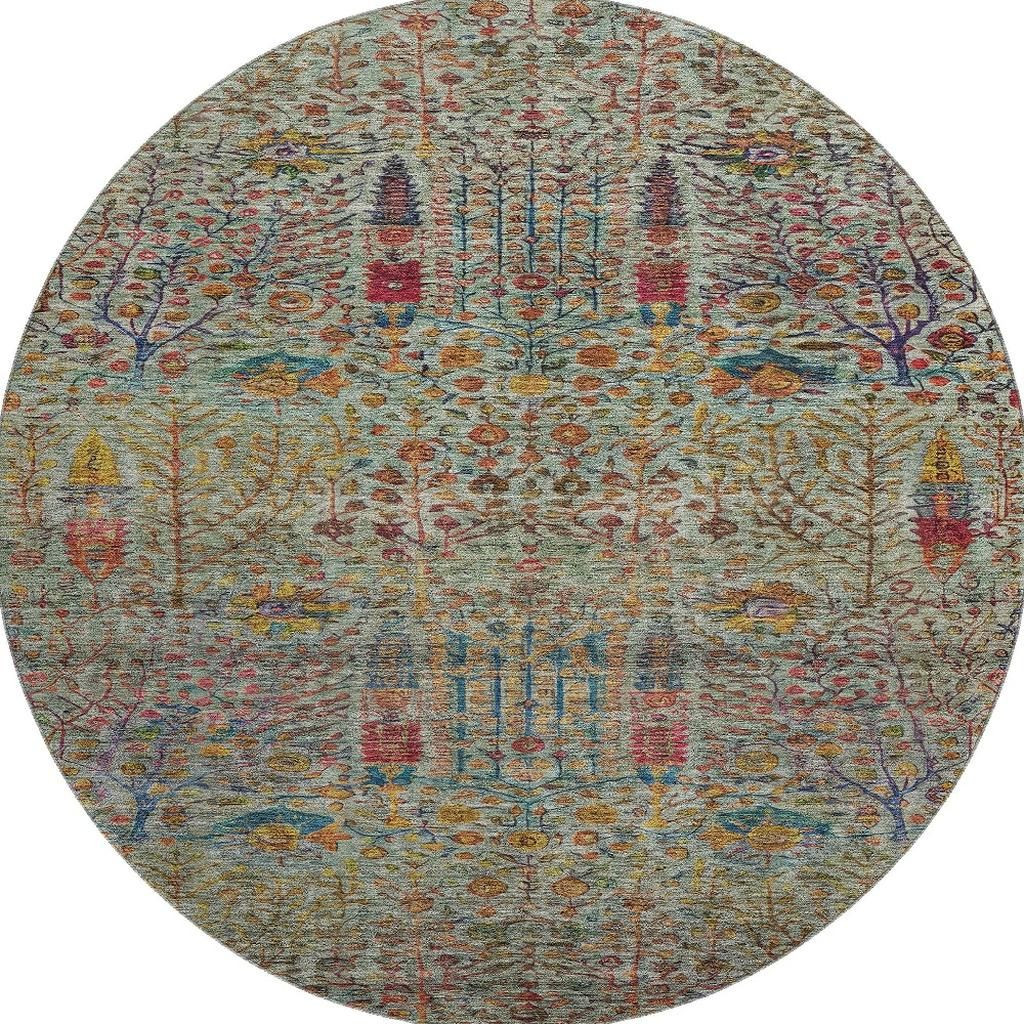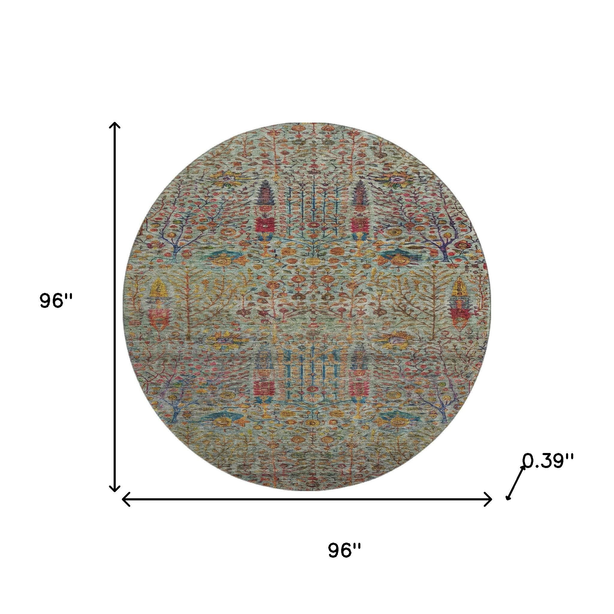Add great coloration and comfortable texture to your space with this 8-foot green and red floral vines washable round rug with uv protection. Ideal for spaces with kids and pets, this rug is stain resistant to help repel dirt and spilled liquids. Built to last, this rug crafted from polyester fibers is known for its durability and long lasting appeal. Rugs are a great way to showcase your style, hide imperfections, warm your home and reduce noise. This larger sized, transitional styled rug is ready to create a focal point or statement piece in your room. 96.00-inch h x 96.00-inch w x 0.39-inch d.
