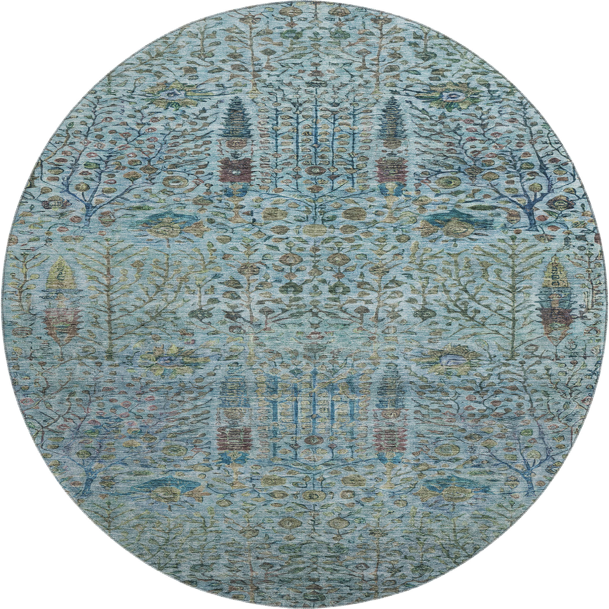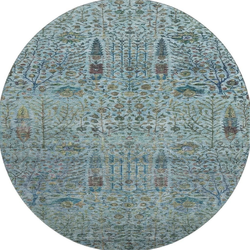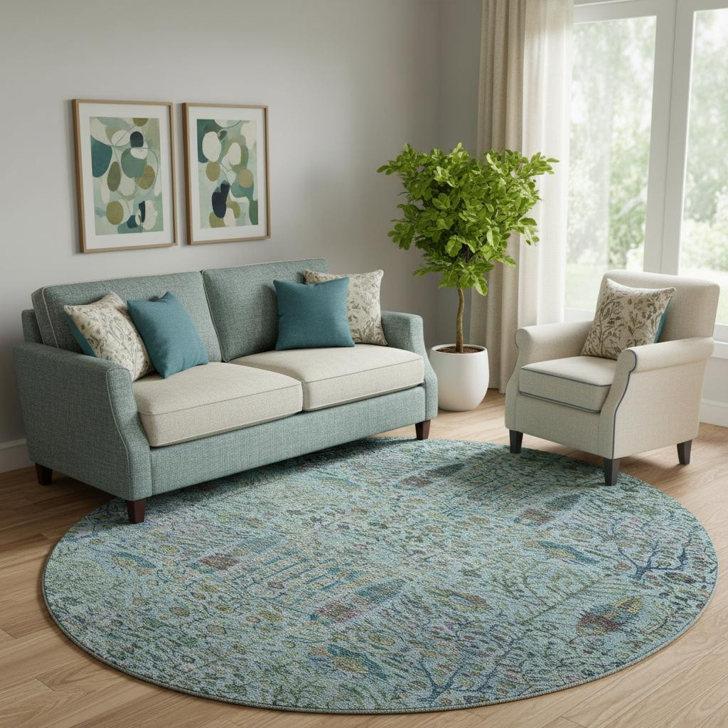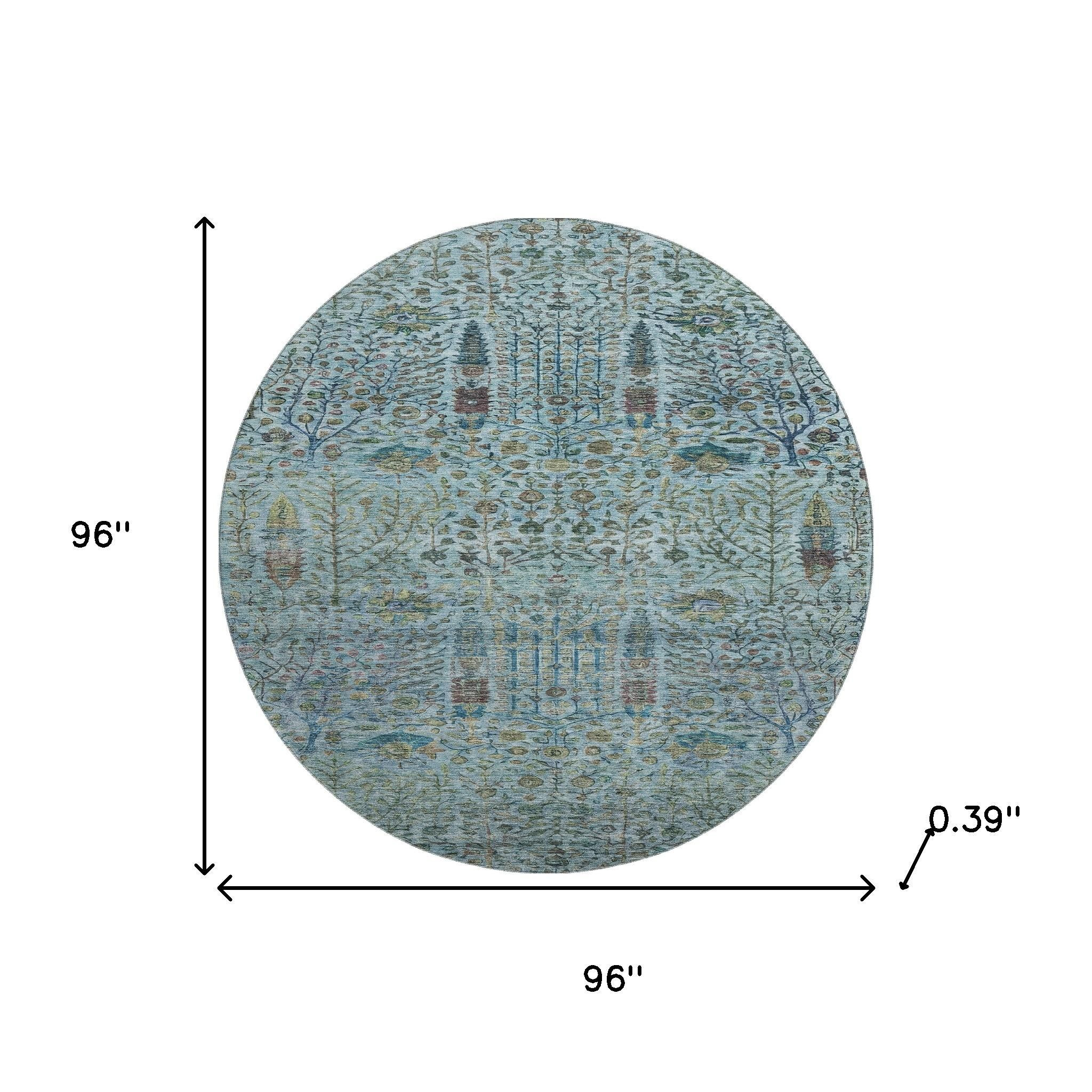 This 8-foot teal and pale aqua floral vines washable round rug with uv protection, is a great way to add warmth to a room. Ideal for spaces with kids and pets, this rug is stain resistant to help repel dirt and spilled liquids. Built to last, this rug crafted from polyester fibers is known for its durability and long lasting appeal. Rugs are a great way to showcase your style, hide imperfections, warm your home and reduce noise. This larger sized, transitional styled rug is ready to create a focal point or statement piece in your room. 96.00-inch h x 96.00-inch w x 0.39-inch d.