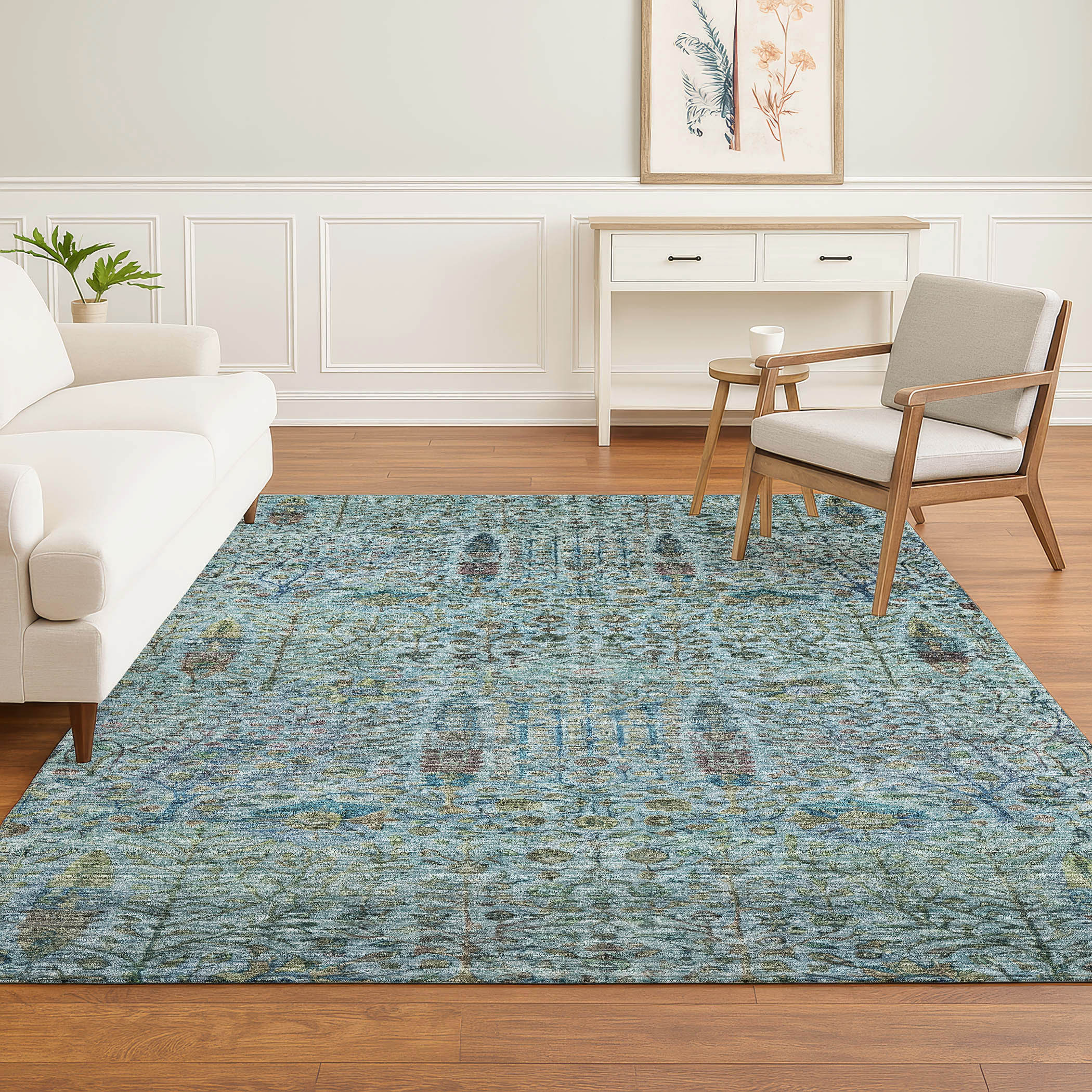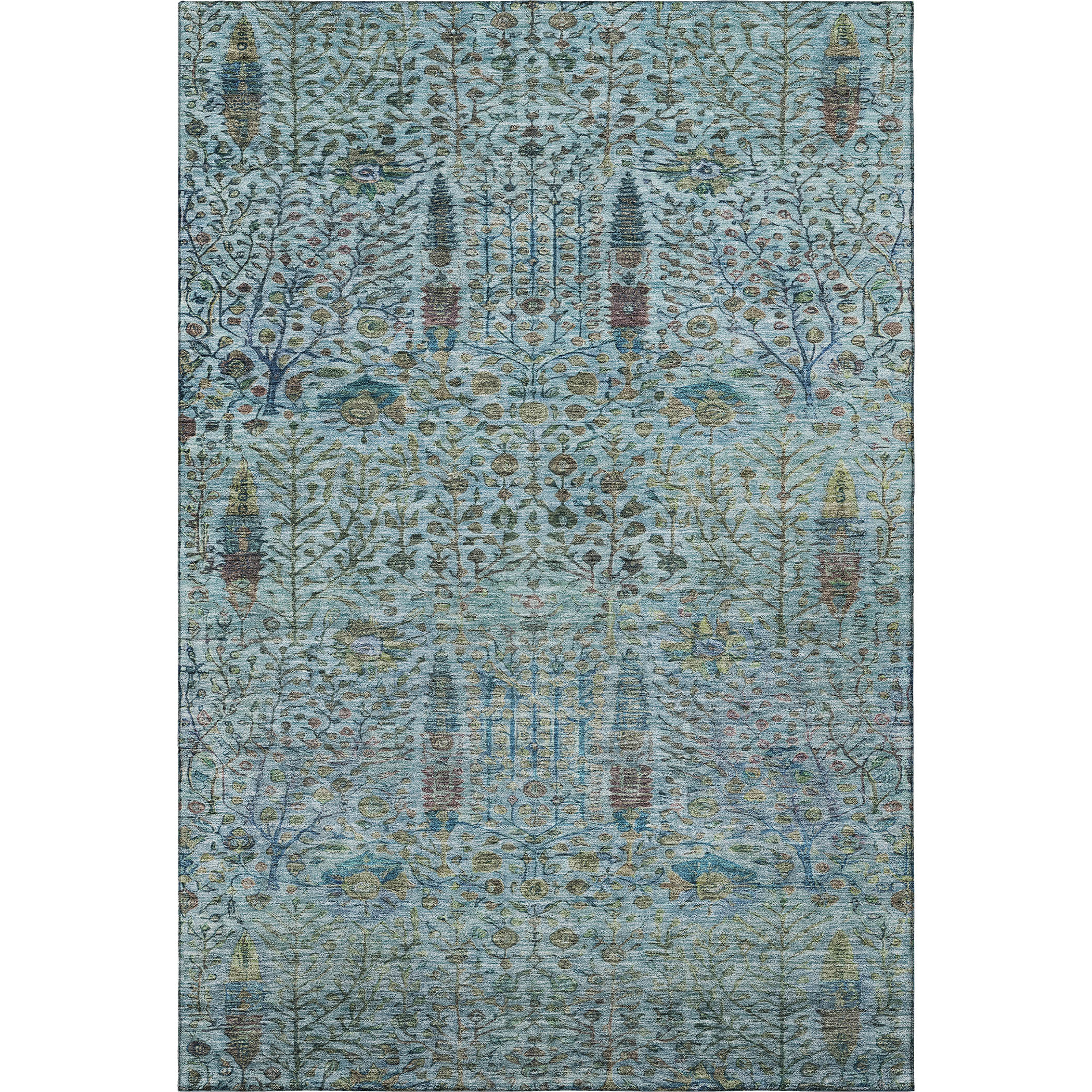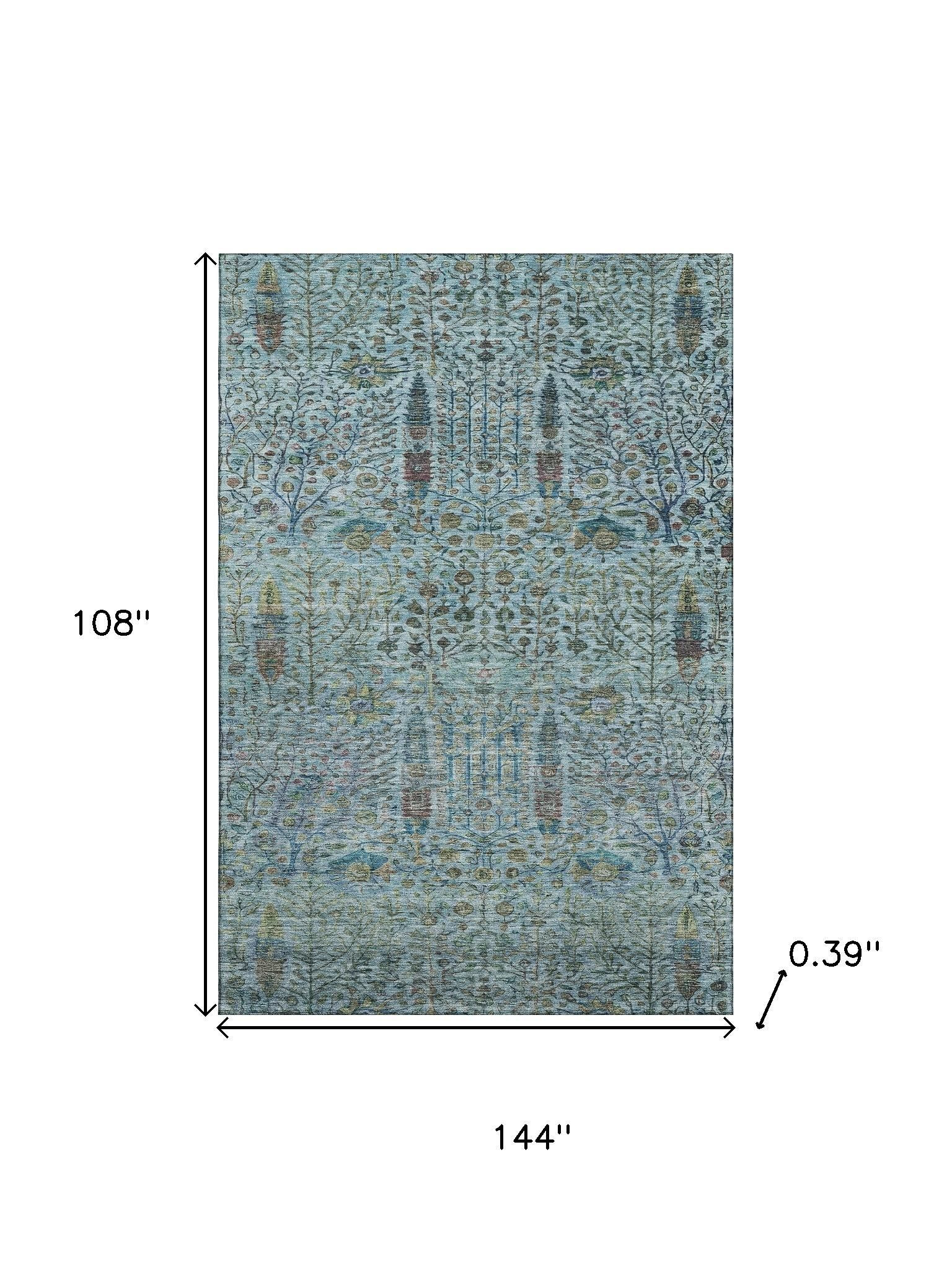 Set an inviting tone in your space with this 9-foot x 12-foot teal and pale aqua floral vines washable area rug with uv protection. Ideal for spaces with kids and pets, this rug is stain resistant to help repel dirt and spilled liquids. Built to last, this rug crafted from polyester fibers is known for its durability and long lasting appeal. Rugs are a great way to showcase your style, hide imperfections, warm your home and reduce noise. This larger sized, transitional styled rug is ready to create a focal point or statement piece in your room. 108.00-inch h x 144.00-inch w x 0.39-inch d.