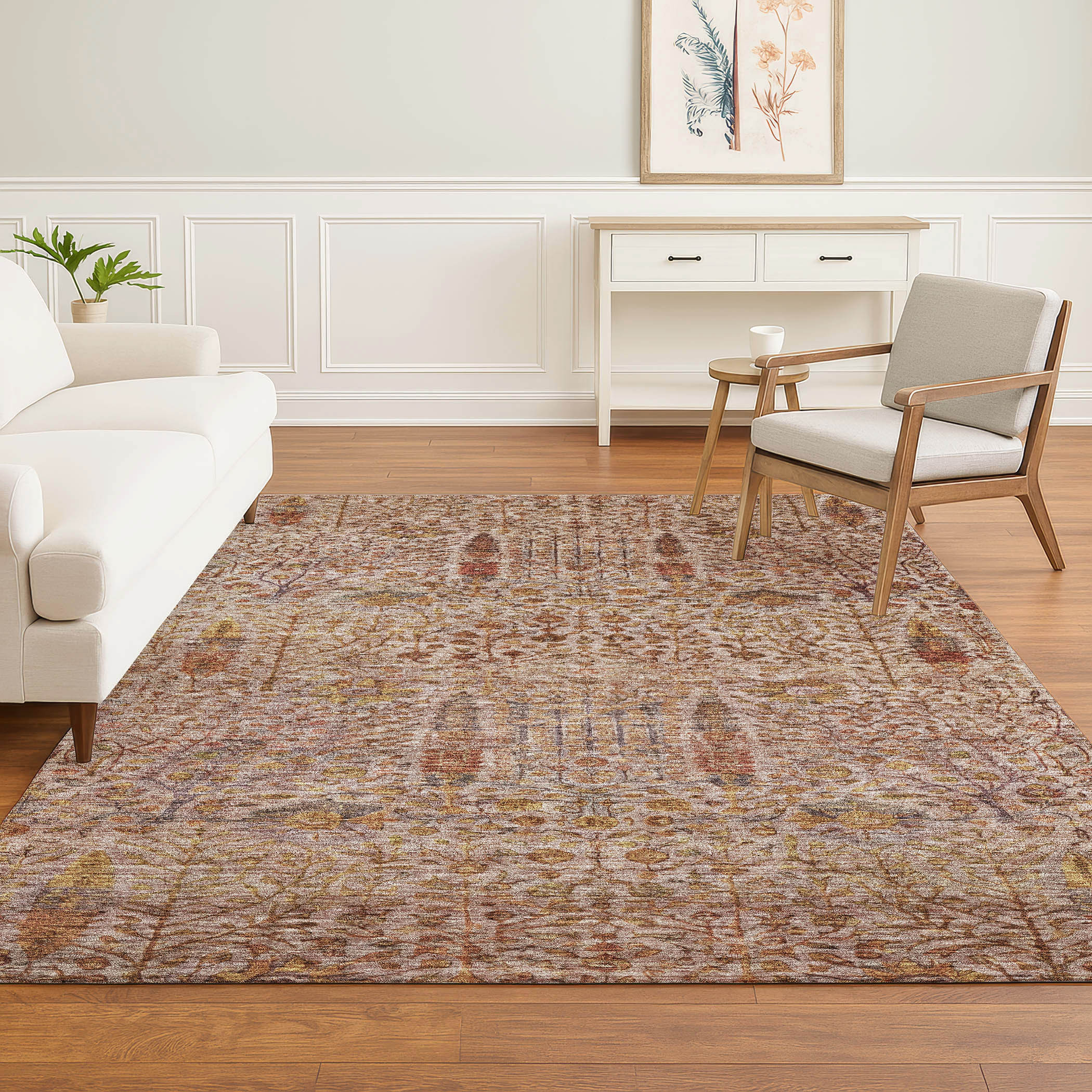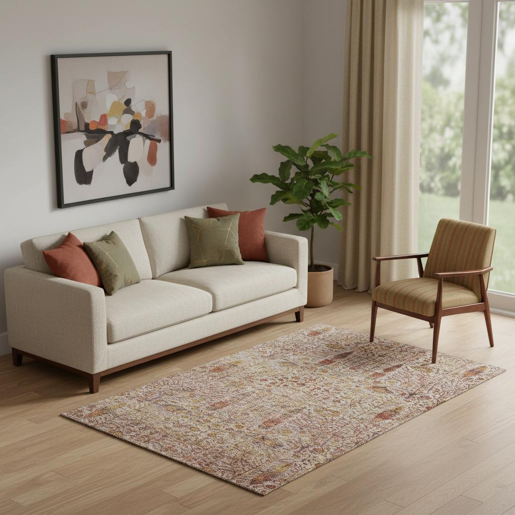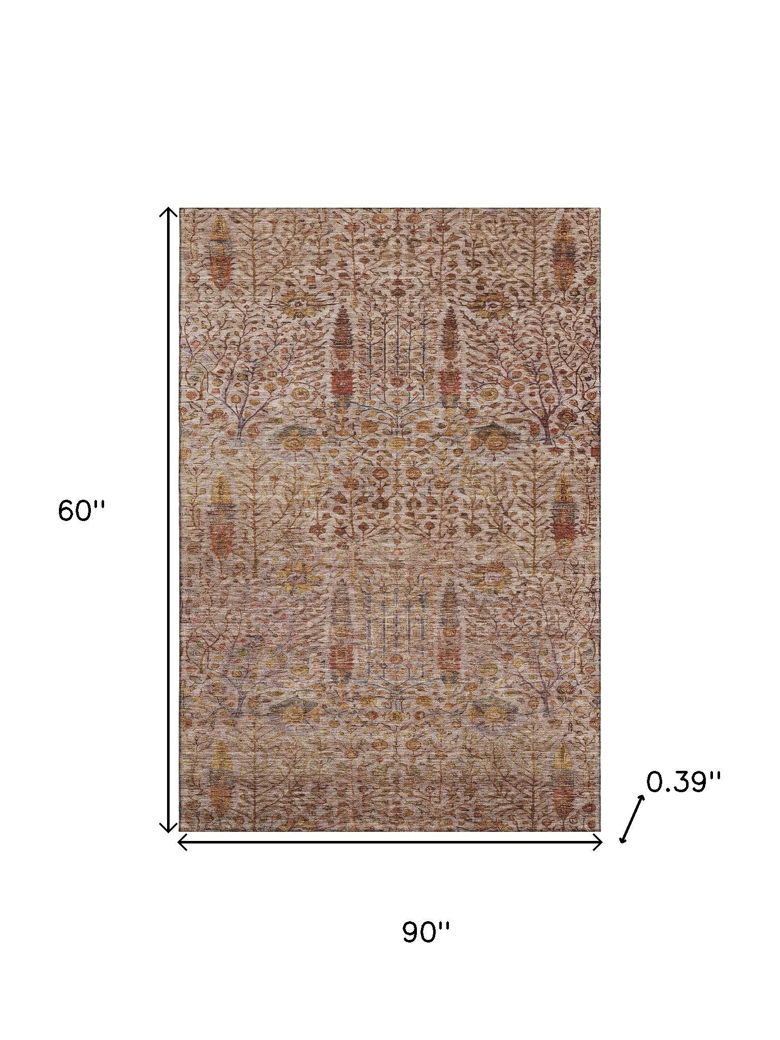 This 5-foot x 8-foot terra cotta and beige floral vines washable area rug with uv protection, is a great way to add warmth to a room. Ideal for spaces with kids and pets, this rug is stain resistant to help repel dirt and spilled liquids. Built to last, this rug crafted from polyester fibers is known for its durability and long lasting appeal. Rugs are a great way to showcase your style, hide imperfections, warm your home and reduce noise. This larger sized, transitional styled rug is ready to create a focal point or statement piece in your room. 60.00-inch h x 90.00-inch w x 0.39-inch d.