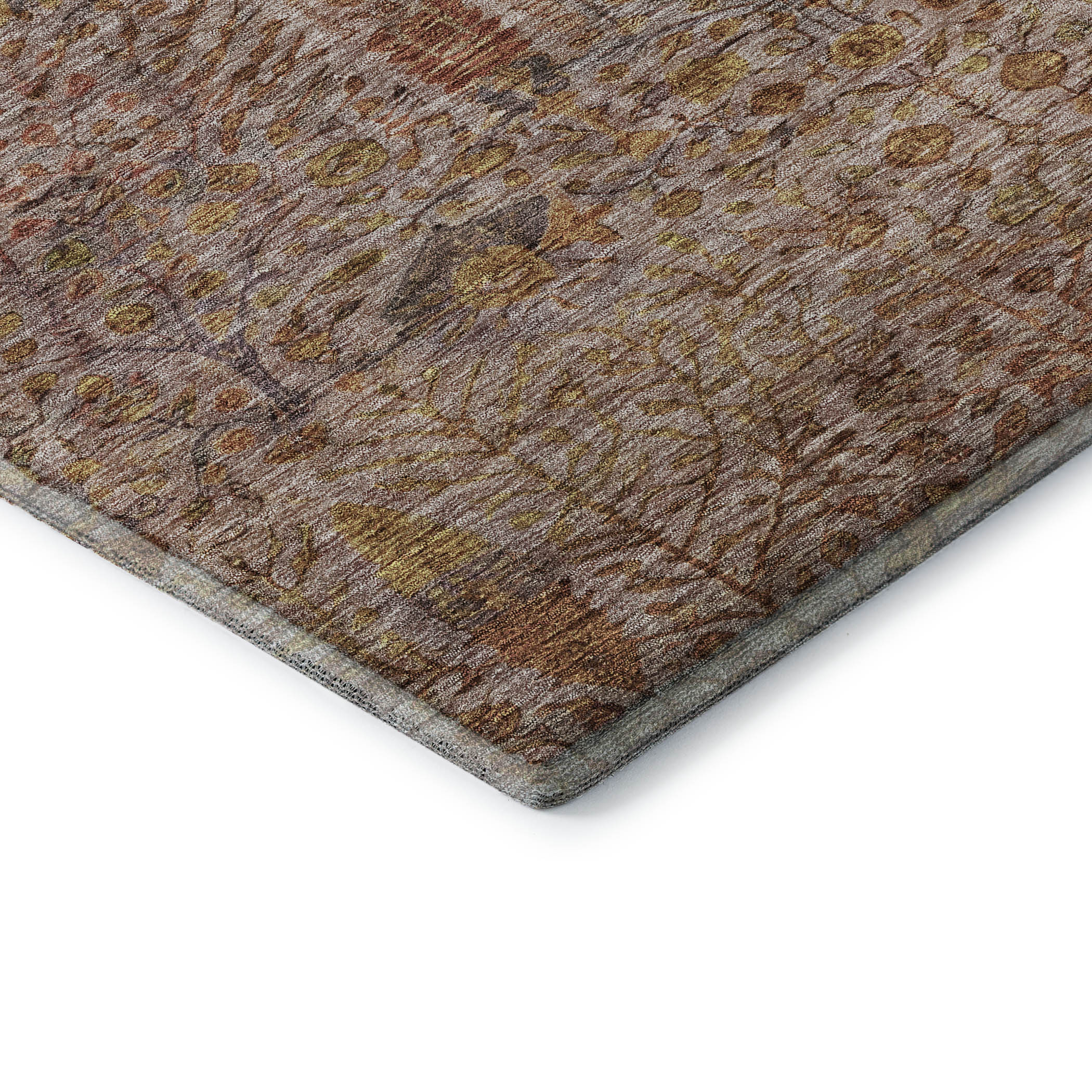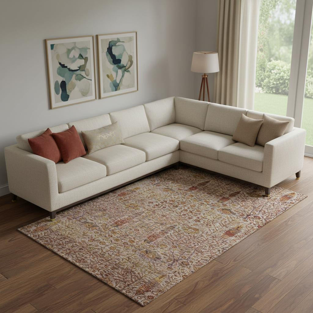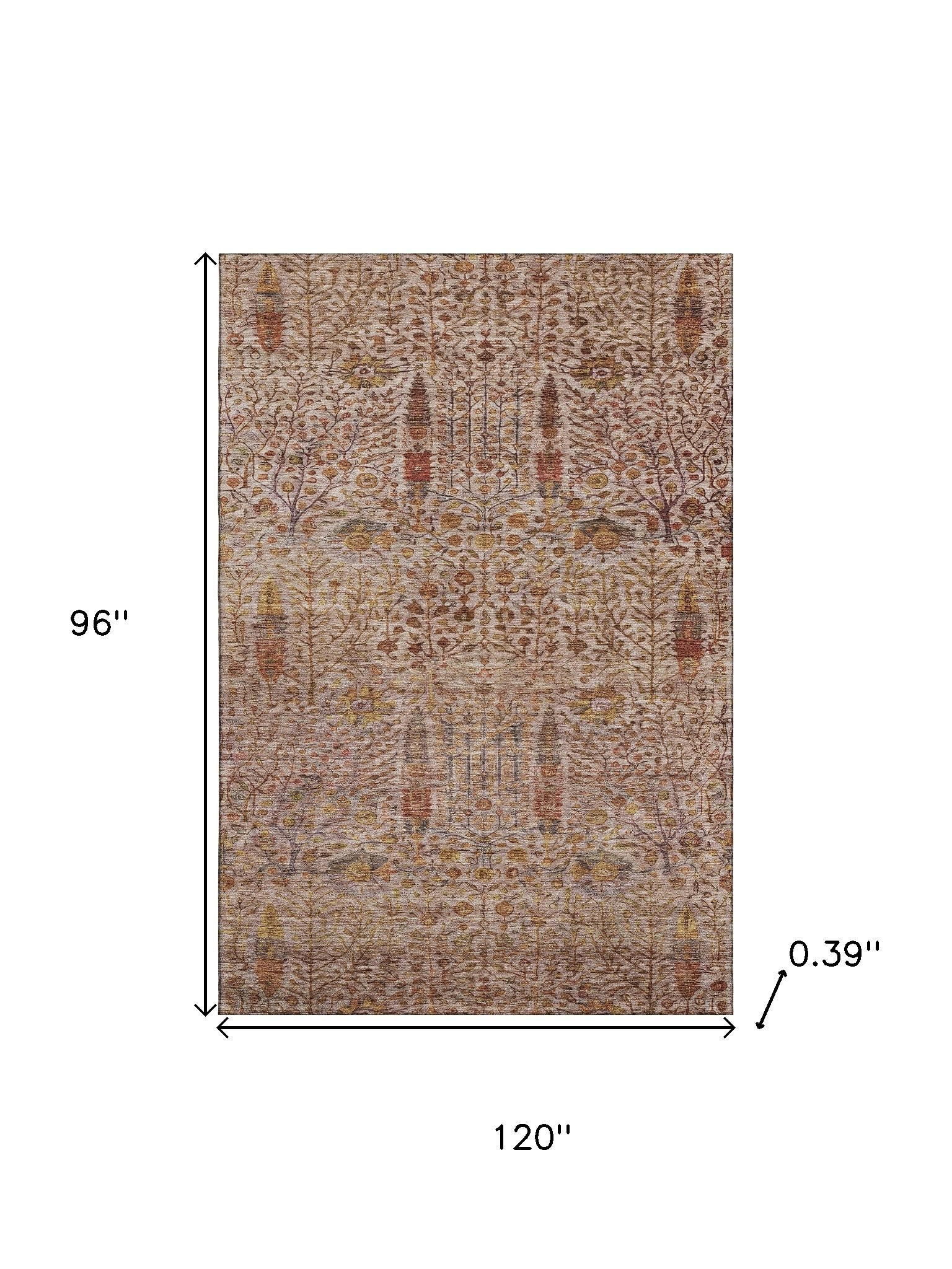 This 8-foot x 10-foot terra cotta and beige floral vines washable area rug with uv protection, is a great way to add warmth to a room. Ideal for spaces with kids and pets, this rug is stain resistant to help repel dirt and spilled liquids. Built to last, this rug crafted from polyester fibers is known for its durability and long lasting appeal. Rugs are a great way to showcase your style, hide imperfections, warm your home and reduce noise. This larger sized, transitional styled rug is ready to create a focal point or statement piece in your room. 96.00-inch h x 120.00-inch w x 0.39-inch d.
