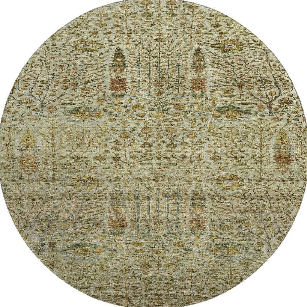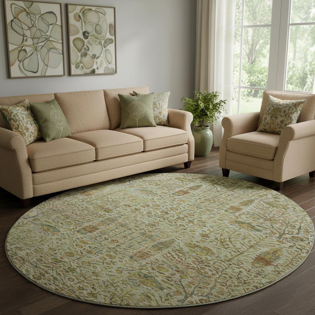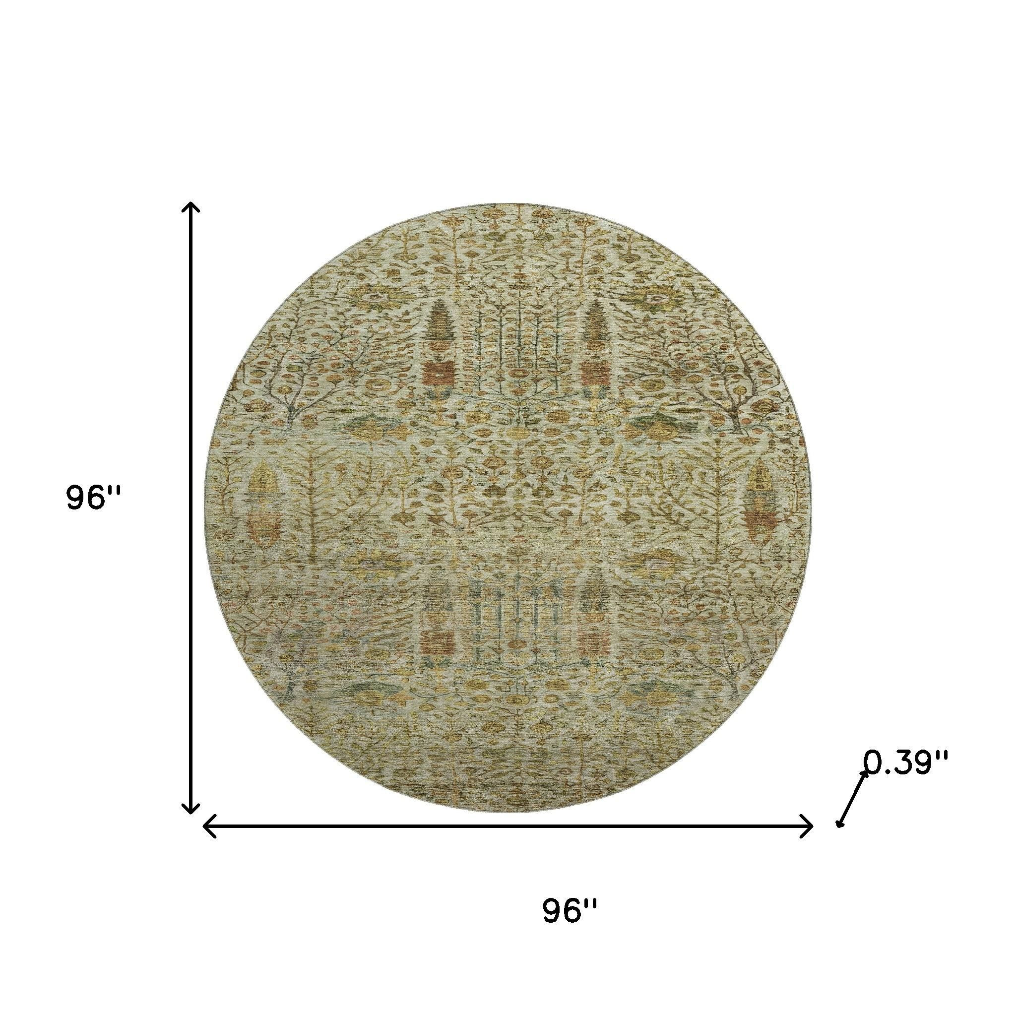 Add some artistry to your room with this 8-foot wheat and gold floral vines washable round rug with uv protection. Ideal for spaces with kids and pets, this rug is stain resistant to help repel dirt and spilled liquids. Built to last, this rug crafted from polyester fibers is known for its durability and long lasting appeal. Rugs are a great way to showcase your style, hide imperfections, warm your home and reduce noise. This larger sized, transitional styled rug is ready to create a focal point or statement piece in your room. 96.00-inch h x 96.00-inch w x 0.39-inch d.