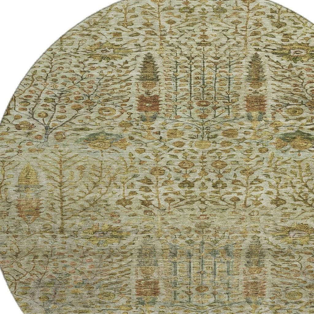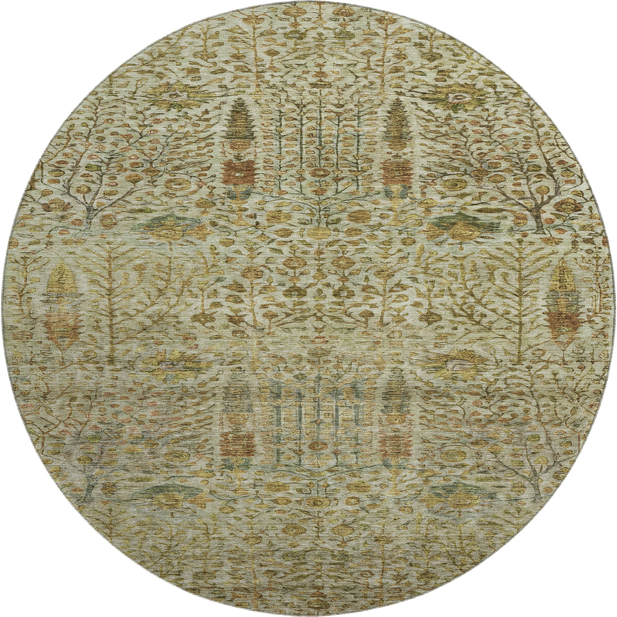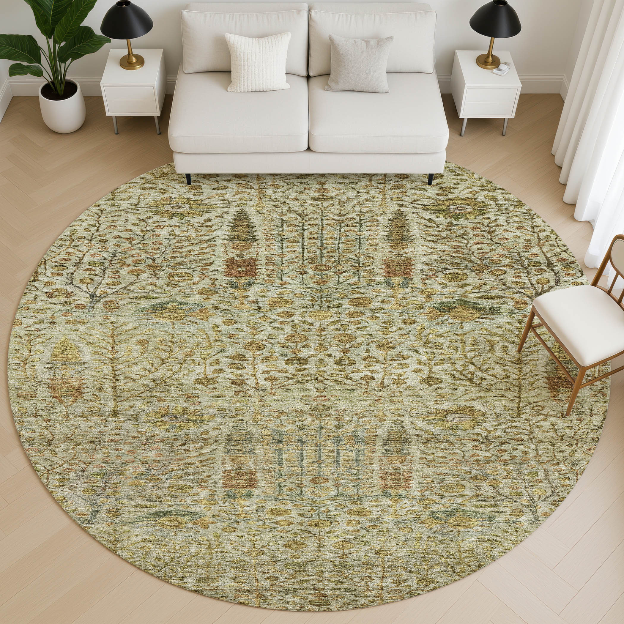 Add some artistry to your room with this 8-foot wheat and gold floral vines washable round rug with uv protection. Ideal for spaces with kids and pets, this rug is stain resistant to help repel dirt and spilled liquids. Built to last, this rug crafted from polyester fibers is known for its durability and long lasting appeal. Rugs are a great way to showcase your style, hide imperfections, warm your home and reduce noise. This larger sized, transitional styled rug is ready to create a focal point or statement piece in your room. 96.00-inch h x 96.00-inch w x 0.39-inch d.