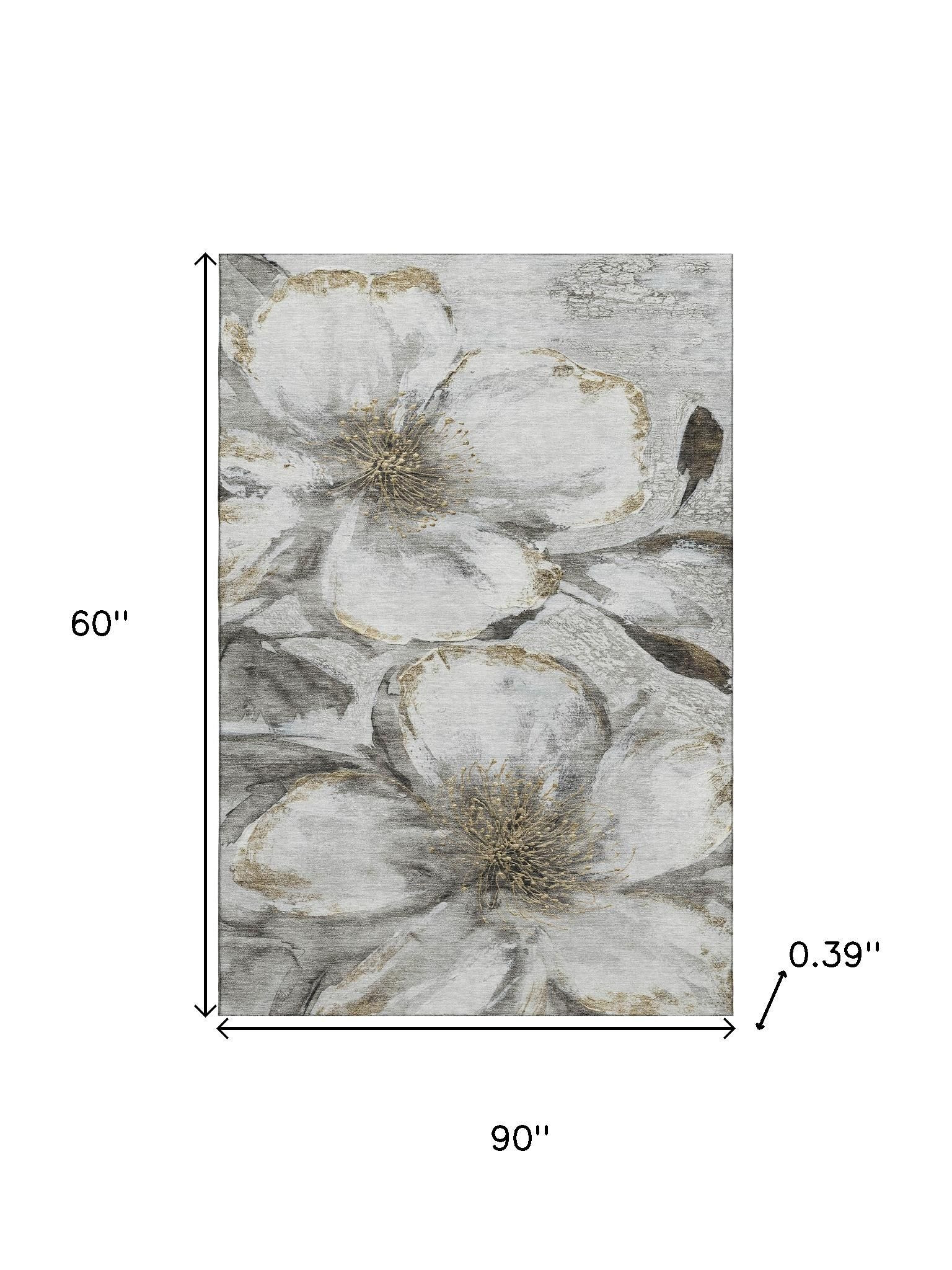 Add some artistry to your room with this 5-foot x 8-foot silver and gray floral washable area rug with uv protection. Ideal for spaces with kids and pets, this rug is stain resistant to help repel dirt and spilled liquids. Built to last, this rug crafted from polyester fibers is known for its durability and long lasting appeal. Rugs are a great way to showcase your style, hide imperfections, warm your home and reduce noise. This larger sized, transitional styled rug is ready to create a focal point or statement piece in your room. 60.00-inch h x 90.00-inch w x 0.39-inch d.