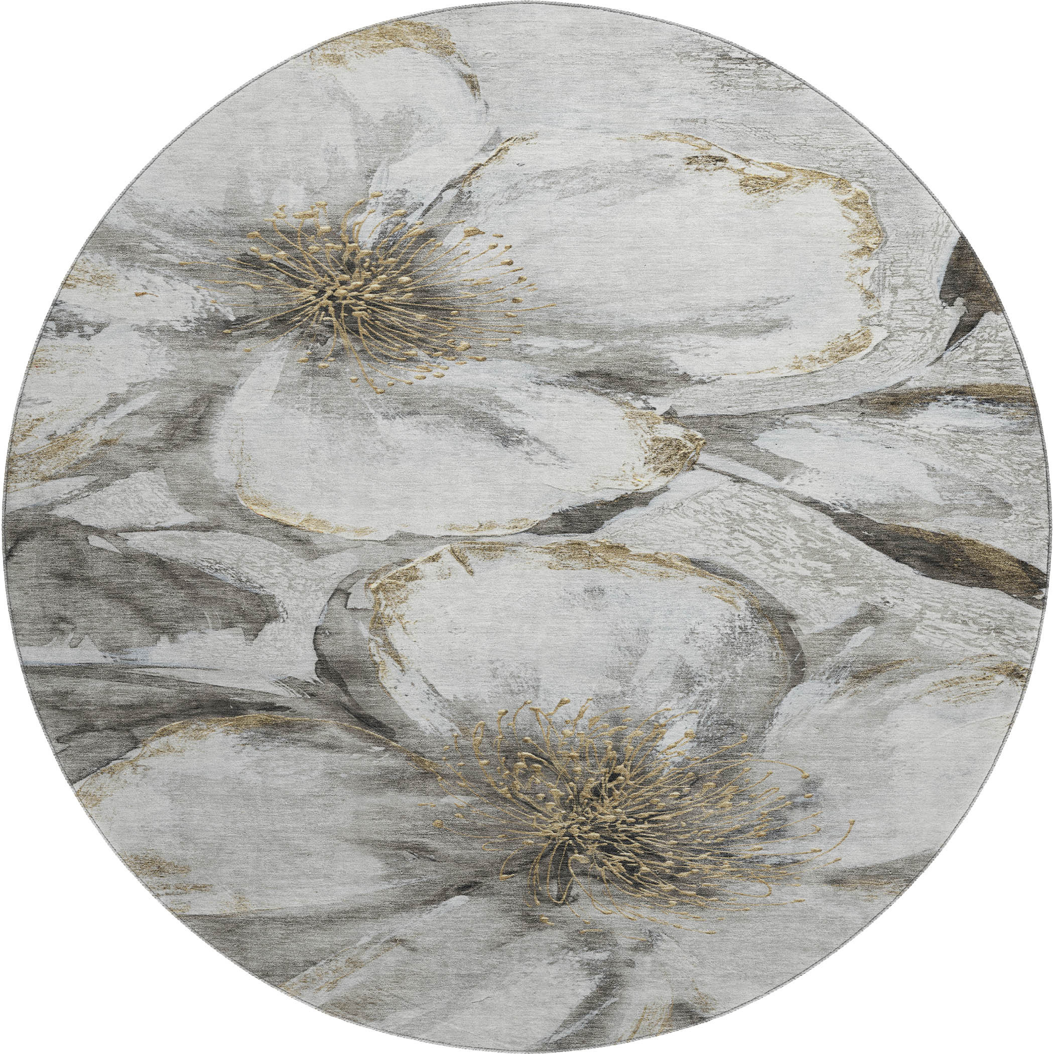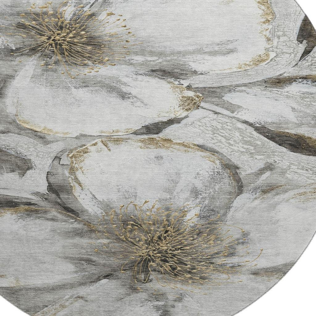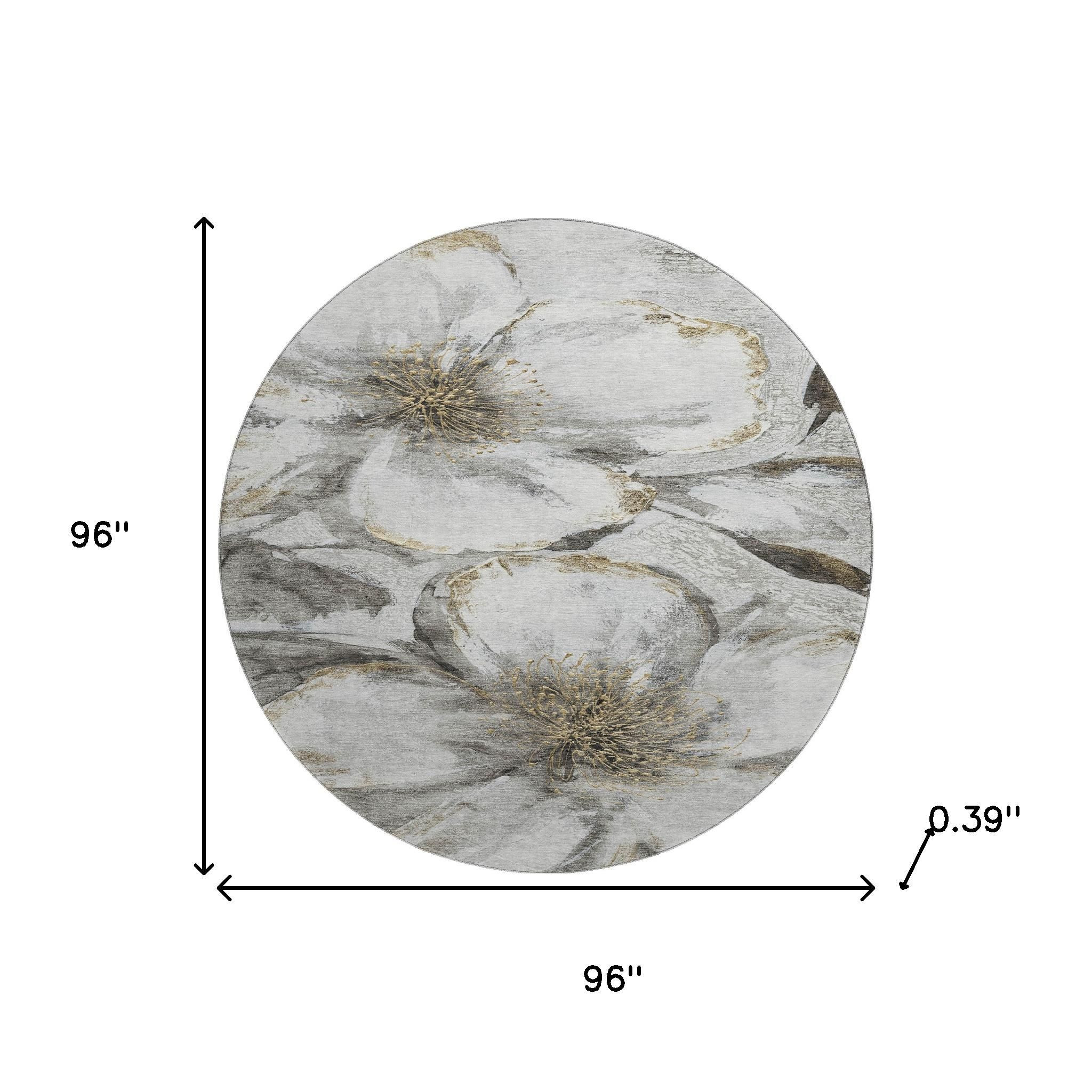 This 8-foot silver and gray floral washable round rug with uv protection, is a great way to add warmth to a room. Ideal for spaces with kids and pets, this rug is stain resistant to help repel dirt and spilled liquids. Built to last, this rug crafted from polyester fibers is known for its durability and long lasting appeal. Rugs are a great way to showcase your style, hide imperfections, warm your home and reduce noise. This larger sized, transitional styled rug is ready to create a focal point or statement piece in your room. 96.00-inch h x 96.00-inch w x 0.39-inch d.