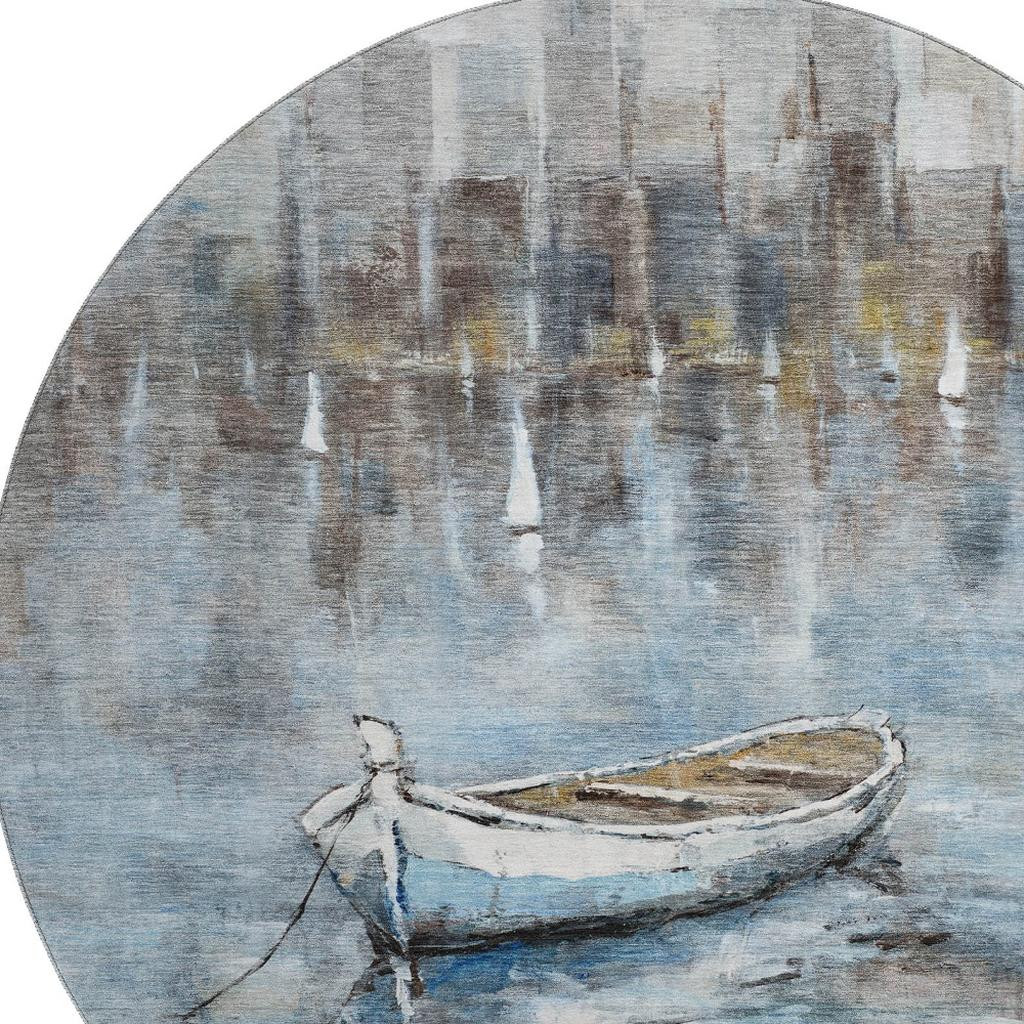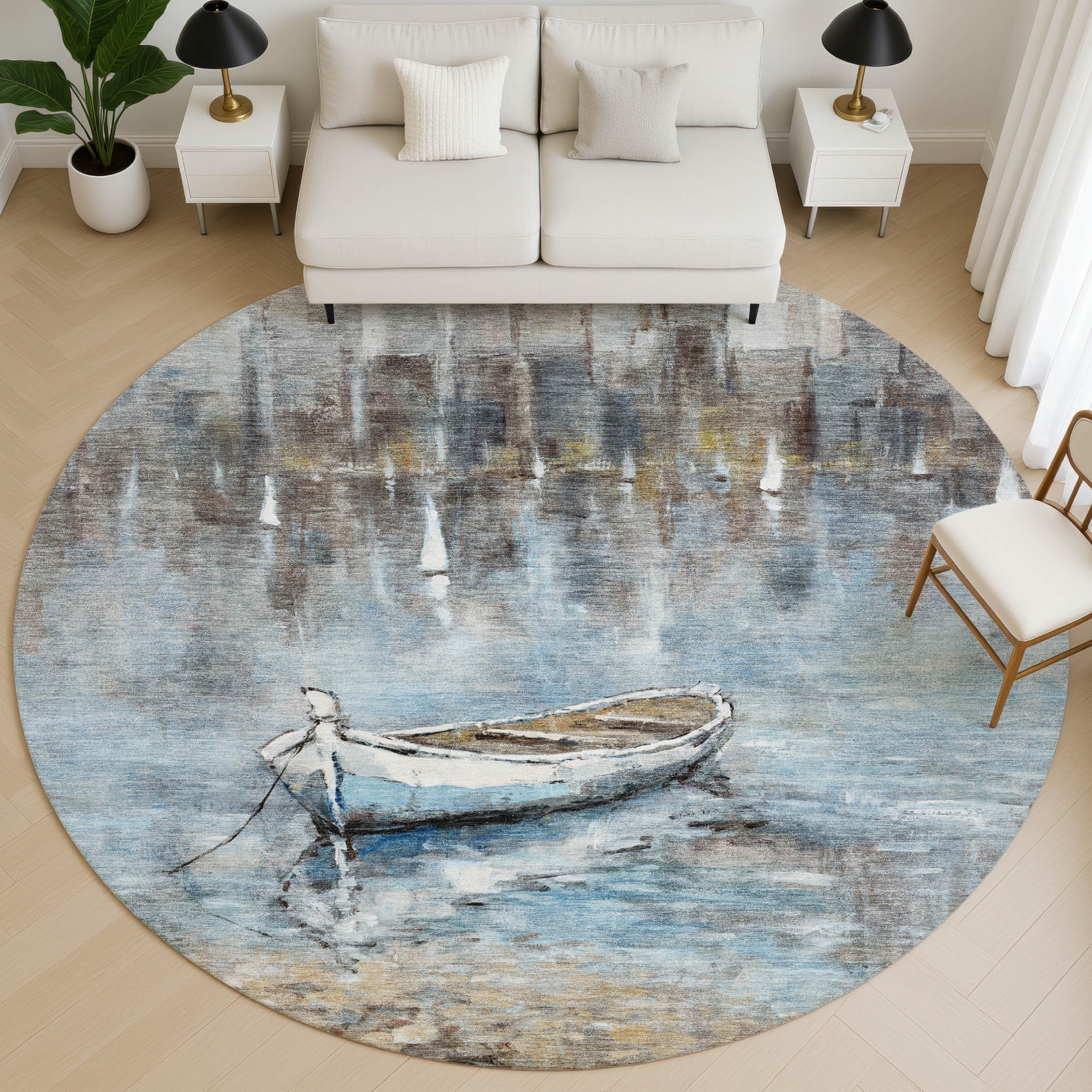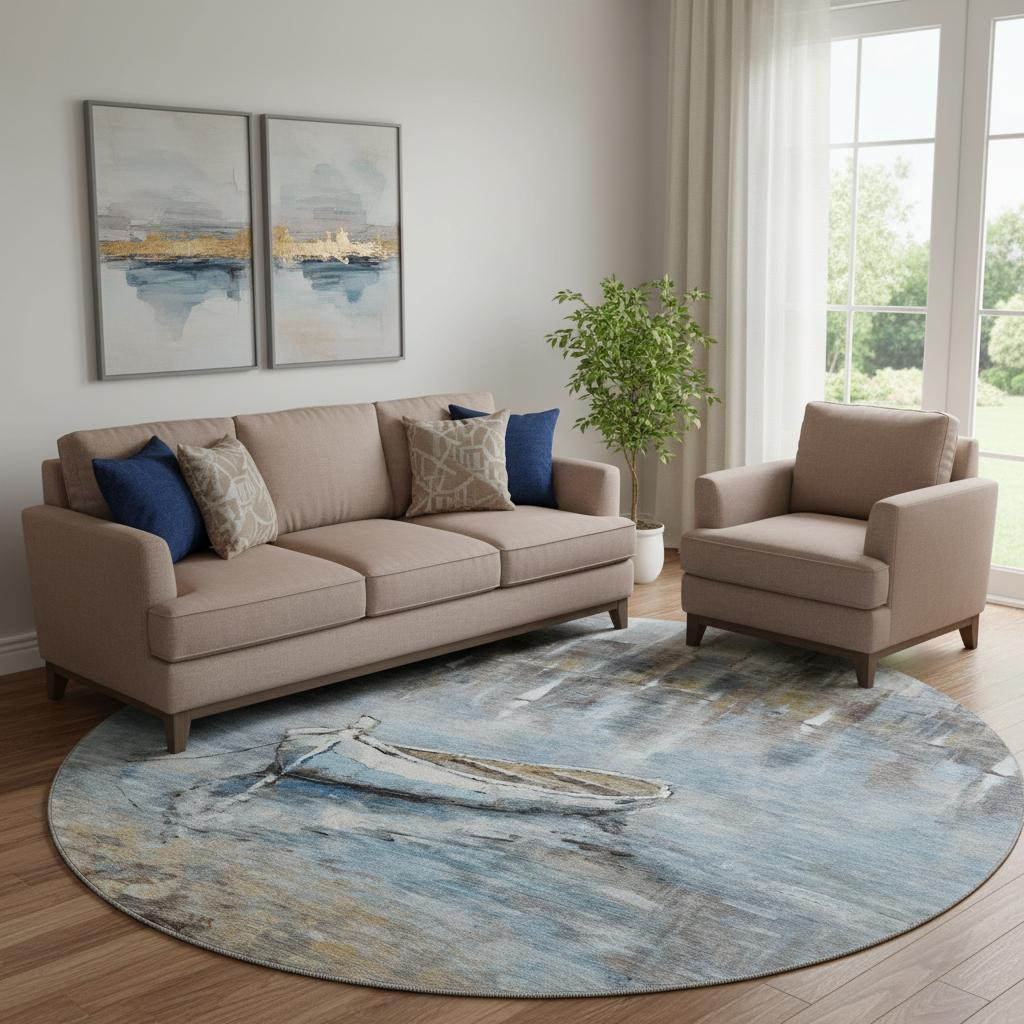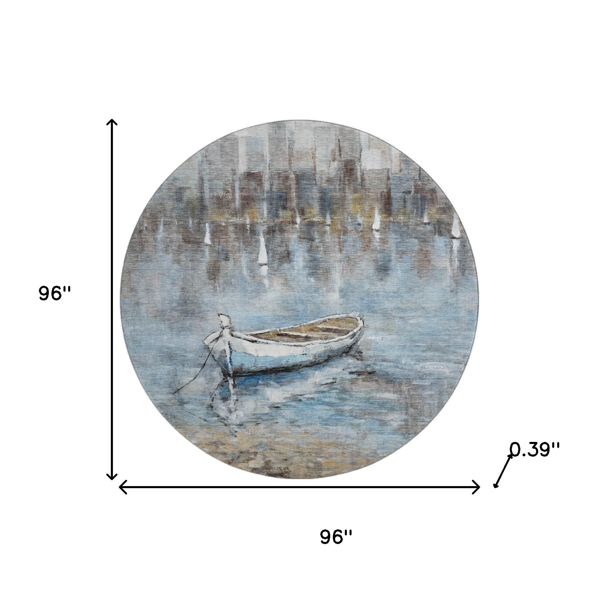 Add some artistry to your room with this 8-foot blue and beige nautical washable round rug with uv protection. Ideal for spaces with kids and pets, this rug is stain resistant to help repel dirt and spilled liquids. Built to last, this rug crafted from polyester fibers is known for its durability and long lasting appeal. Rugs are a great way to showcase your style, hide imperfections, warm your home and reduce noise. This larger sized, transitional styled rug is ready to create a focal point or statement piece in your room. 96.00-inch h x 96.00-inch w x 0.39-inch d.