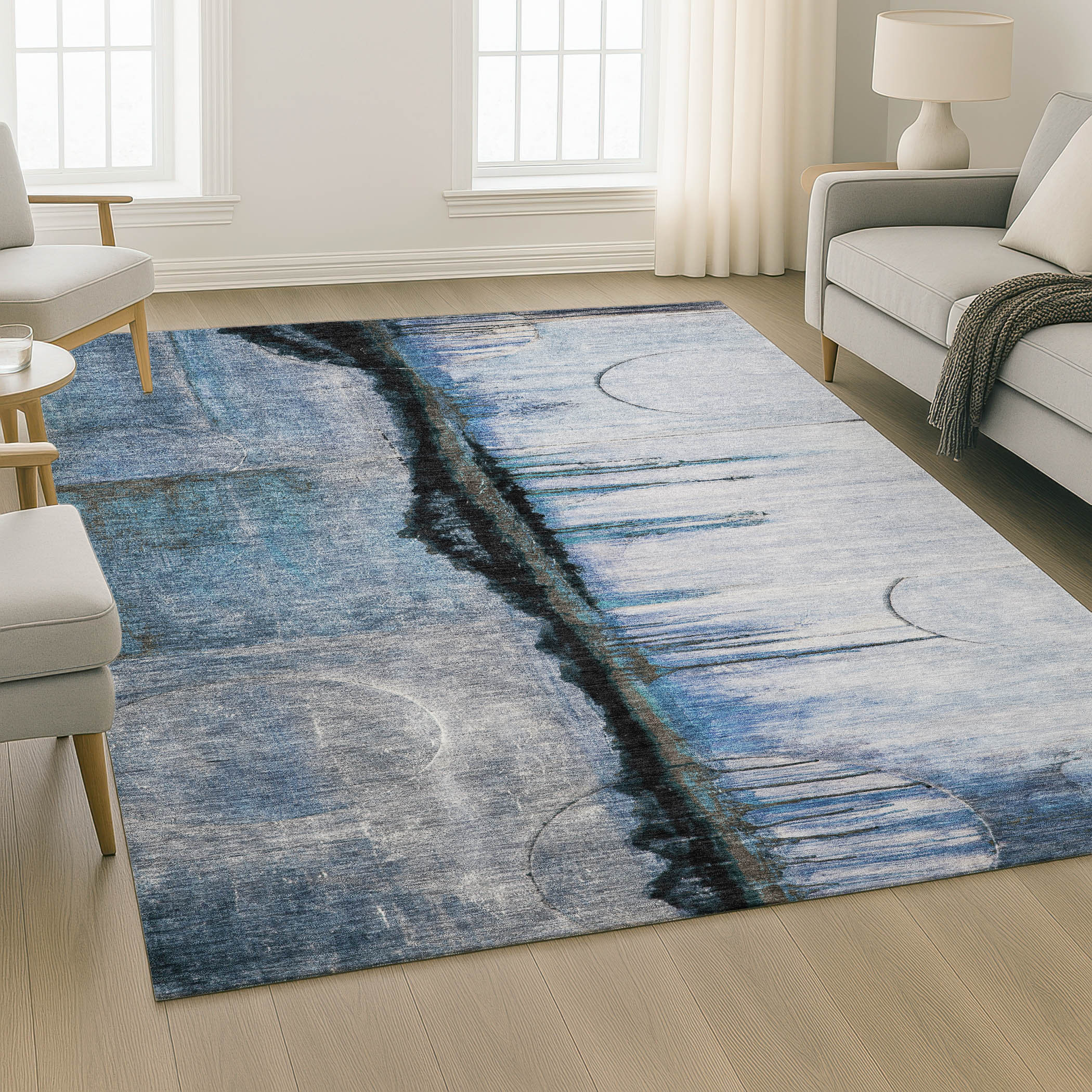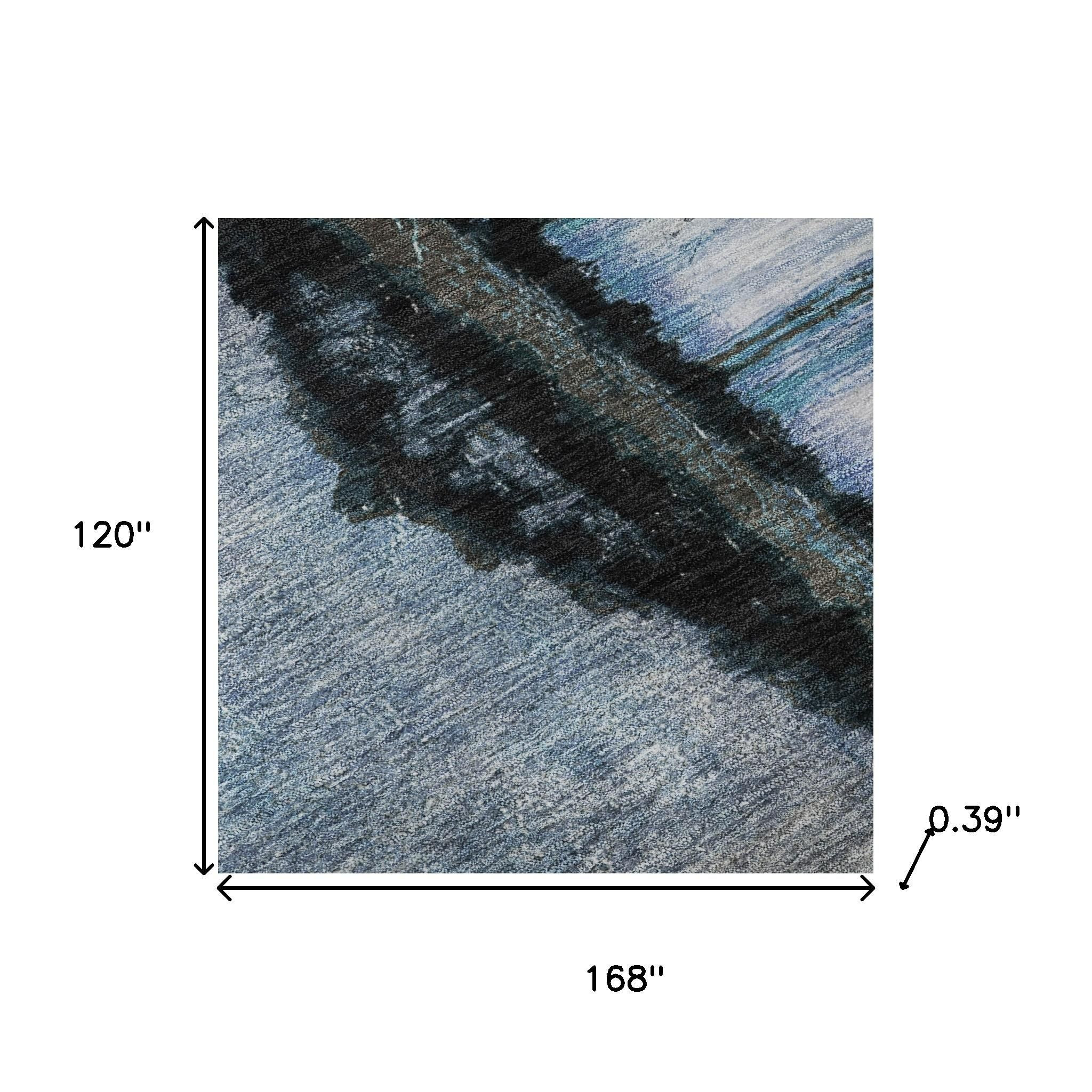 Add some artistry to your room with this 10-foot x 14-foot blue and charcoal abstract washable area rug with uv protection. Ideal for spaces with kids and pets, this rug is stain resistant to help repel dirt and spilled liquids. Built to last, this rug crafted from polyester fibers is known for its durability and long lasting appeal. Rugs are a great way to showcase your style, hide imperfections, warm your home and reduce noise. This larger sized, transitional styled rug is ready to create a focal point or statement piece in your room. 120.00-inch h x 168.00-inch w x 0.39-inch d.