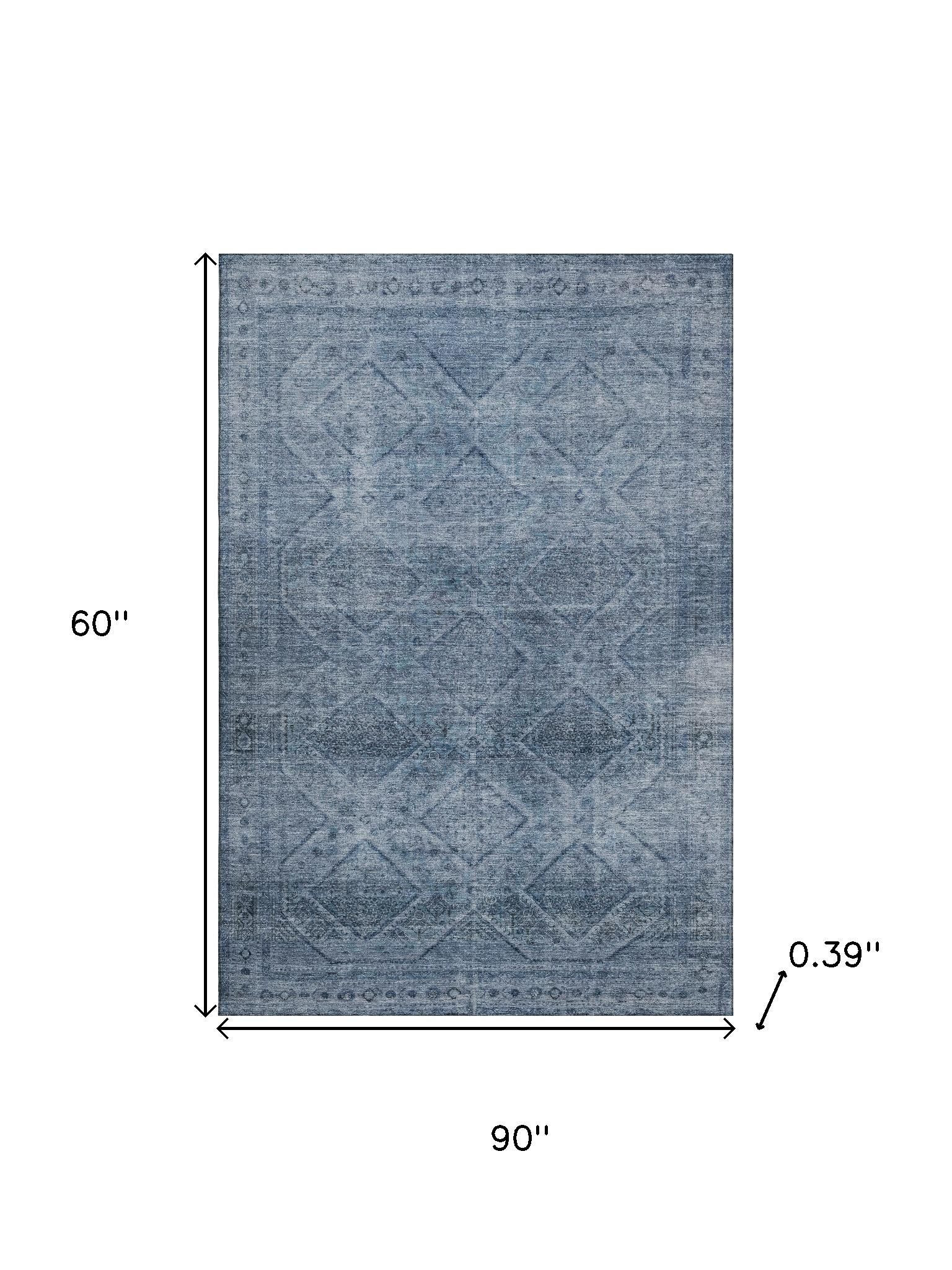 This 5-foot x 8-foot blue and gray geometric washable area rug with uv protection, is a great way to add warmth to a room. Ideal for spaces with kids and pets, this rug is stain resistant to help repel dirt and spilled liquids. Built to last, this rug crafted from polyester fibers is known for its durability and long lasting appeal. Rugs are a great way to showcase your style, hide imperfections, warm your home and reduce noise. This larger sized, transitional styled rug is ready to create a focal point or statement piece in your room. 60.00-inch h x 90.00-inch w x 0.39-inch d.
