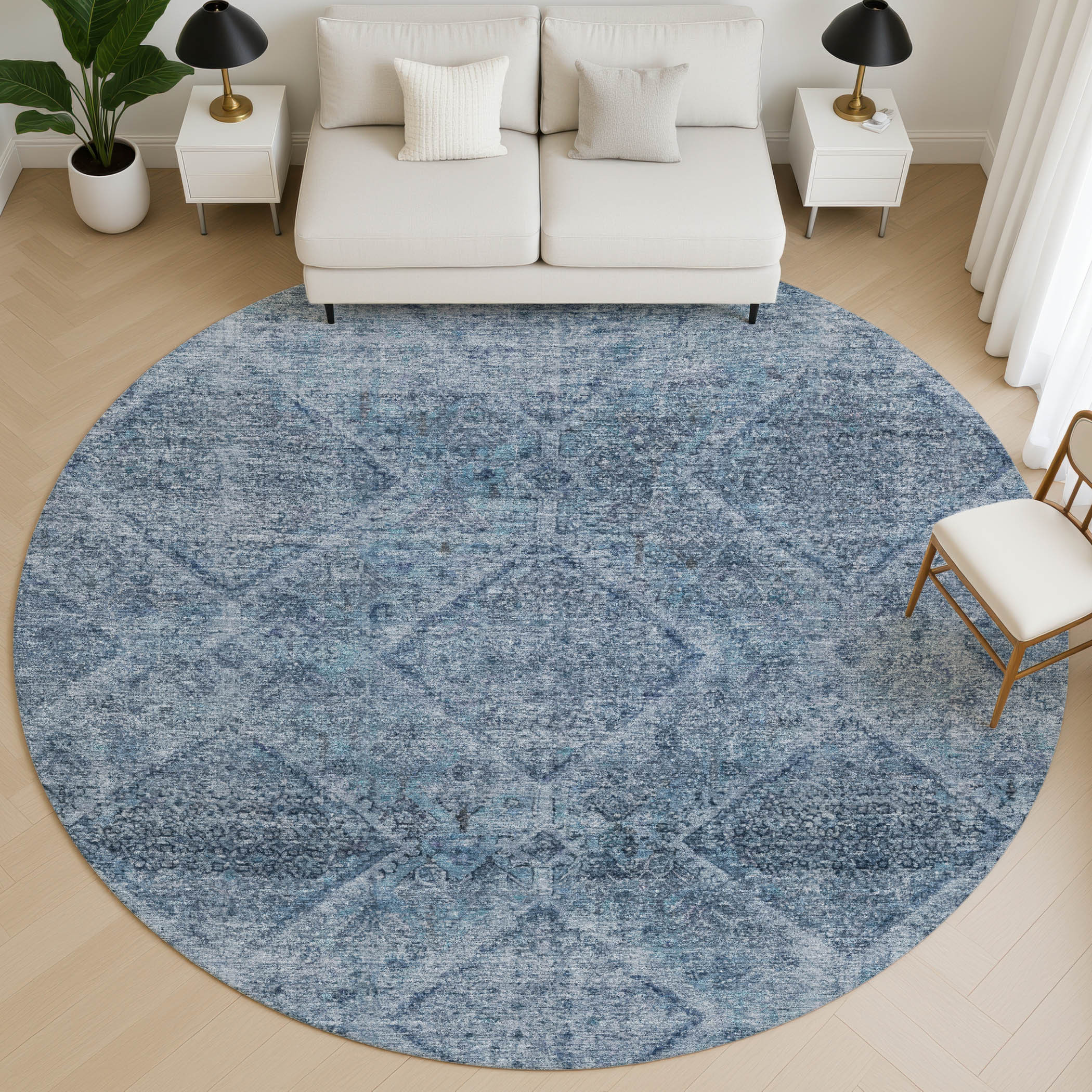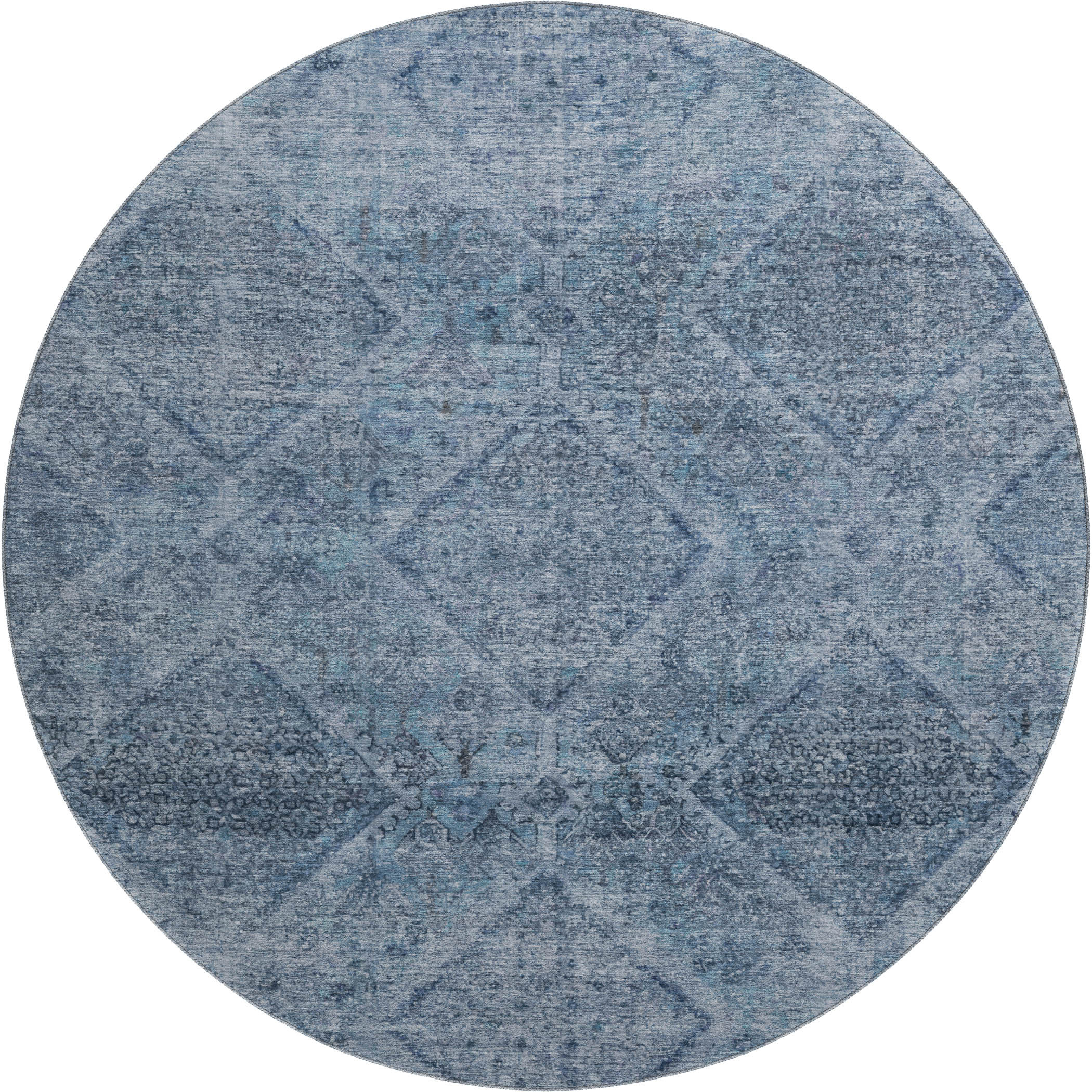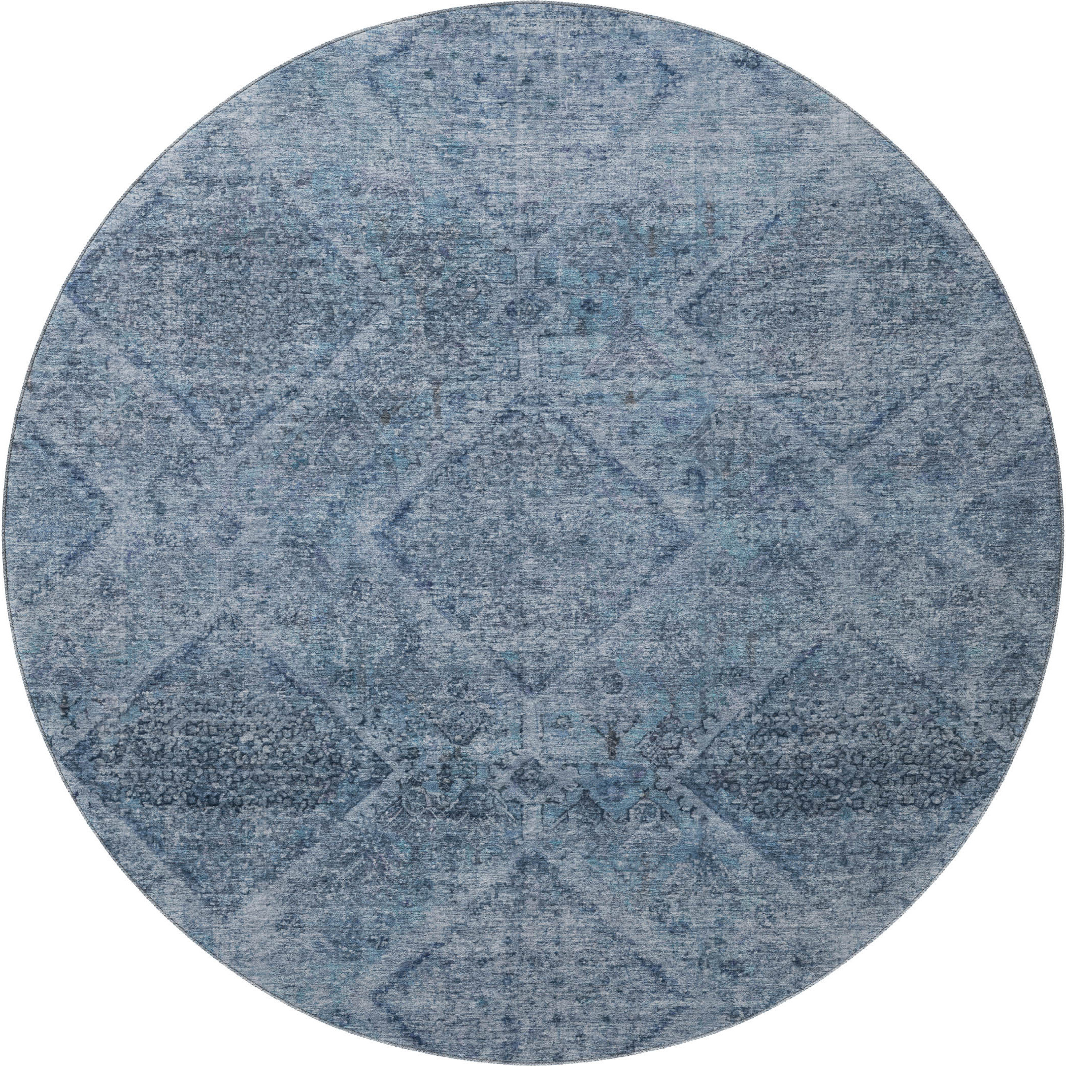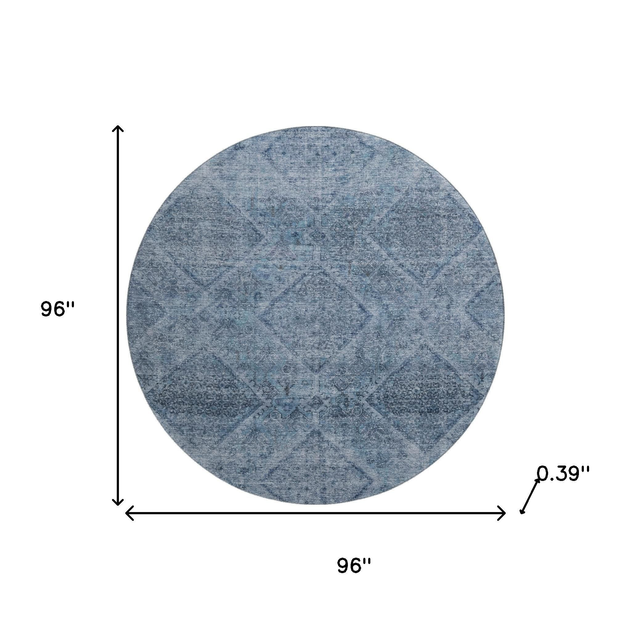 Add great coloration and comfortable texture to your space with this 8-foot blue and gray geometric washable round rug with uv protection. Ideal for spaces with kids and pets, this rug is stain resistant to help repel dirt and spilled liquids. Built to last, this rug crafted from polyester fibers is known for its durability and long lasting appeal. Rugs are a great way to showcase your style, hide imperfections, warm your home and reduce noise. This larger sized, transitional styled rug is ready to create a focal point or statement piece in your room. 96.00-inch h x 96.00-inch w x 0.39-inch d.