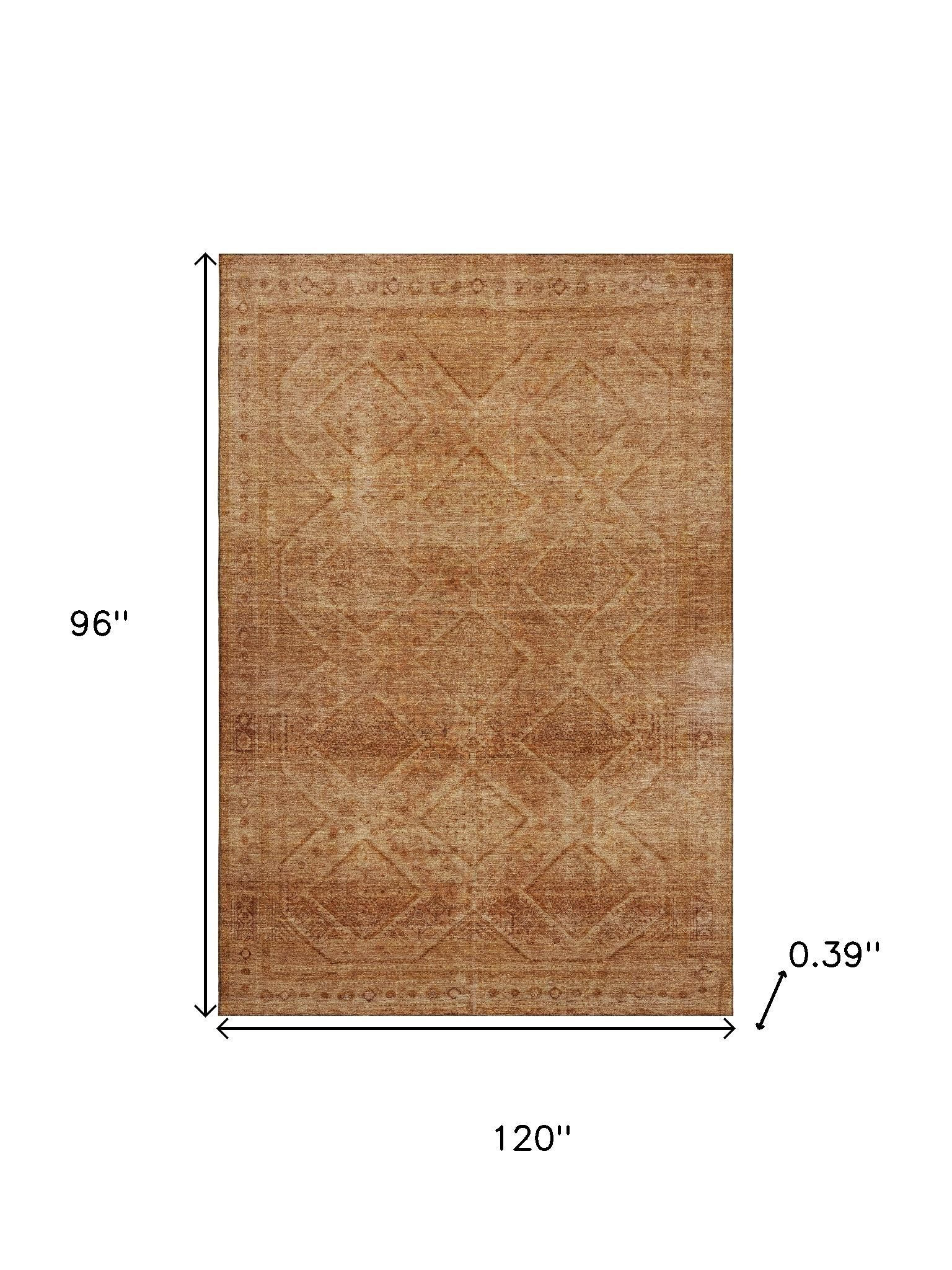 This 8-foot x 10-foot copper and rust geometric washable area rug with uv protection, is a great way to add warmth to a room. Ideal for spaces with kids and pets, this rug is stain resistant to help repel dirt and spilled liquids. Built to last, this rug crafted from polyester fibers is known for its durability and long lasting appeal. Rugs are a great way to showcase your style, hide imperfections, warm your home and reduce noise. This larger sized, transitional styled rug is ready to create a focal point or statement piece in your room. 96.00-inch h x 120.00-inch w x 0.39-inch d.