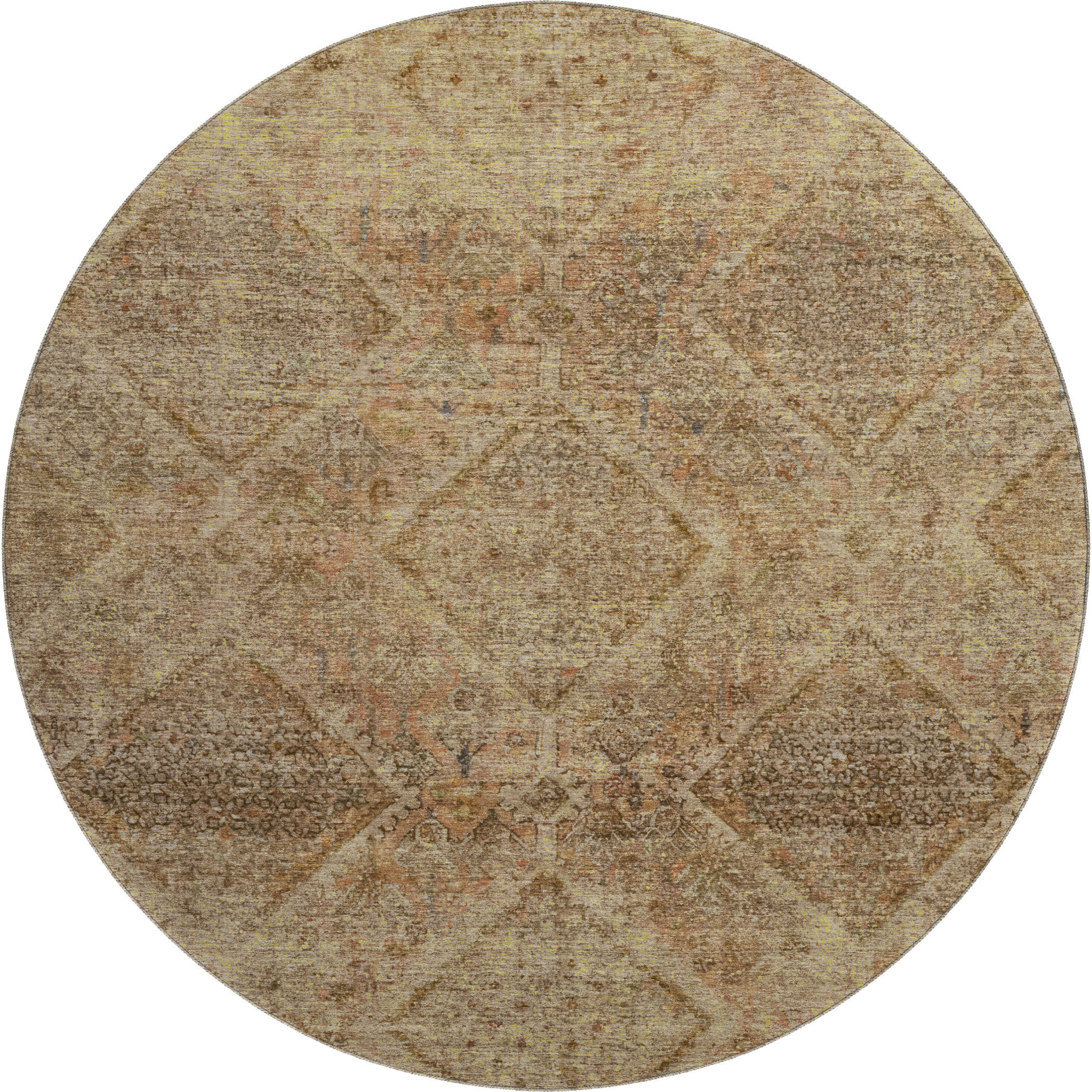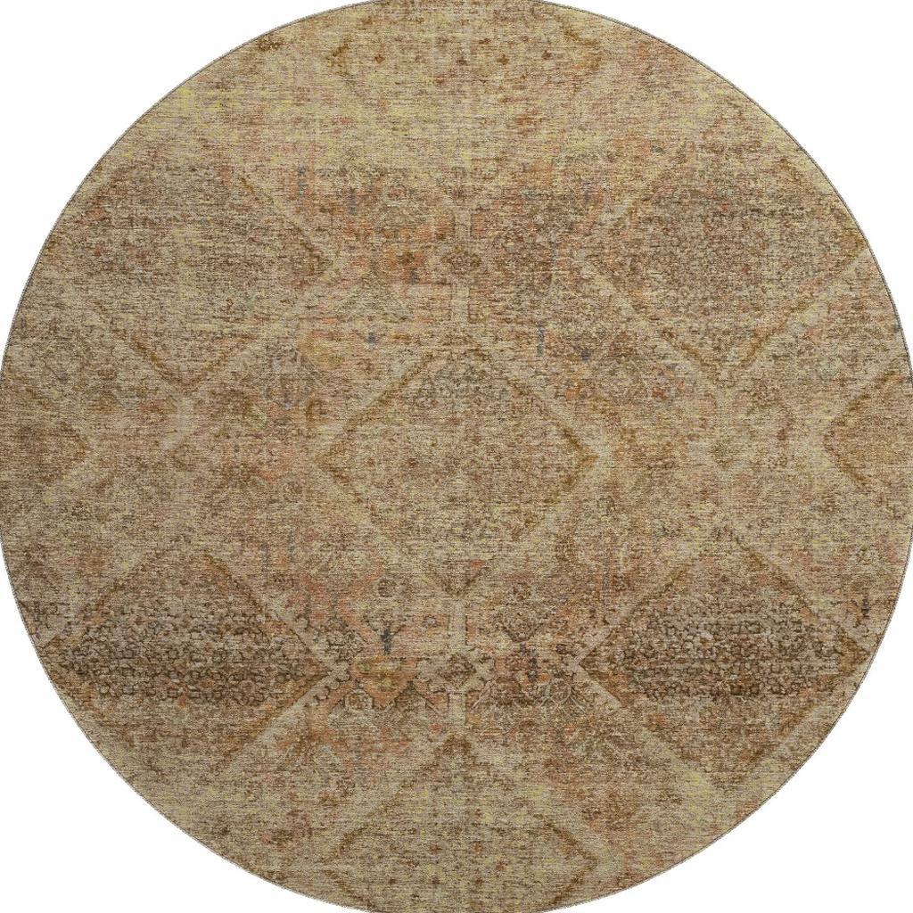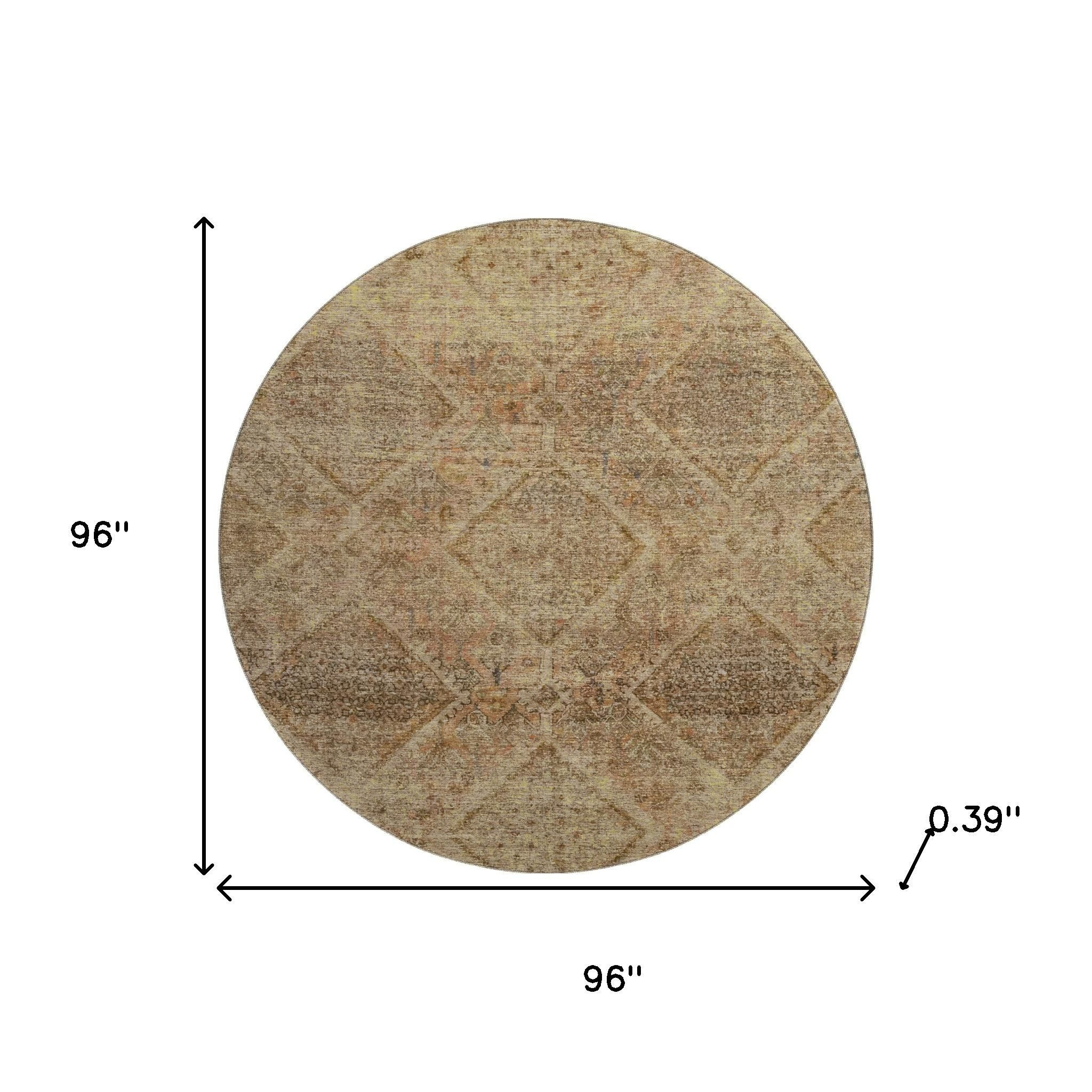 This 8-foot khaki and beige geometric washable round rug with uv protection, is a great way to add warmth to a room. Ideal for spaces with kids and pets, this rug is stain resistant to help repel dirt and spilled liquids. Built to last, this rug crafted from polyester fibers is known for its durability and long lasting appeal. Rugs are a great way to showcase your style, hide imperfections, warm your home and reduce noise. This larger sized, transitional styled rug is ready to create a focal point or statement piece in your room. 96.00-inch h x 96.00-inch w x 0.39-inch d.