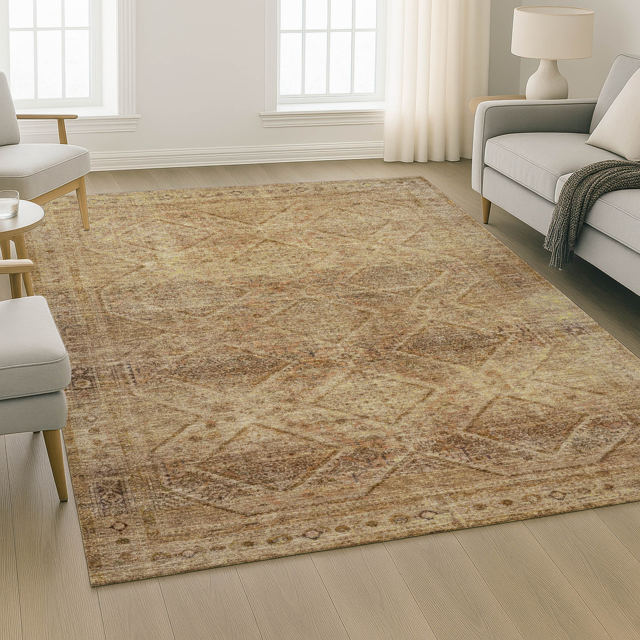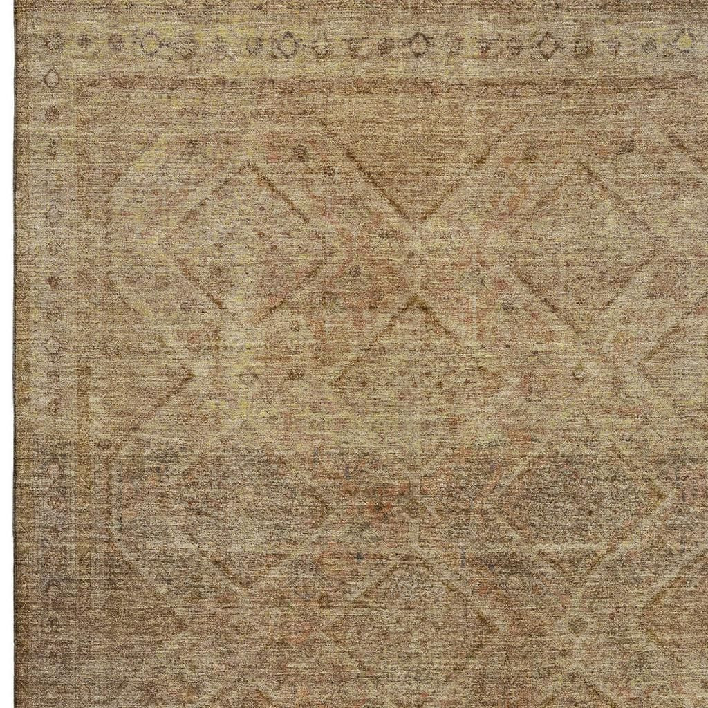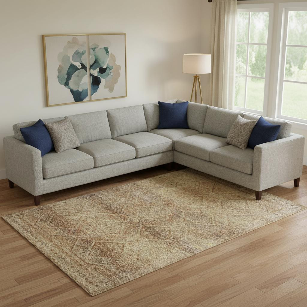 Set an inviting tone in your space with this 10-foot x 14-foot khaki and beige geometric washable area rug with uv protection. Ideal for spaces with kids and pets, this rug is stain resistant to help repel dirt and spilled liquids. Built to last, this rug crafted from polyester fibers is known for its durability and long lasting appeal. Rugs are a great way to showcase your style, hide imperfections, warm your home and reduce noise. This larger sized, transitional styled rug is ready to create a focal point or statement piece in your room. 120.00-inch h x 168.00-inch w x 0.39-inch d.