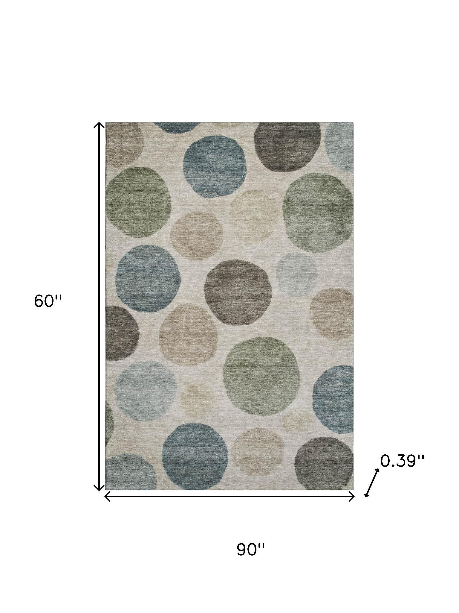 Add some artistry to your room with this 5-foot x 8-foot khaki and teal geometric washable area rug with uv protection. Ideal for spaces with kids and pets, this rug is stain resistant to help repel dirt and spilled liquids. Built to last, this rug crafted from polyester fibers is known for its durability and long lasting appeal. Rugs are a great way to showcase your style, hide imperfections, warm your home and reduce noise. This larger sized, transitional styled rug is ready to create a focal point or statement piece in your room. 60.00-inch h x 90.00-inch w x 0.39-inch d.