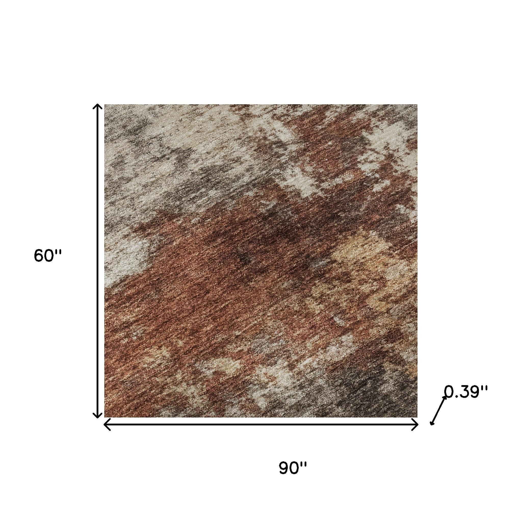 Add some artistry to your room with this 5-foot x 8-foot rust and beige abstract washable area rug with uv protection. Ideal for spaces with kids and pets, this rug is stain resistant to help repel dirt and spilled liquids. Built to last, this rug crafted from polyester fibers is known for its durability and long lasting appeal. Rugs are a great way to showcase your style, hide imperfections, warm your home and reduce noise. This larger sized, transitional styled rug is ready to create a focal point or statement piece in your room. 60.00-inch h x 90.00-inch w x 0.39-inch d.