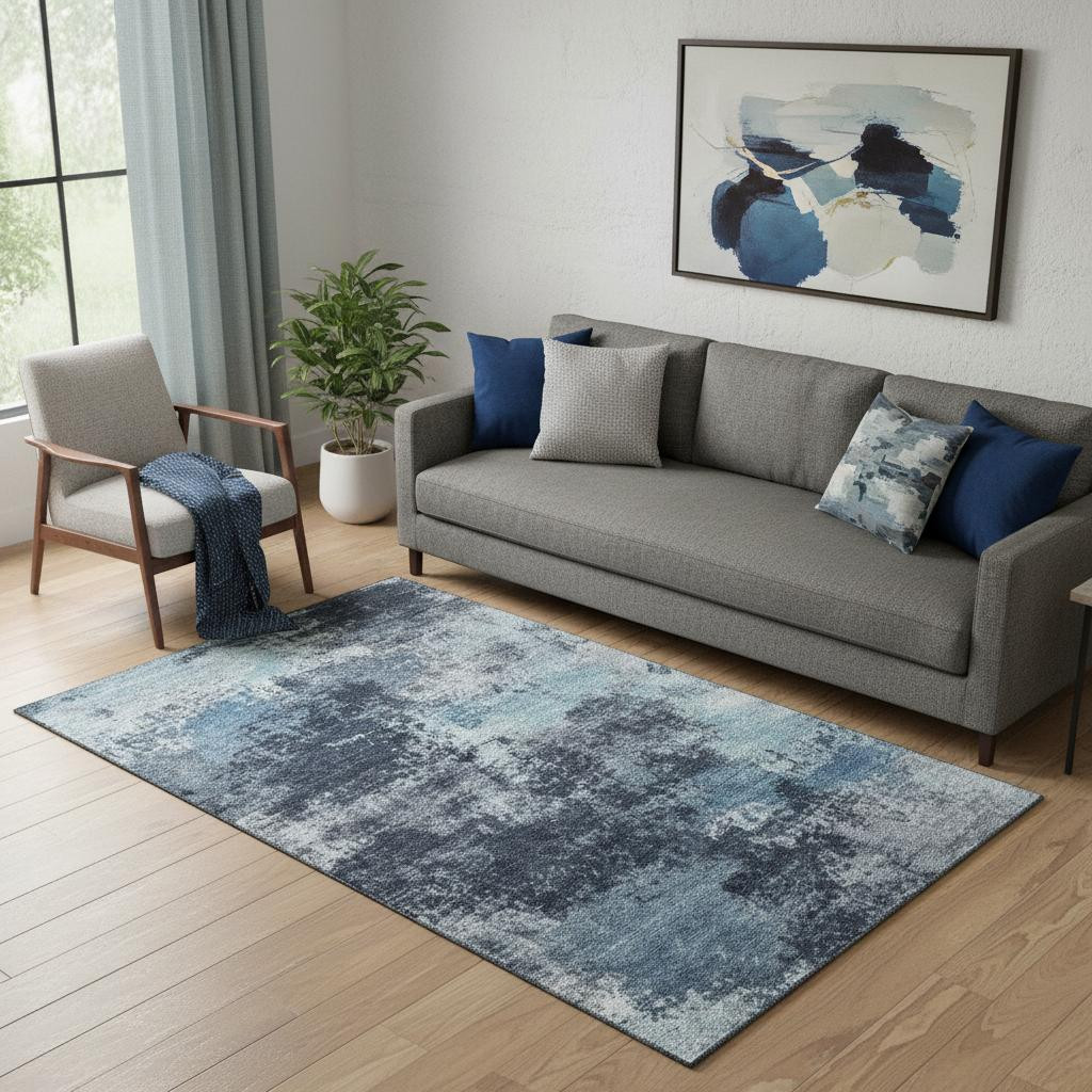 Add some artistry to your room with this 5-foot x 8-foot blue and ivory abstract washable area rug with uv protection. Ideal for spaces with kids and pets, this rug is stain resistant to help repel dirt and spilled liquids. Built to last, this rug crafted from polyester fibers is known for its durability and long lasting appeal. Rugs are a great way to showcase your style, hide imperfections, warm your home and reduce noise. This larger sized, transitional styled rug is ready to create a focal point or statement piece in your room. 60.00-inch h x 90.00-inch w x 0.39-inch d.