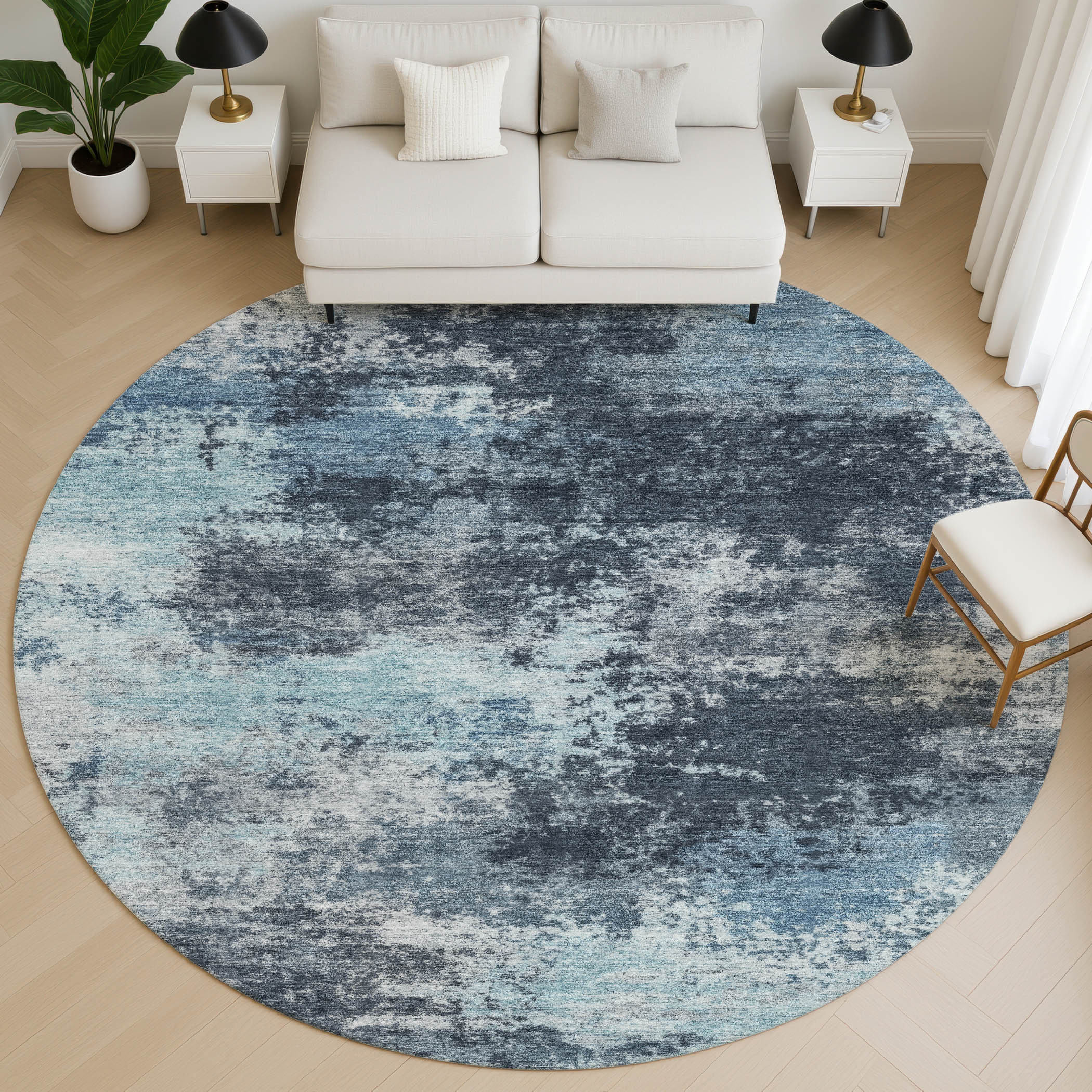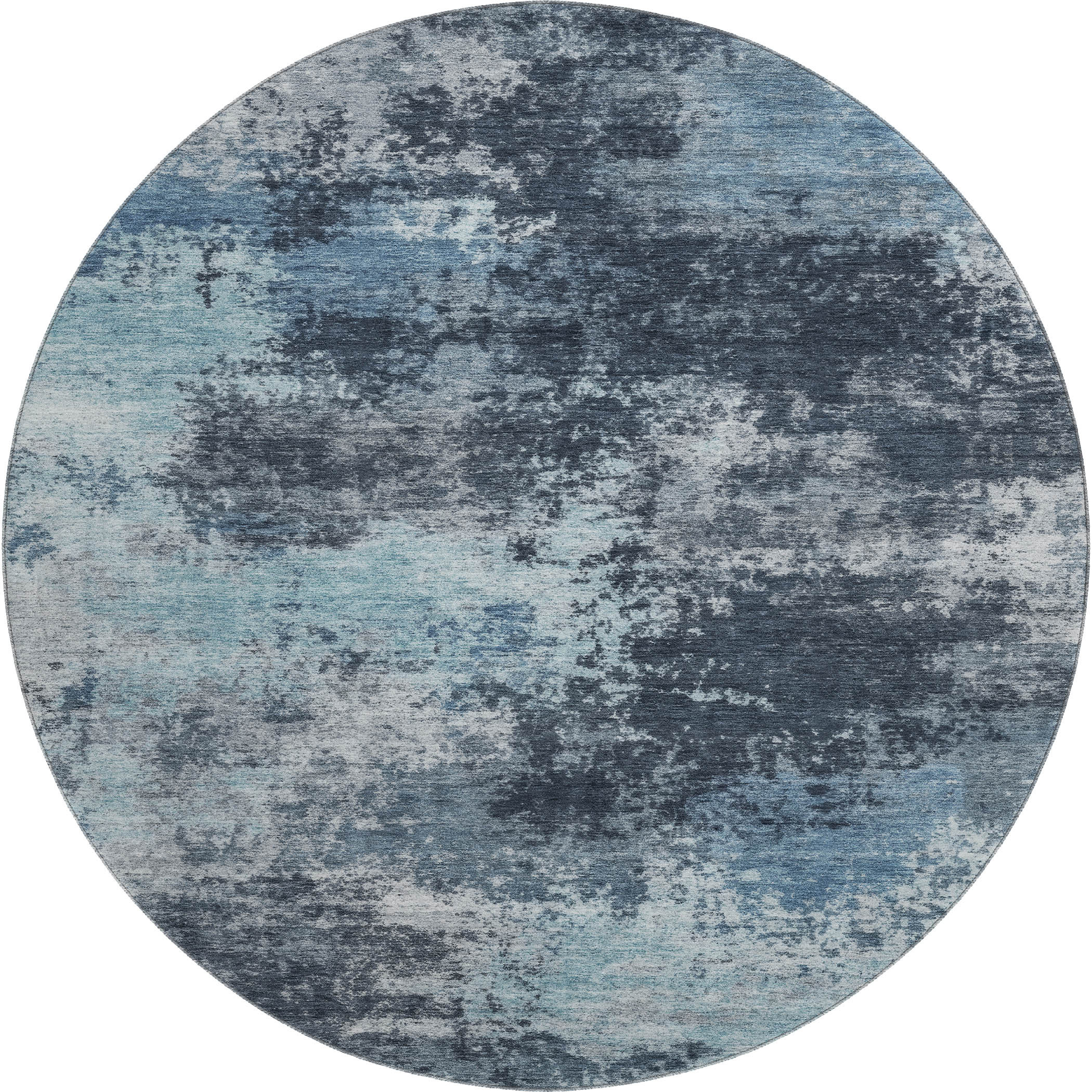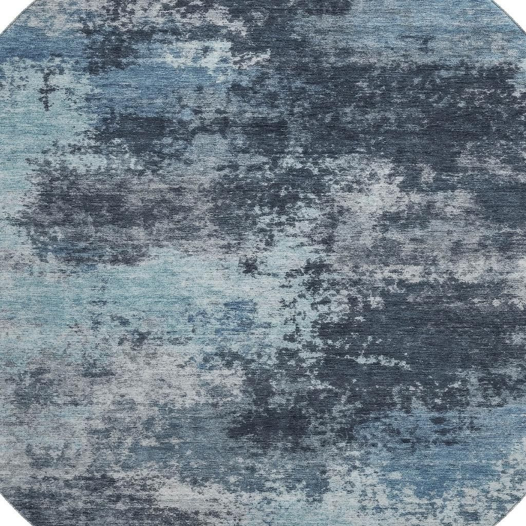 Add some artistry to your room with this 8-foot blue and ivory abstract washable round rug with uv protection. Ideal for spaces with kids and pets, this rug is stain resistant to help repel dirt and spilled liquids. Built to last, this rug crafted from polyester fibers is known for its durability and long lasting appeal. Rugs are a great way to showcase your style, hide imperfections, warm your home and reduce noise. This larger sized, transitional styled rug is ready to create a focal point or statement piece in your room. 96.00-inch h x 96.00-inch w x 0.39-inch d.