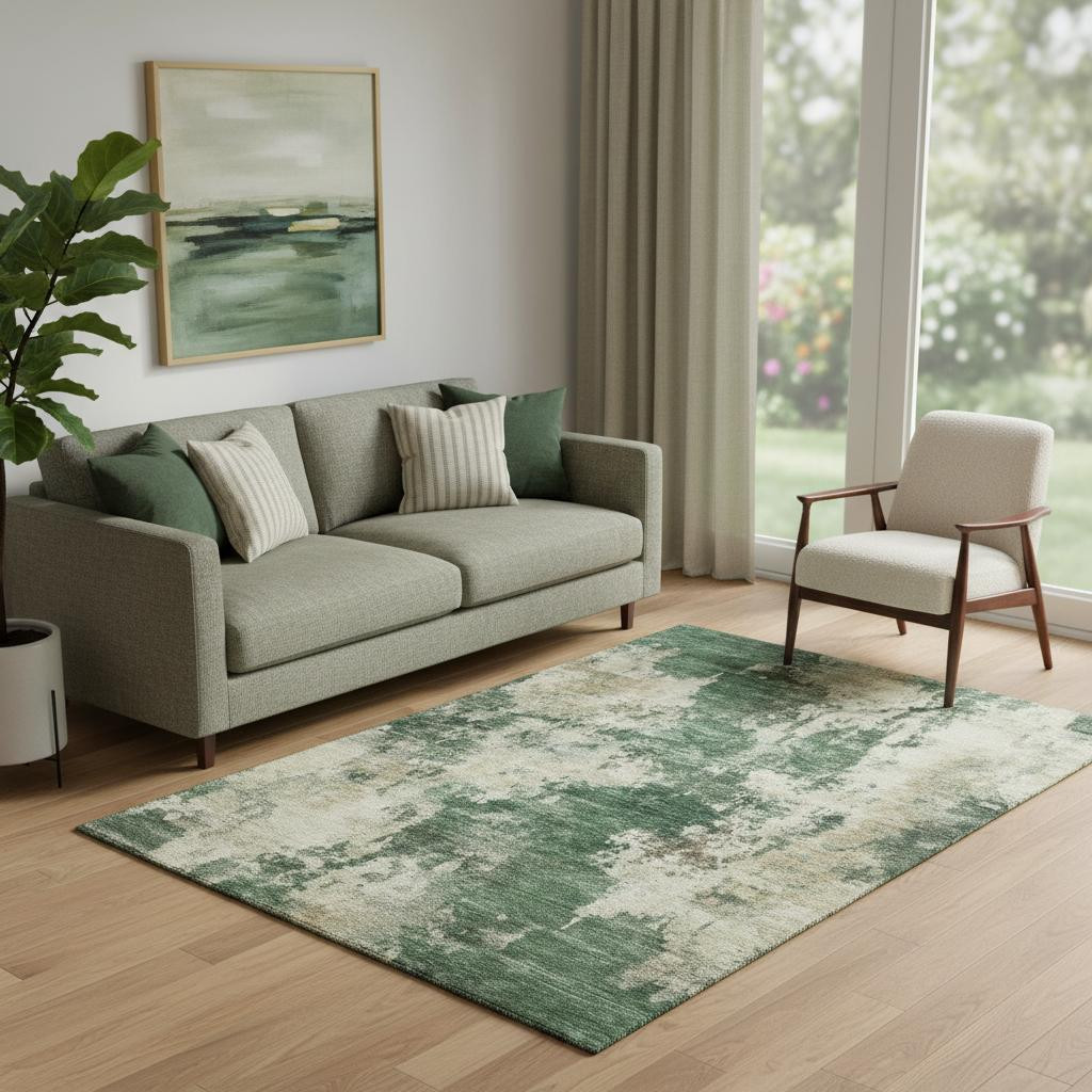 Set an inviting tone in your space with this 5-foot x 8-foot fern green and beige abstract washable area rug with uv protection. Ideal for spaces with kids and pets, this rug is stain resistant to help repel dirt and spilled liquids. Built to last, this rug crafted from polyester fibers is known for its durability and long lasting appeal. Rugs are a great way to showcase your style, hide imperfections, warm your home and reduce noise. This larger sized, transitional styled rug is ready to create a focal point or statement piece in your room. 60.00-inch h x 90.00-inch w x 0.39-inch d.