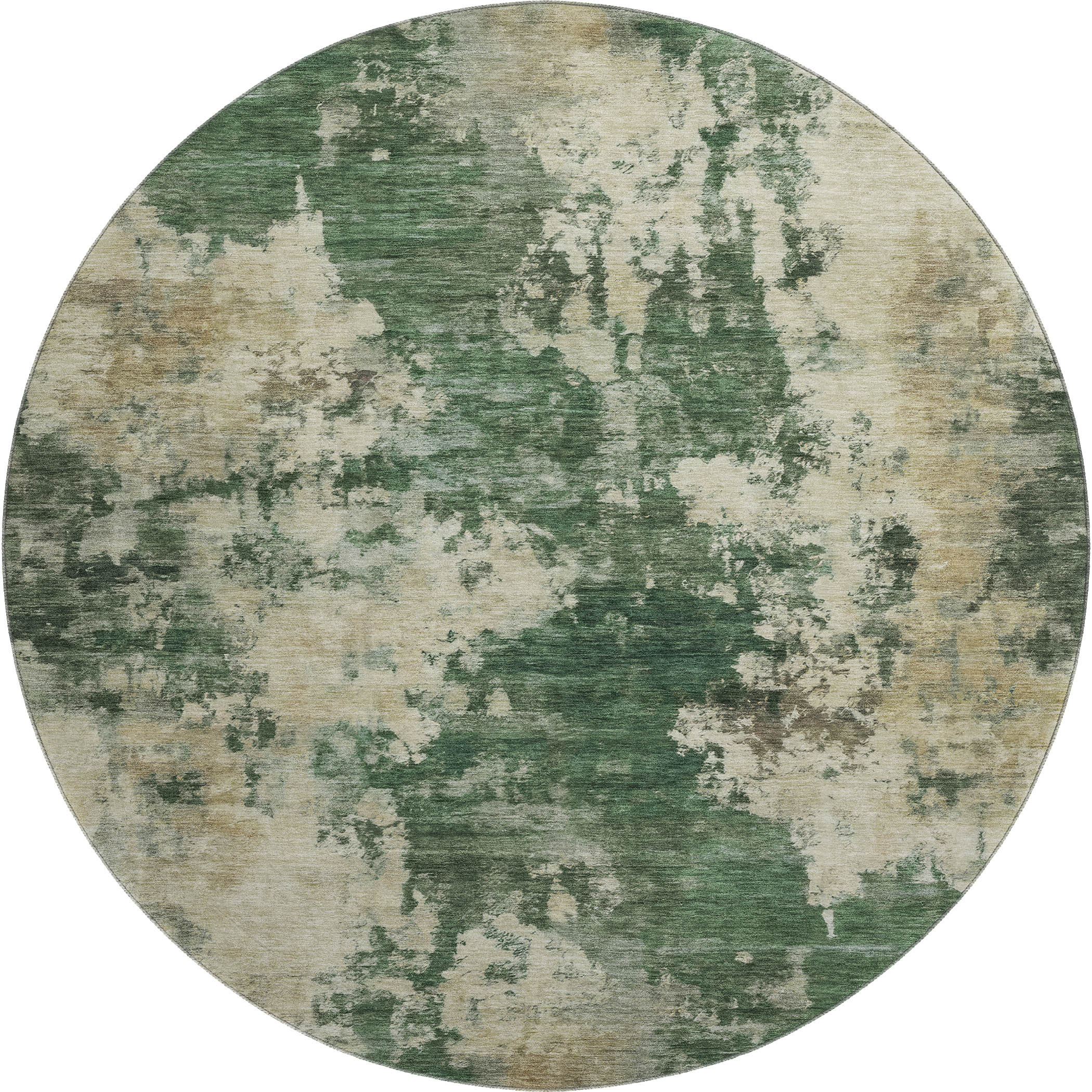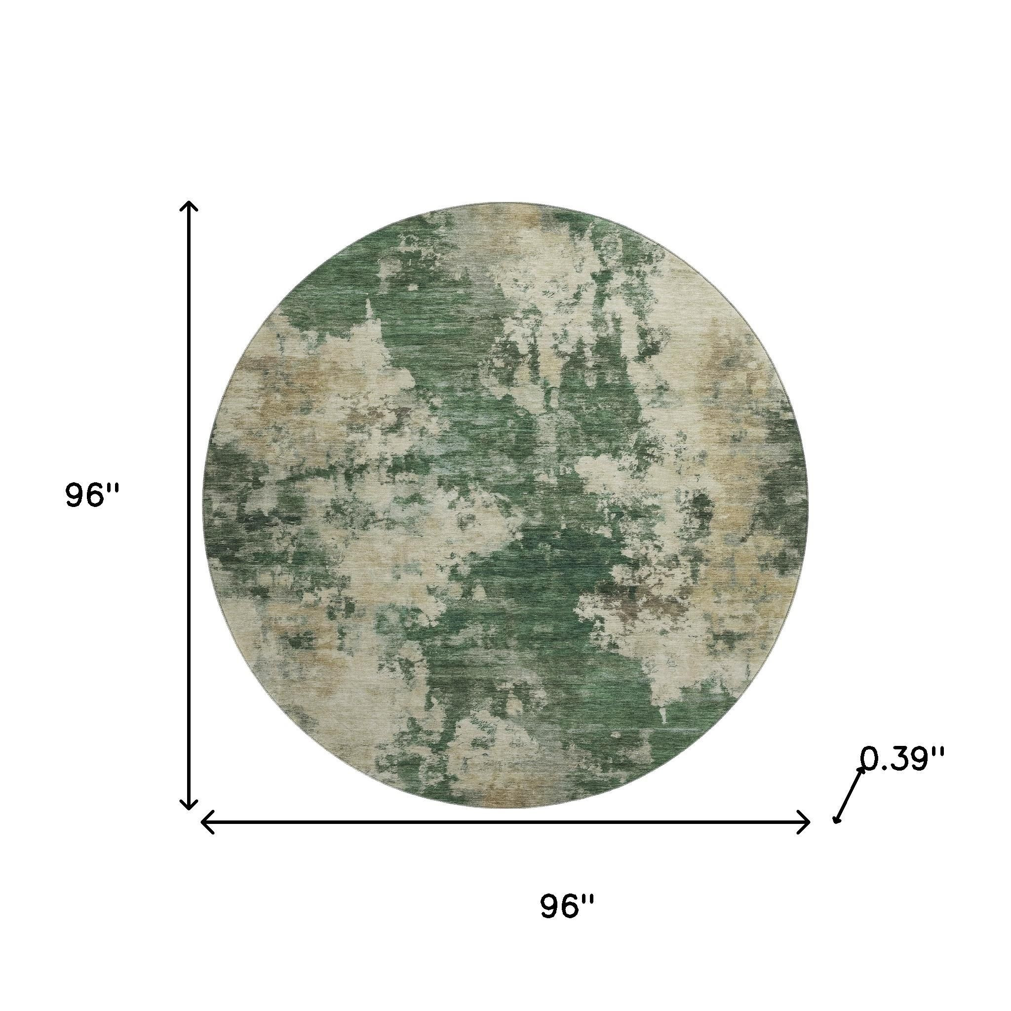 Add some artistry to your room with this 8-foot fern green and beige abstract washable round rug with uv protection. Ideal for spaces with kids and pets, this rug is stain resistant to help repel dirt and spilled liquids. Built to last, this rug crafted from polyester fibers is known for its durability and long lasting appeal. Rugs are a great way to showcase your style, hide imperfections, warm your home and reduce noise. This larger sized, transitional styled rug is ready to create a focal point or statement piece in your room. 96.00-inch h x 96.00-inch w x 0.39-inch d.