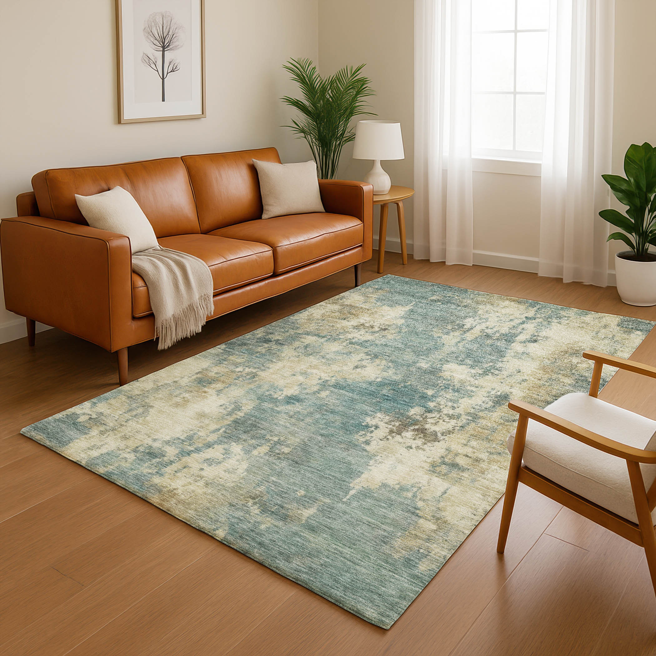 Add some artistry to your room with this 5-foot x 8-foot teal and beige abstract washable area rug with uv protection. Ideal for spaces with kids and pets, this rug is stain resistant to help repel dirt and spilled liquids. Built to last, this rug crafted from polyester fibers is known for its durability and long lasting appeal. Rugs are a great way to showcase your style, hide imperfections, warm your home and reduce noise. This larger sized, transitional styled rug is ready to create a focal point or statement piece in your room. 60.00-inch h x 90.00-inch w x 0.39-inch d.