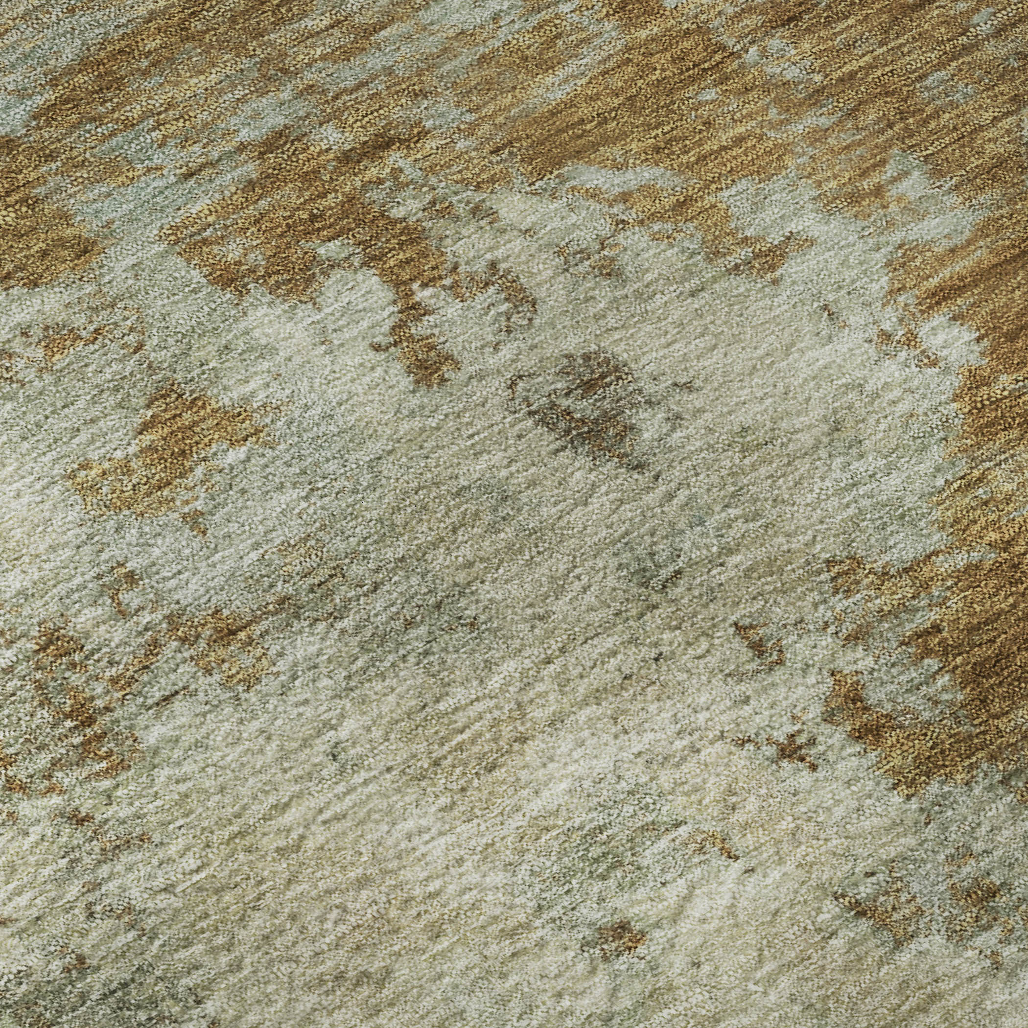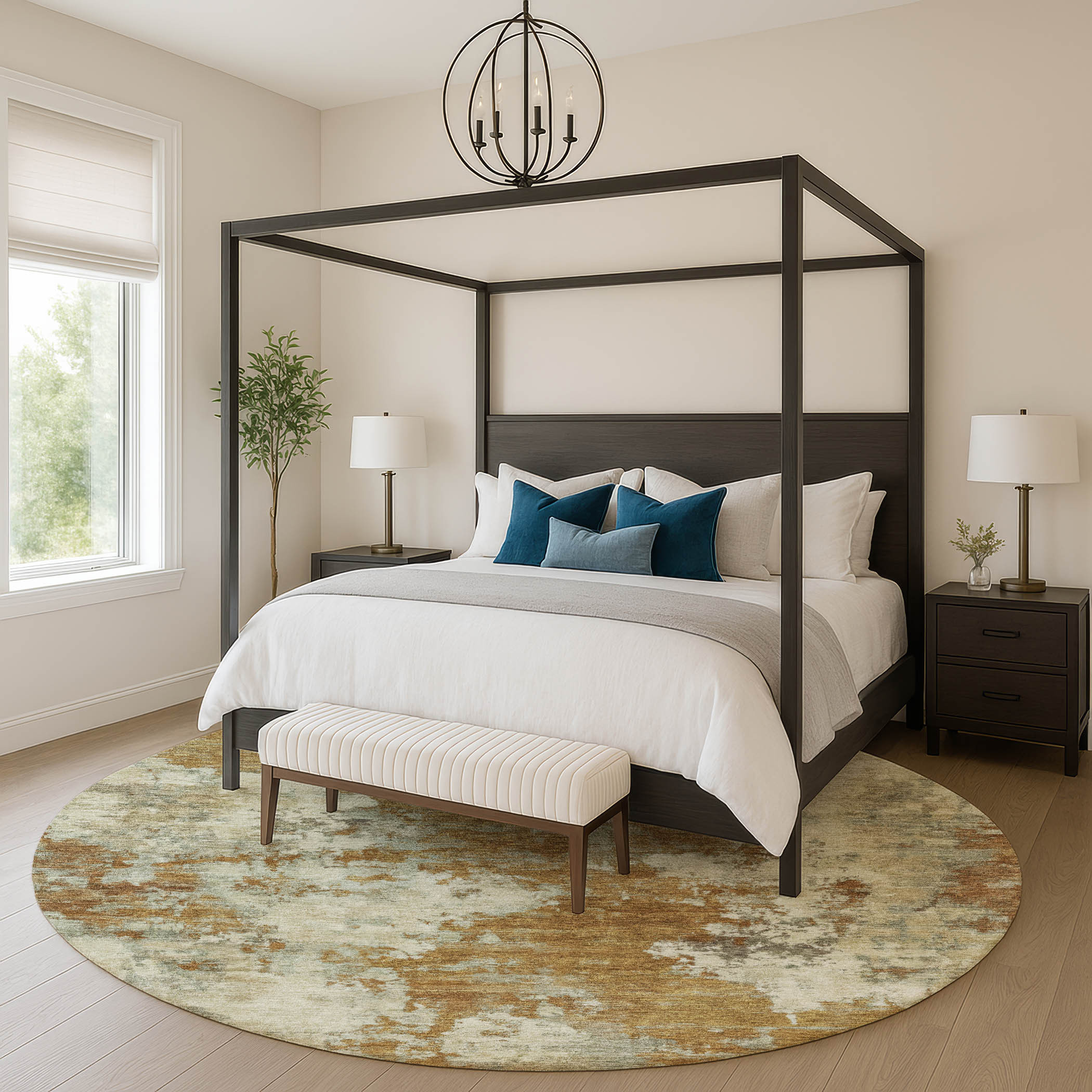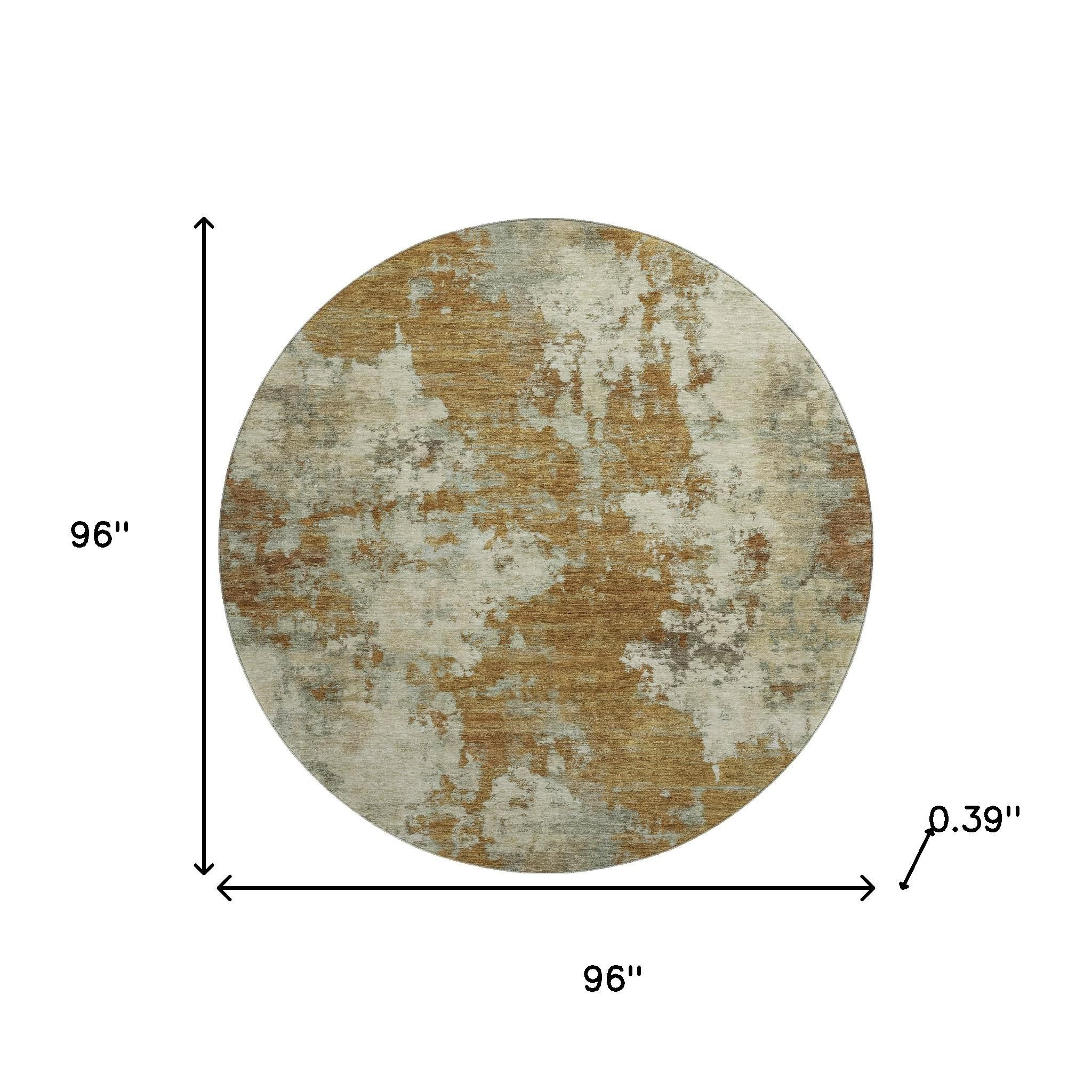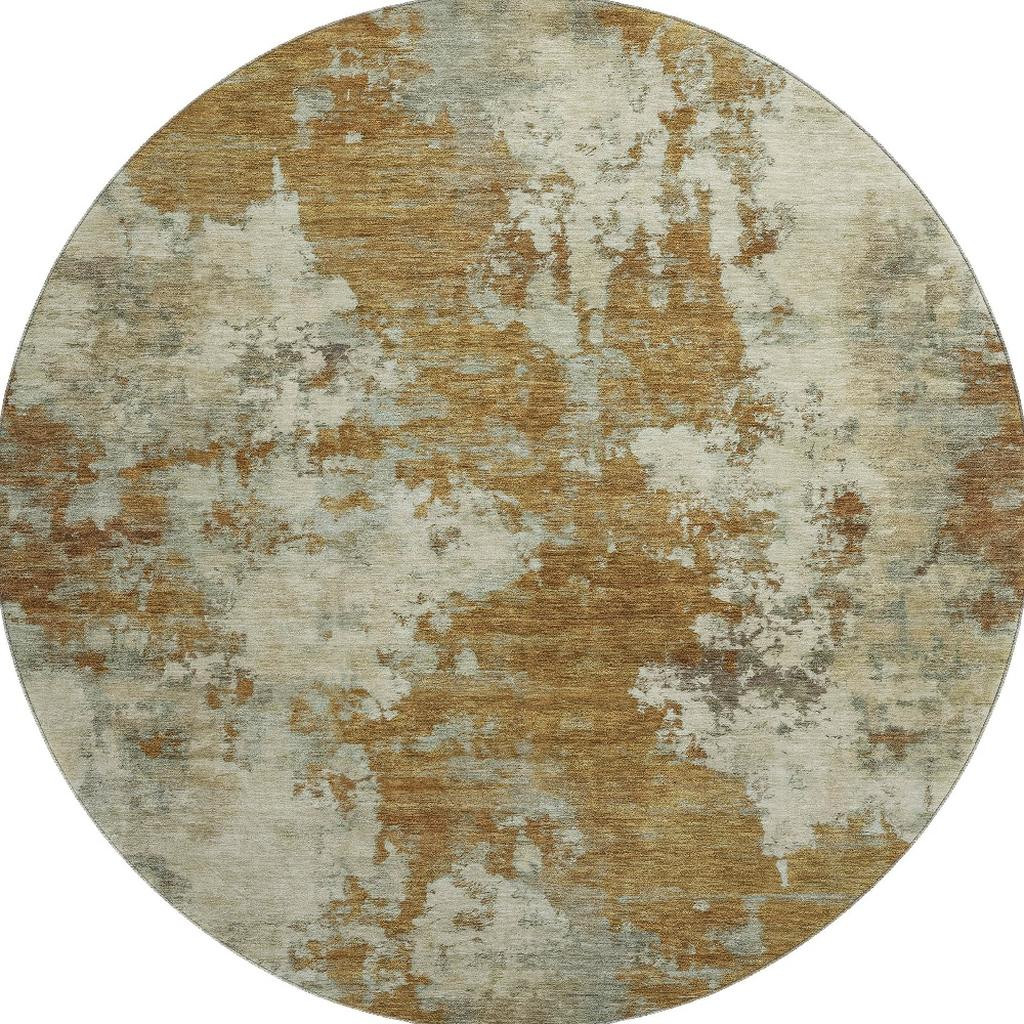 Add some artistry to your room with this 8-foot terra cotta and beige abstract washable round rug with uv protection. Ideal for spaces with kids and pets, this rug is stain resistant to help repel dirt and spilled liquids. Built to last, this rug crafted from polyester fibers is known for its durability and long lasting appeal. Rugs are a great way to showcase your style, hide imperfections, warm your home and reduce noise. This larger sized, transitional styled rug is ready to create a focal point or statement piece in your room. 96.00-inch h x 96.00-inch w x 0.39-inch d.