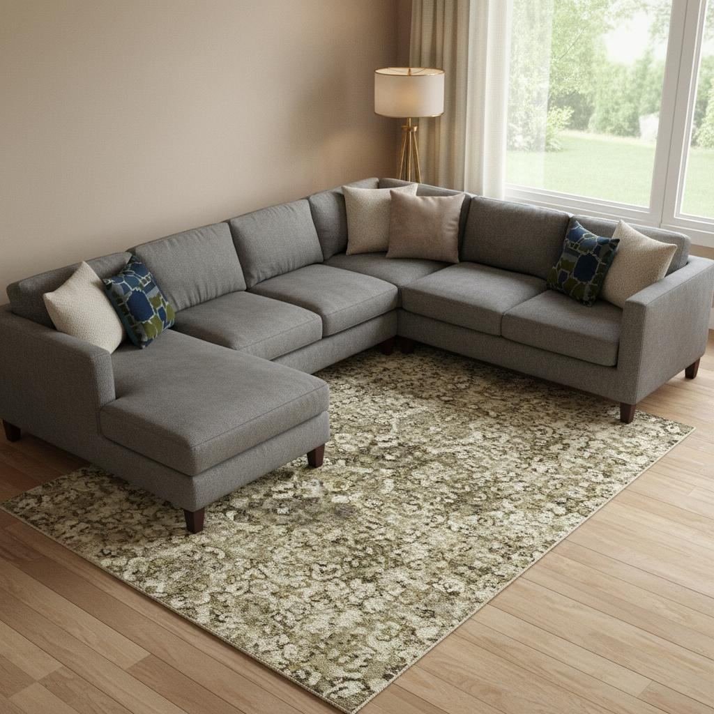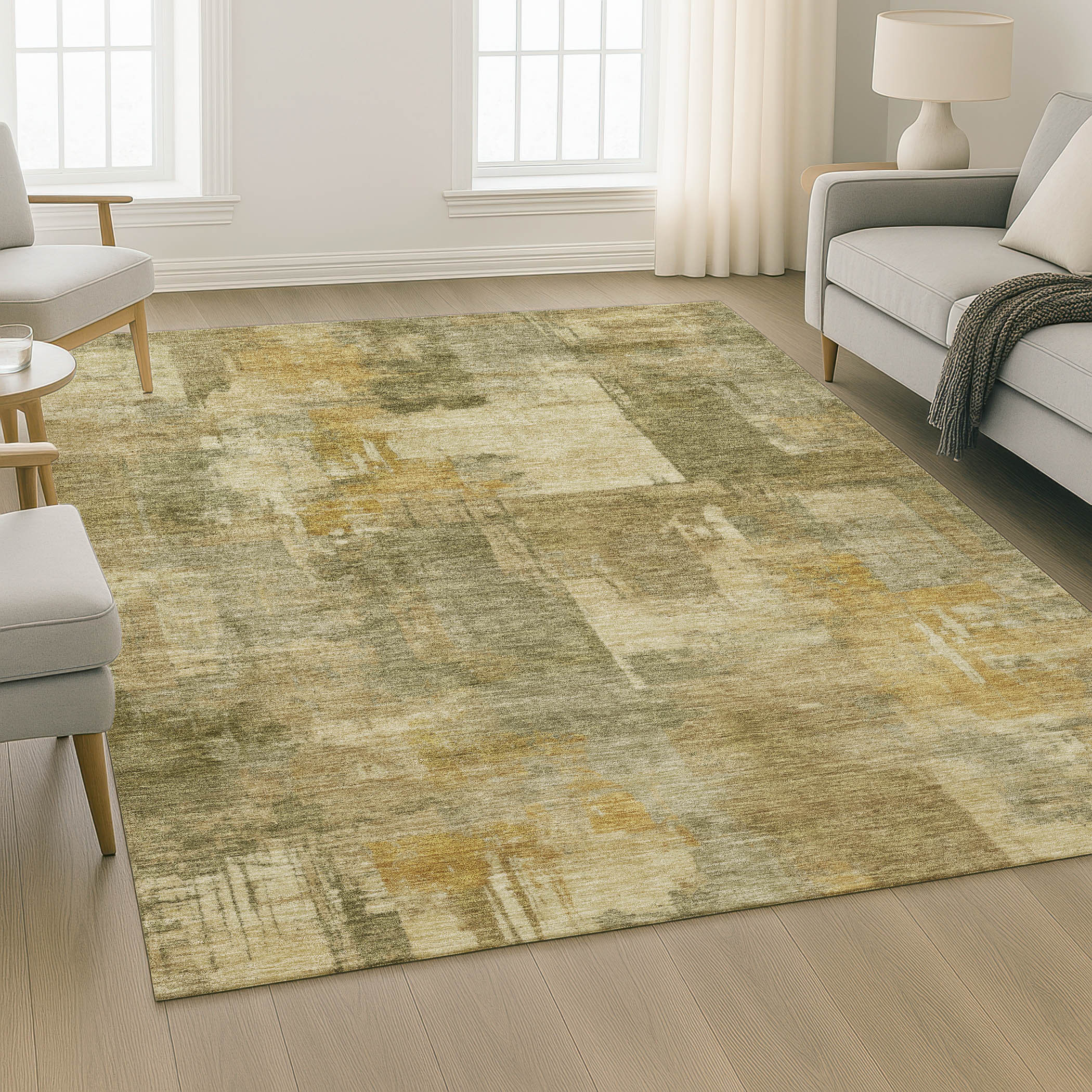 Add some artistry to your room with this 10-foot x 14-foot khaki and beige abstract washable area rug with uv protection. Ideal for spaces with kids and pets, this rug is stain resistant to help repel dirt and spilled liquids. Built to last, this rug crafted from polyester fibers is known for its durability and long lasting appeal. Rugs are a great way to showcase your style, hide imperfections, warm your home and reduce noise. This larger sized, transitional styled rug is ready to create a focal point or statement piece in your room. 120.00-inch h x 168.00-inch w x 0.39-inch d.