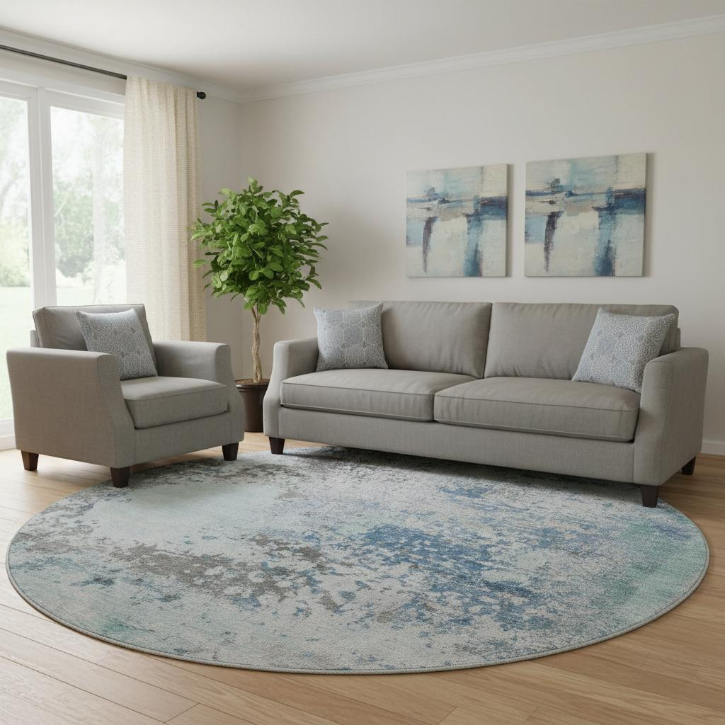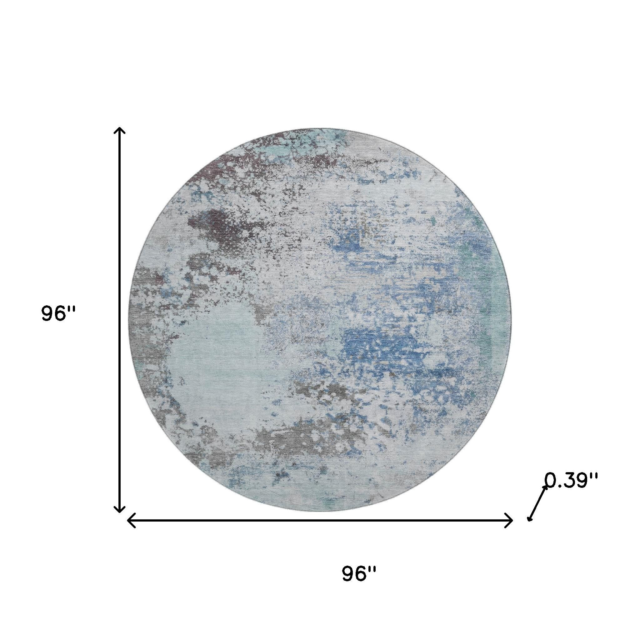 Add great coloration and comfortable texture to your space with this 8-foot turquoise and gray abstract washable round rug with uv protection. Ideal for spaces with kids and pets, this rug is stain resistant to help repel dirt and spilled liquids. Built to last, this rug crafted from polyester fibers is known for its durability and long lasting appeal. Rugs are a great way to showcase your style, hide imperfections, warm your home and reduce noise. This larger sized, transitional styled rug is ready to create a focal point or statement piece in your room. 96.00-inch h x 96.00-inch w x 0.39-inch d.