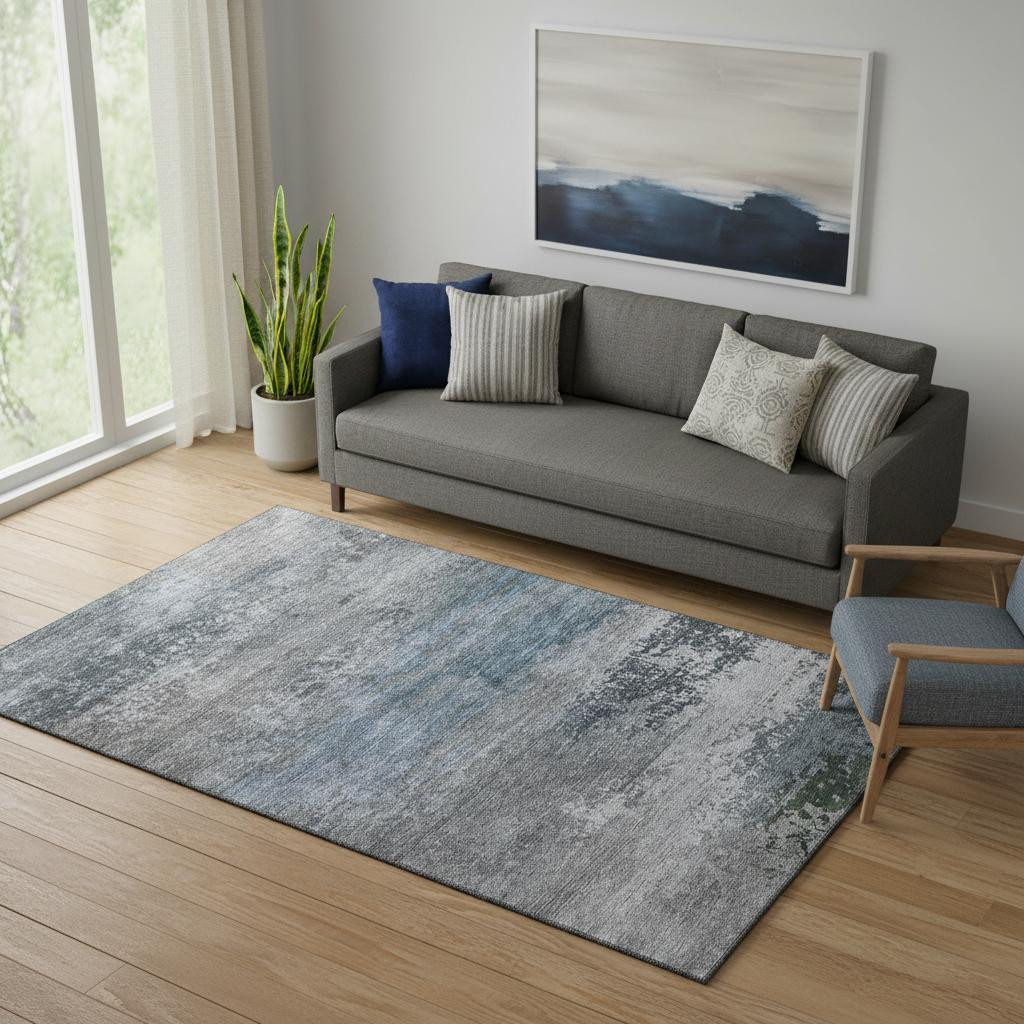 This 5-foot x 8-foot pewter and charcoal abstract washable area rug with uv protection, is a great way to add warmth to a room. Ideal for spaces with kids and pets, this rug is stain resistant to help repel dirt and spilled liquids. Built to last, this rug crafted from polyester fibers is known for its durability and long lasting appeal. Rugs are a great way to showcase your style, hide imperfections, warm your home and reduce noise. This larger sized, transitional styled rug is ready to create a focal point or statement piece in your room. 60.00-inch h x 90.00-inch w x 0.39-inch d.