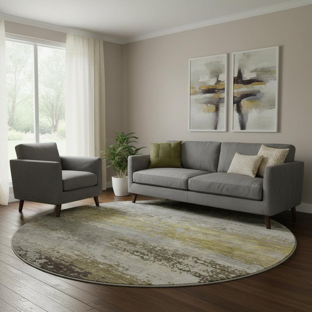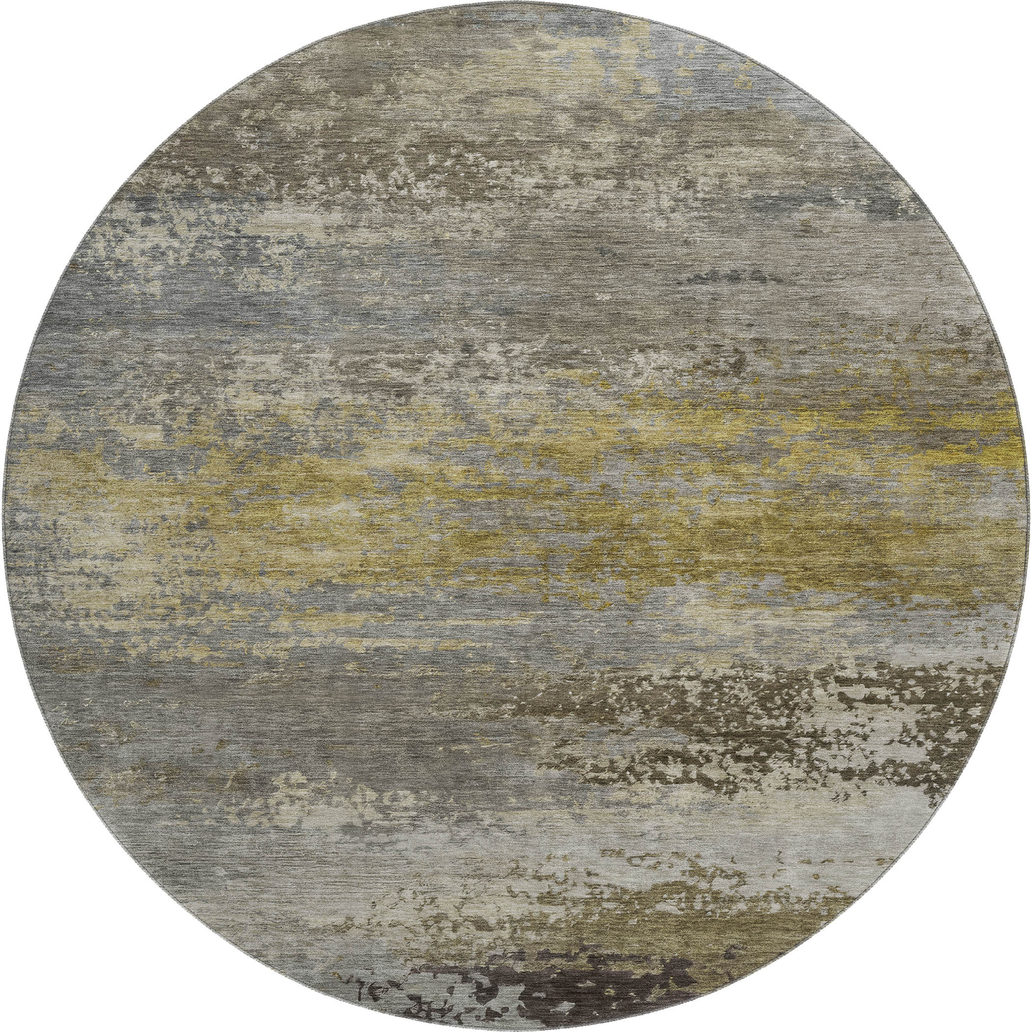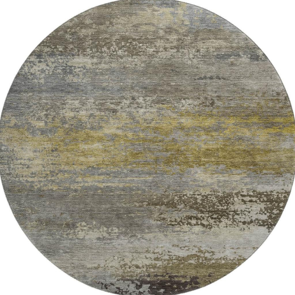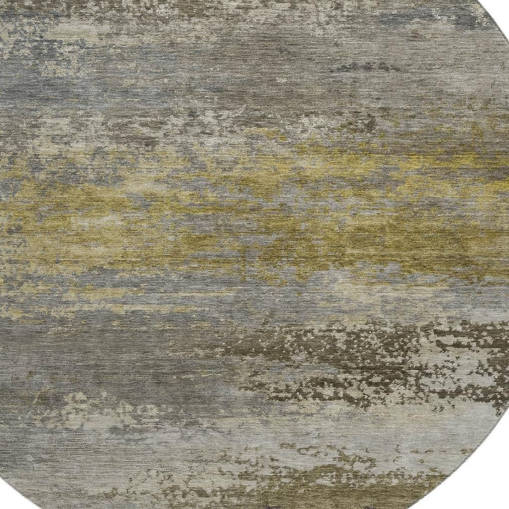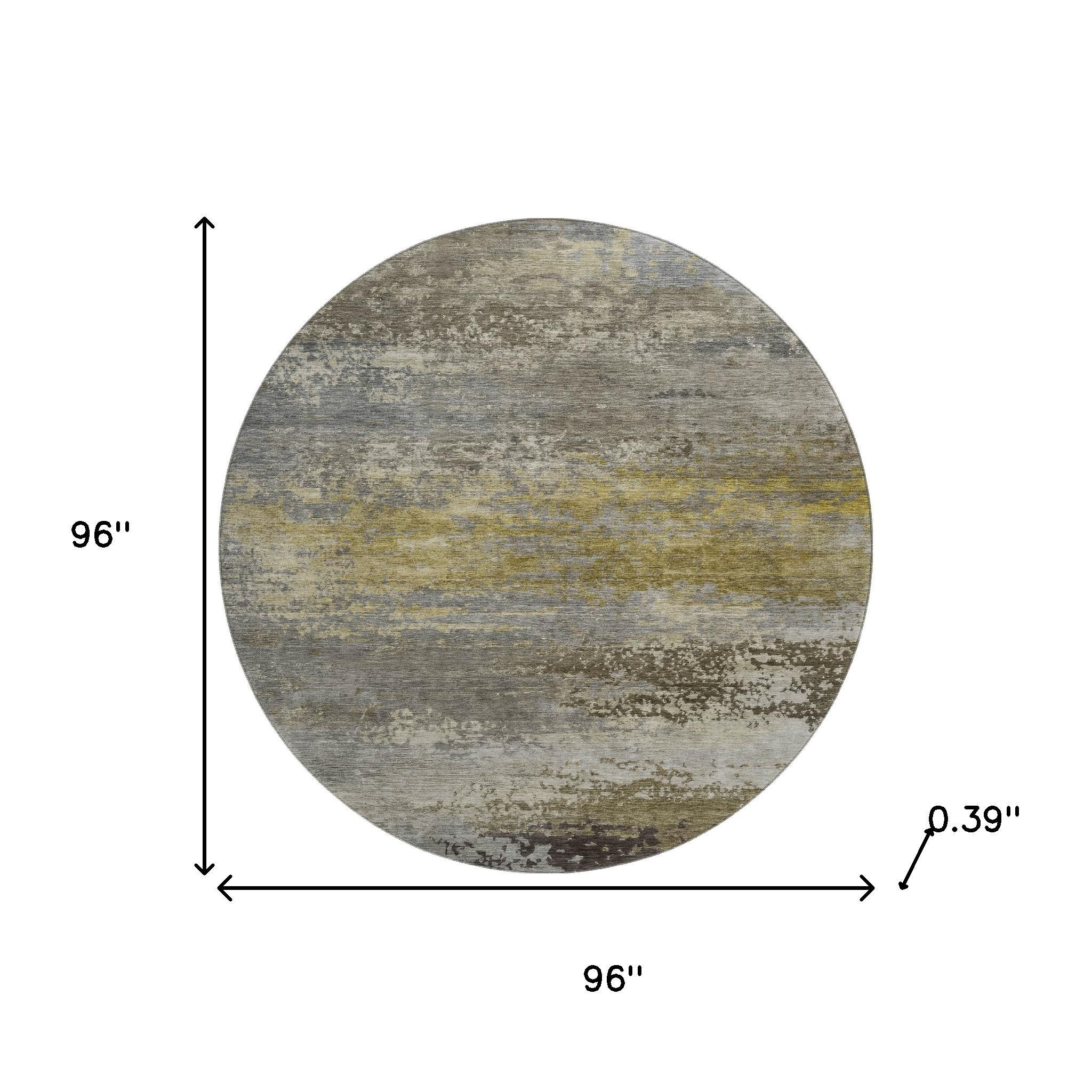 Set an inviting tone in your space with this 8-foot taupe and gold abstract washable round rug with uv protection. Ideal for spaces with kids and pets, this rug is stain resistant to help repel dirt and spilled liquids. Built to last, this rug crafted from polyester fibers is known for its durability and long lasting appeal. Rugs are a great way to showcase your style, hide imperfections, warm your home and reduce noise. This larger sized, transitional styled rug is ready to create a focal point or statement piece in your room. 96.00-inch h x 96.00-inch w x 0.39-inch d.