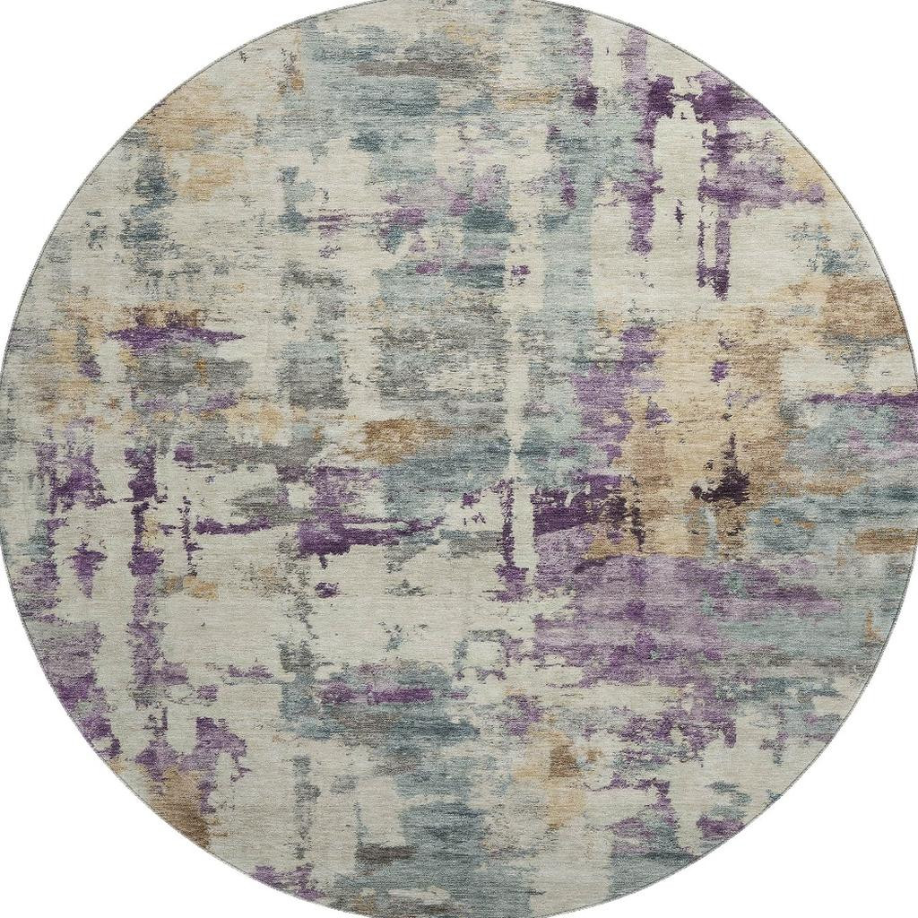 Set an inviting tone in your space with this 8-foot linen and purple abstract washable round rug with uv protection. Ideal for spaces with kids and pets, this rug is stain resistant to help repel dirt and spilled liquids. Built to last, this rug crafted from polyester fibers is known for its durability and long lasting appeal. Rugs are a great way to showcase your style, hide imperfections, warm your home and reduce noise. This larger sized, transitional styled rug is ready to create a focal point or statement piece in your room. 96.00-inch h x 96.00-inch w x 0.39-inch d.