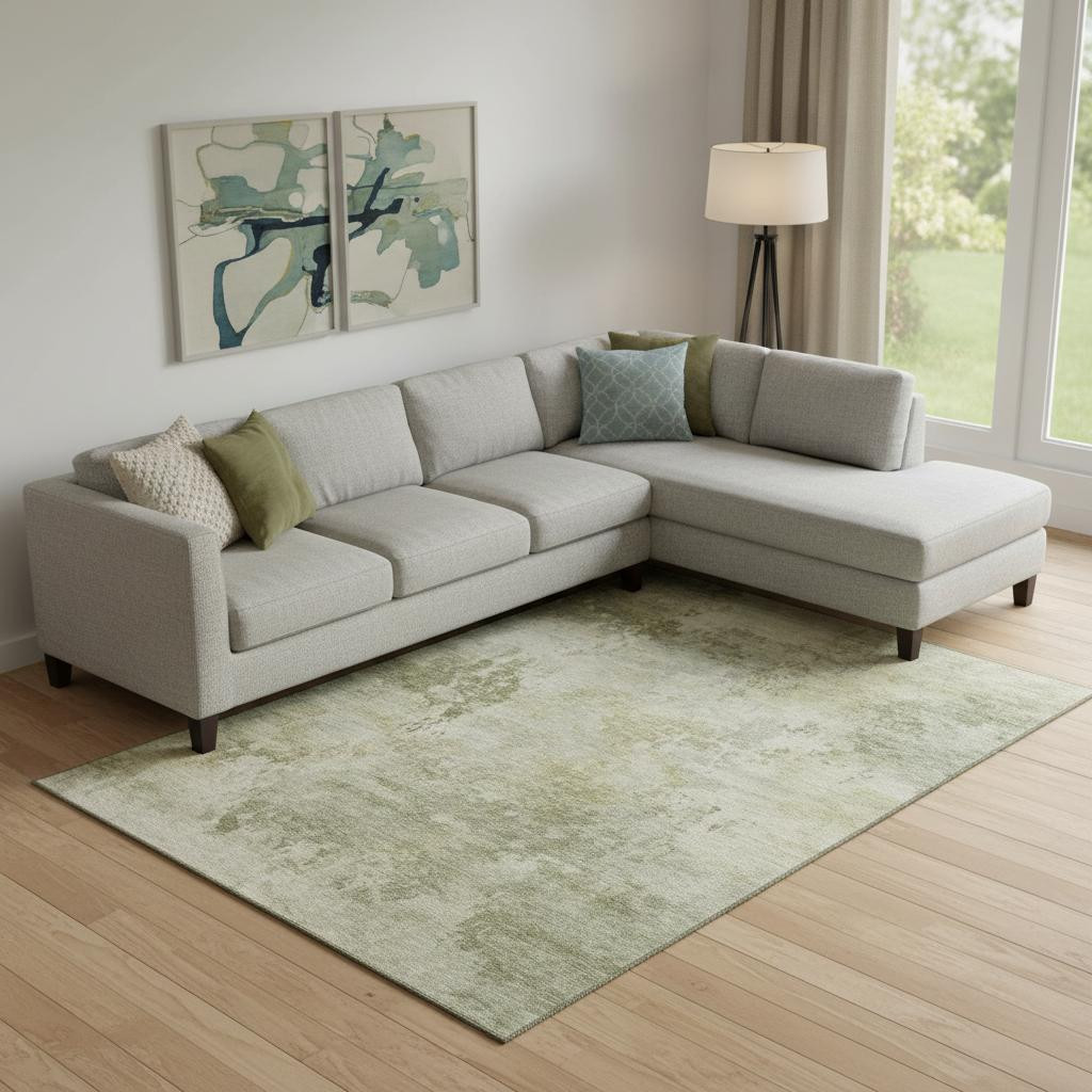 This 9-foot x 12-foot sage and beige abstract washable area rug with uv protection, is a great way to add warmth to a room. Ideal for spaces with kids and pets, this rug is stain resistant to help repel dirt and spilled liquids. Built to last, this rug crafted from polyester fibers is known for its durability and long lasting appeal. Rugs are a great way to showcase your style, hide imperfections, warm your home and reduce noise. This larger sized, transitional styled rug is ready to create a focal point or statement piece in your room. 108.00-inch h x 144.00-inch w x 0.39-inch d.