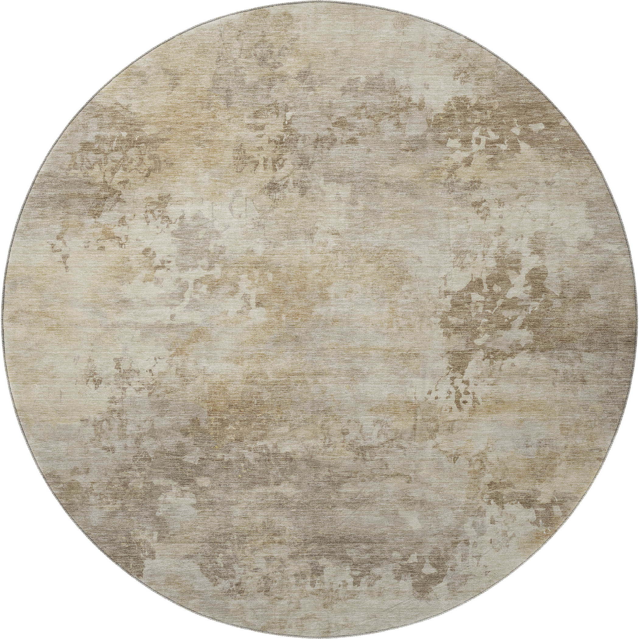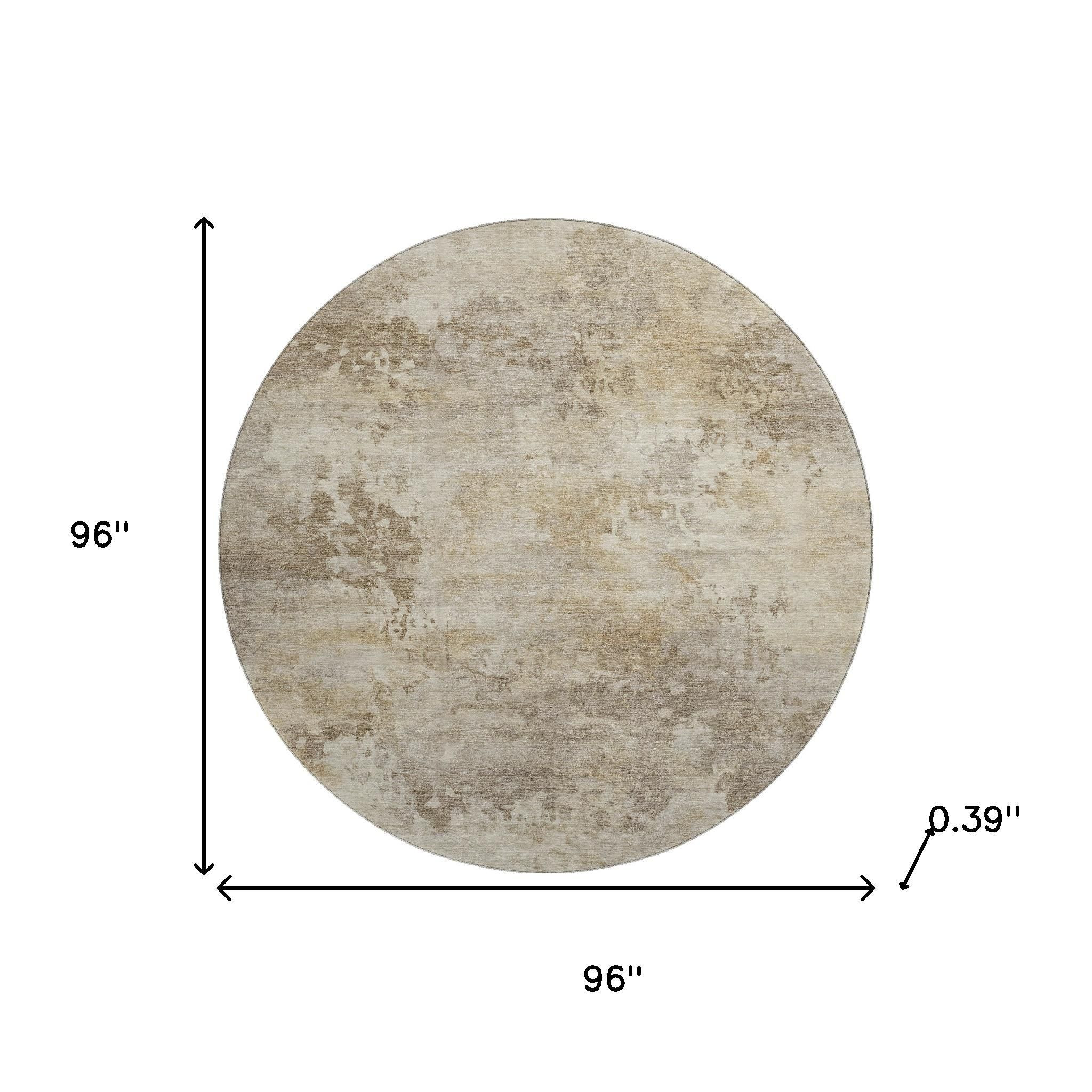 This 8-foot tan and beige abstract washable round rug with uv protection, is a great way to add warmth to a room. Ideal for spaces with kids and pets, this rug is stain resistant to help repel dirt and spilled liquids. Built to last, this rug crafted from polyester fibers is known for its durability and long lasting appeal. Rugs are a great way to showcase your style, hide imperfections, warm your home and reduce noise. This larger sized, transitional styled rug is ready to create a focal point or statement piece in your room. 96.00-inch h x 96.00-inch w x 0.39-inch d.