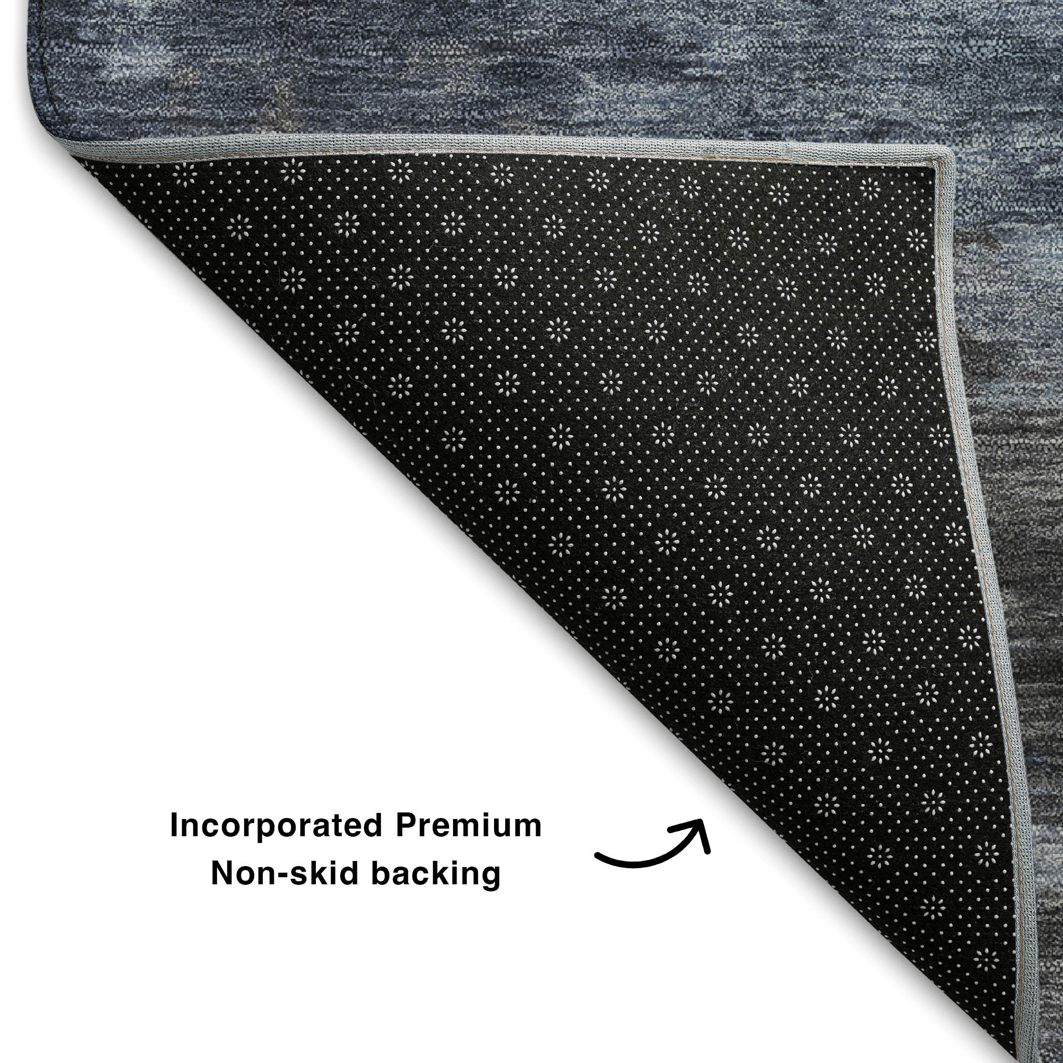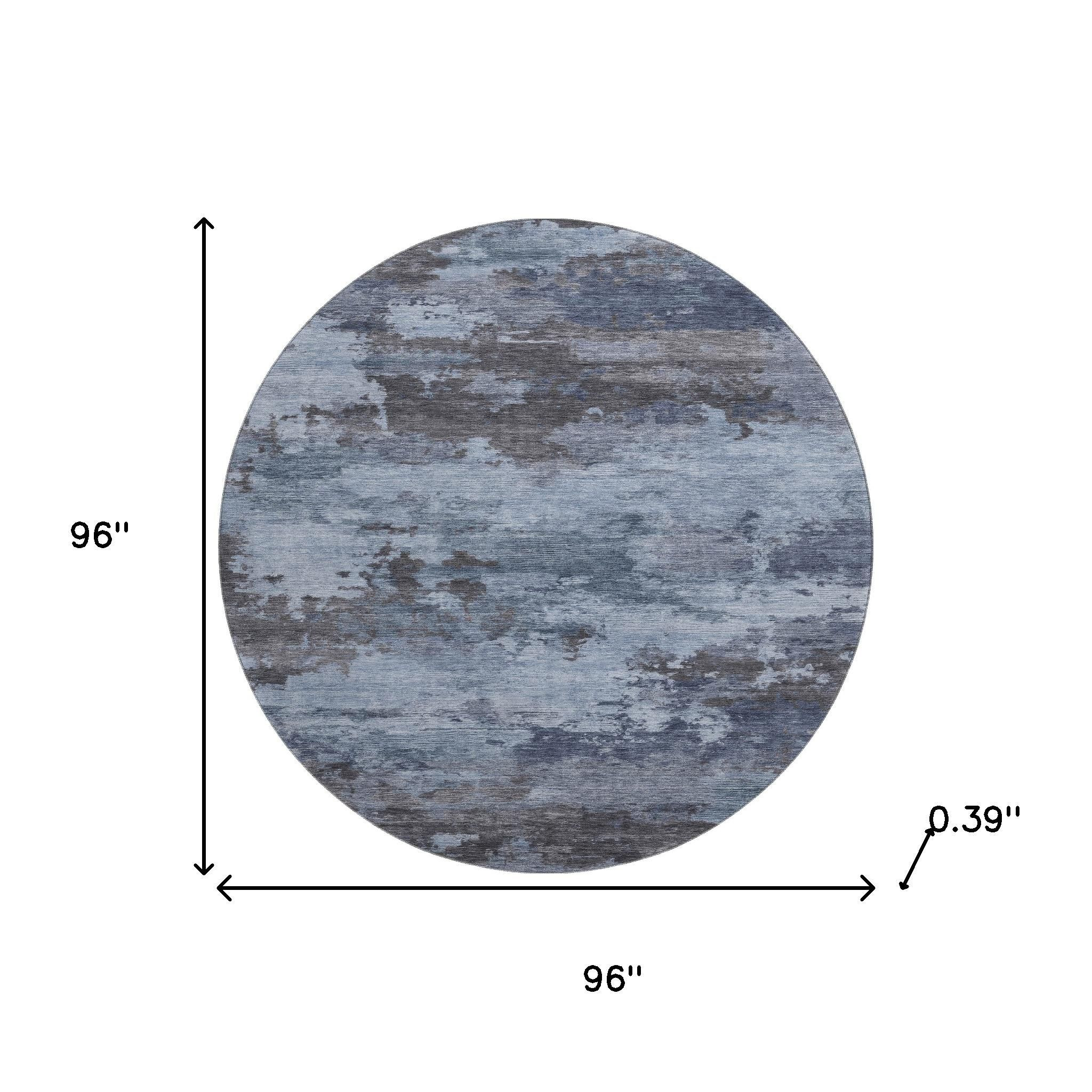 Add some artistry to your room with this 8-foot blue and charcoal abstract washable round rug with uv protection. Ideal for spaces with kids and pets, this rug is stain resistant to help repel dirt and spilled liquids. Built to last, this rug crafted from polyester fibers is known for its durability and long lasting appeal. Rugs are a great way to showcase your style, hide imperfections, warm your home and reduce noise. This larger sized, transitional styled rug is ready to create a focal point or statement piece in your room. 96.00-inch h x 96.00-inch w x 0.39-inch d.