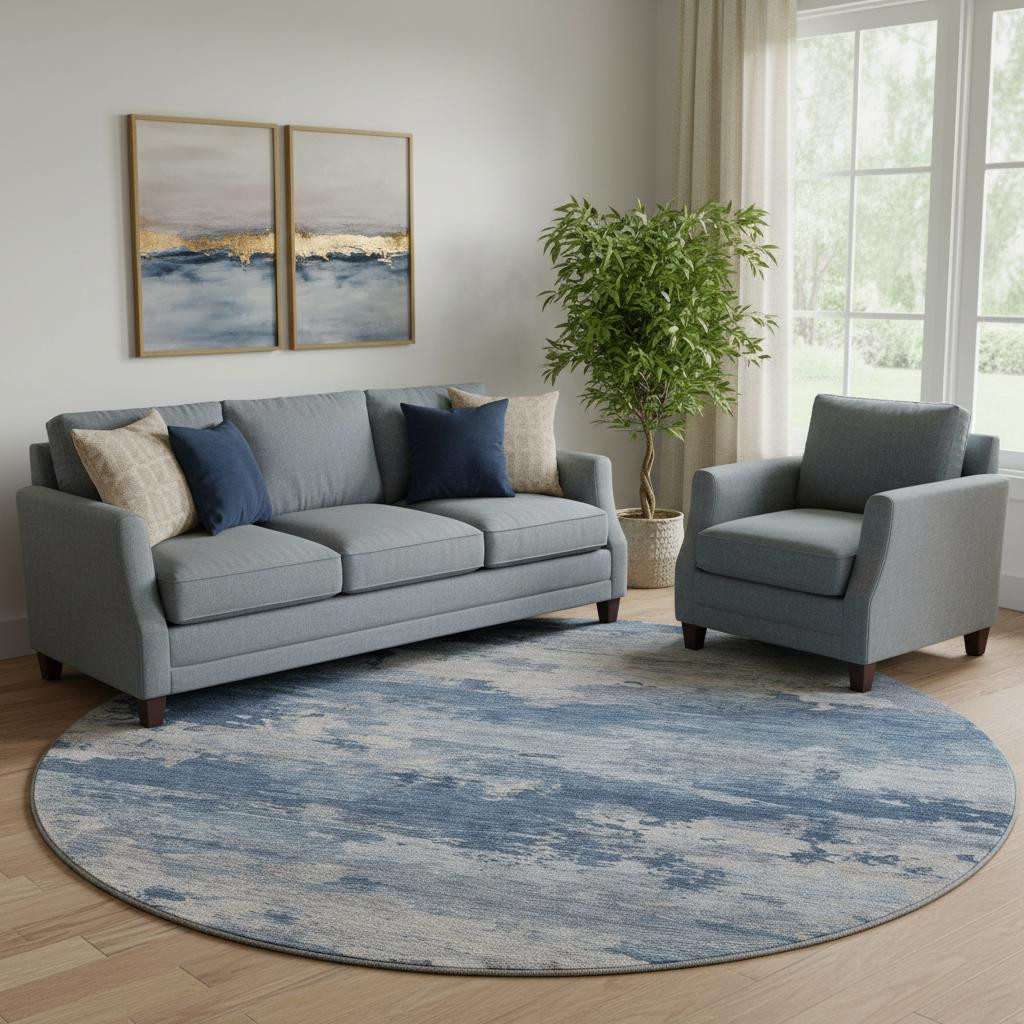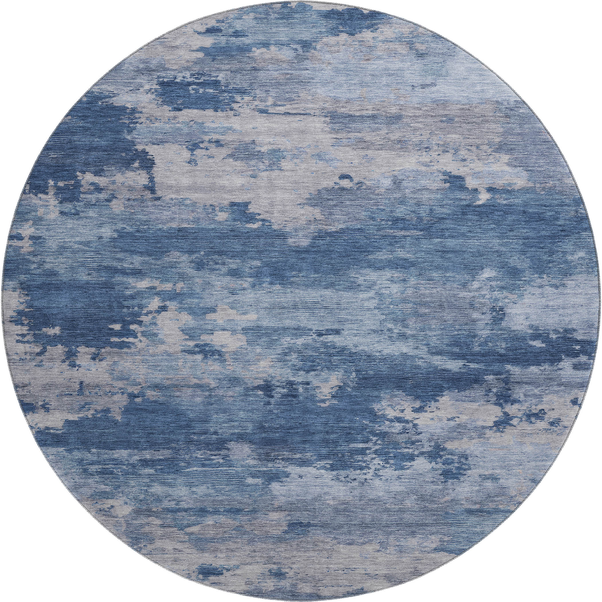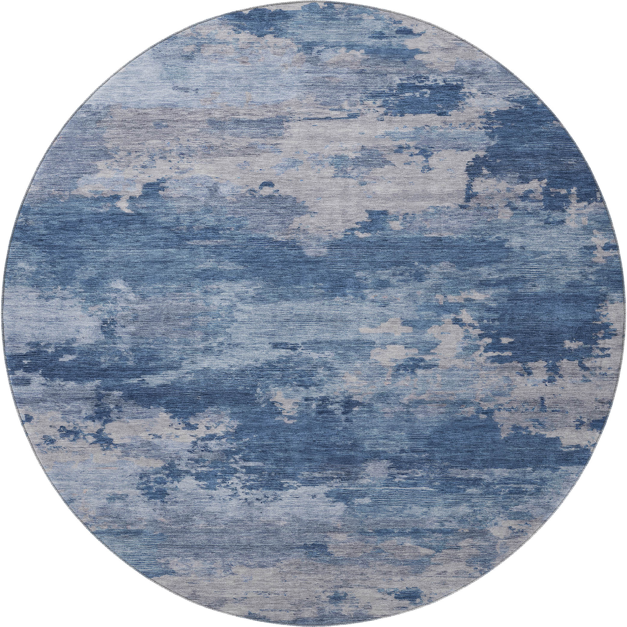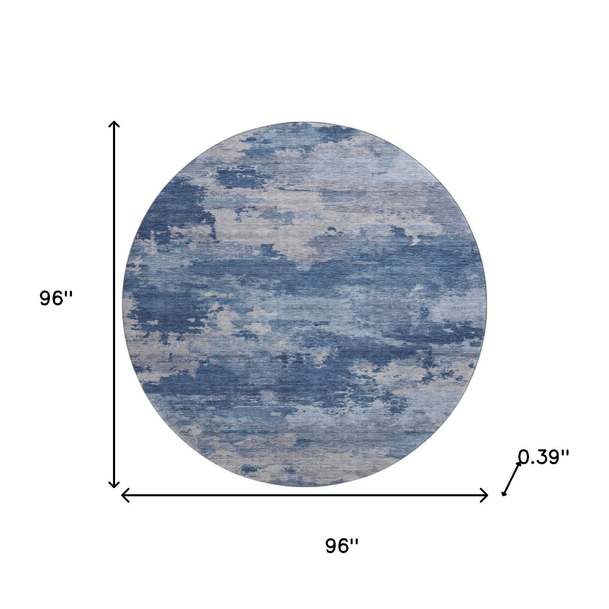 This 8-foot navy blue and denim blue abstract washable round rug with uv protection, is a great way to add warmth to a room. Ideal for spaces with kids and pets, this rug is stain resistant to help repel dirt and spilled liquids. Built to last, this rug crafted from polyester fibers is known for its durability and long lasting appeal. Rugs are a great way to showcase your style, hide imperfections, warm your home and reduce noise. This larger sized, transitional styled rug is ready to create a focal point or statement piece in your room. 96.00-inch h x 96.00-inch w x 0.39-inch d.