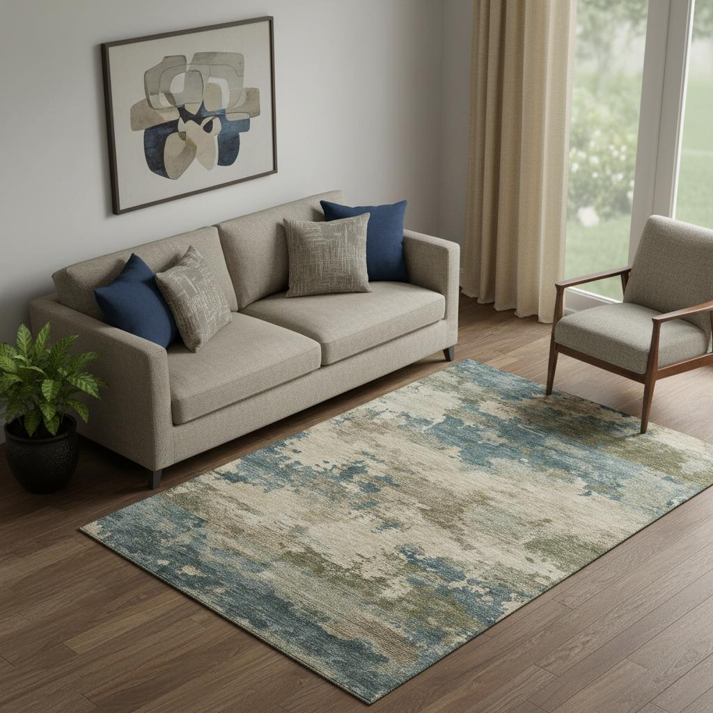 Add great coloration and comfortable texture to your space with this 5-foot x 8-foot teal and beige abstract washable area rug with uv protection. Ideal for spaces with kids and pets, this rug is stain resistant to help repel dirt and spilled liquids. Built to last, this rug crafted from polyester fibers is known for its durability and long lasting appeal. Rugs are a great way to showcase your style, hide imperfections, warm your home and reduce noise. This larger sized, transitional styled rug is ready to create a focal point or statement piece in your room. 60.00-inch h x 90.00-inch w x 0.39-inch d.
