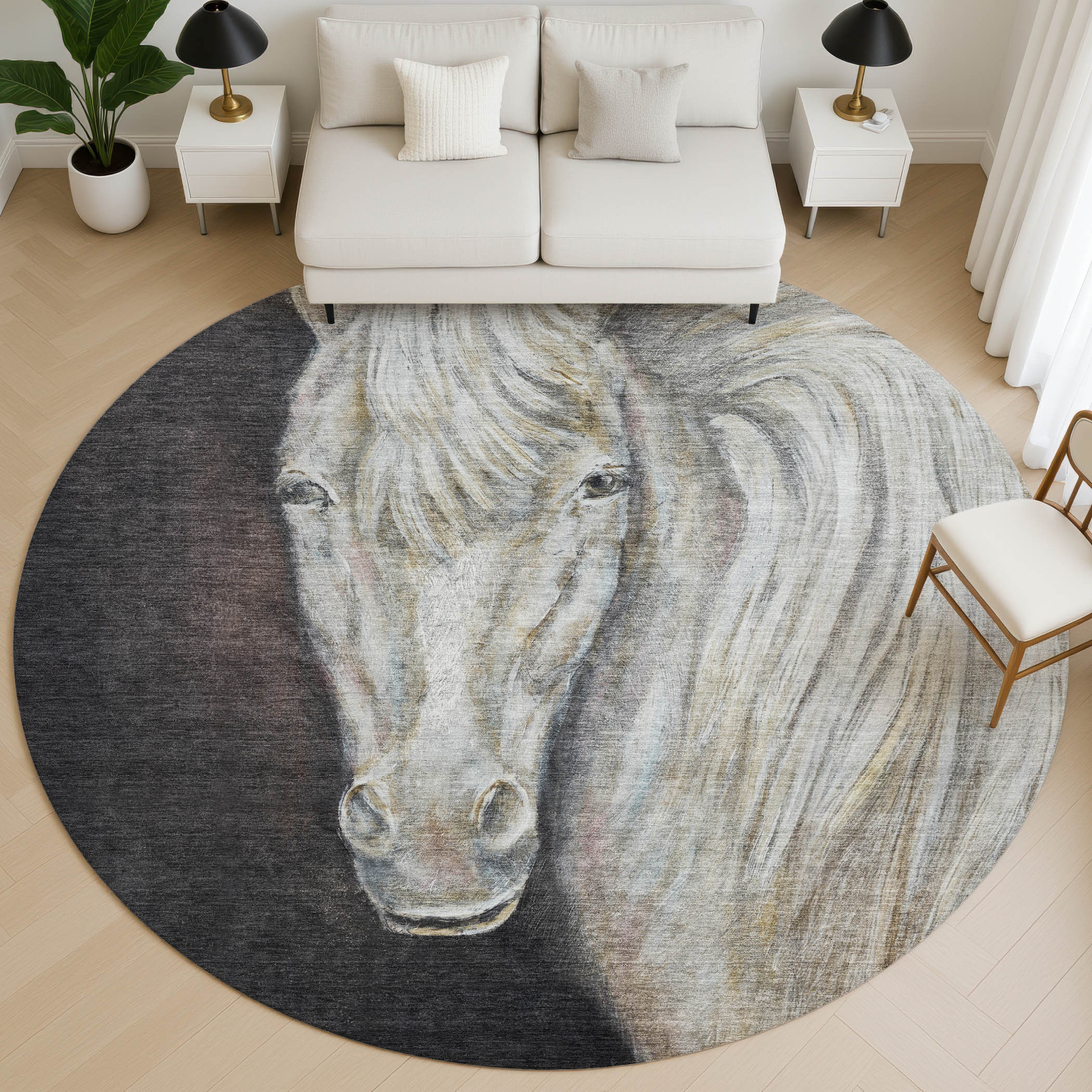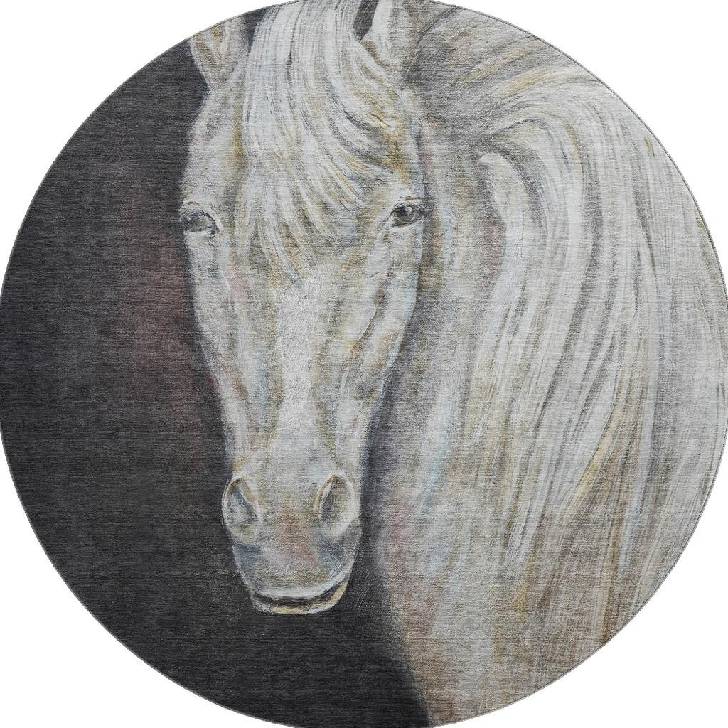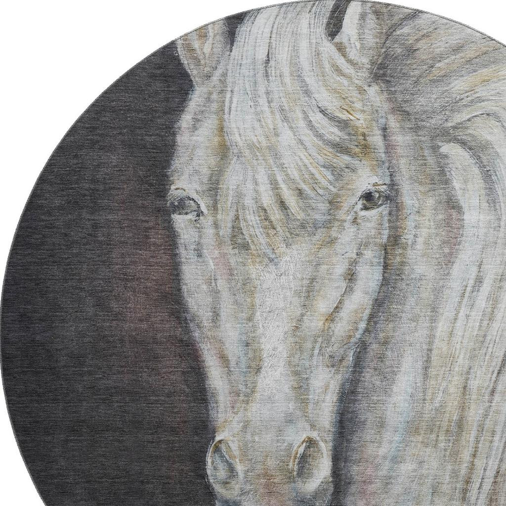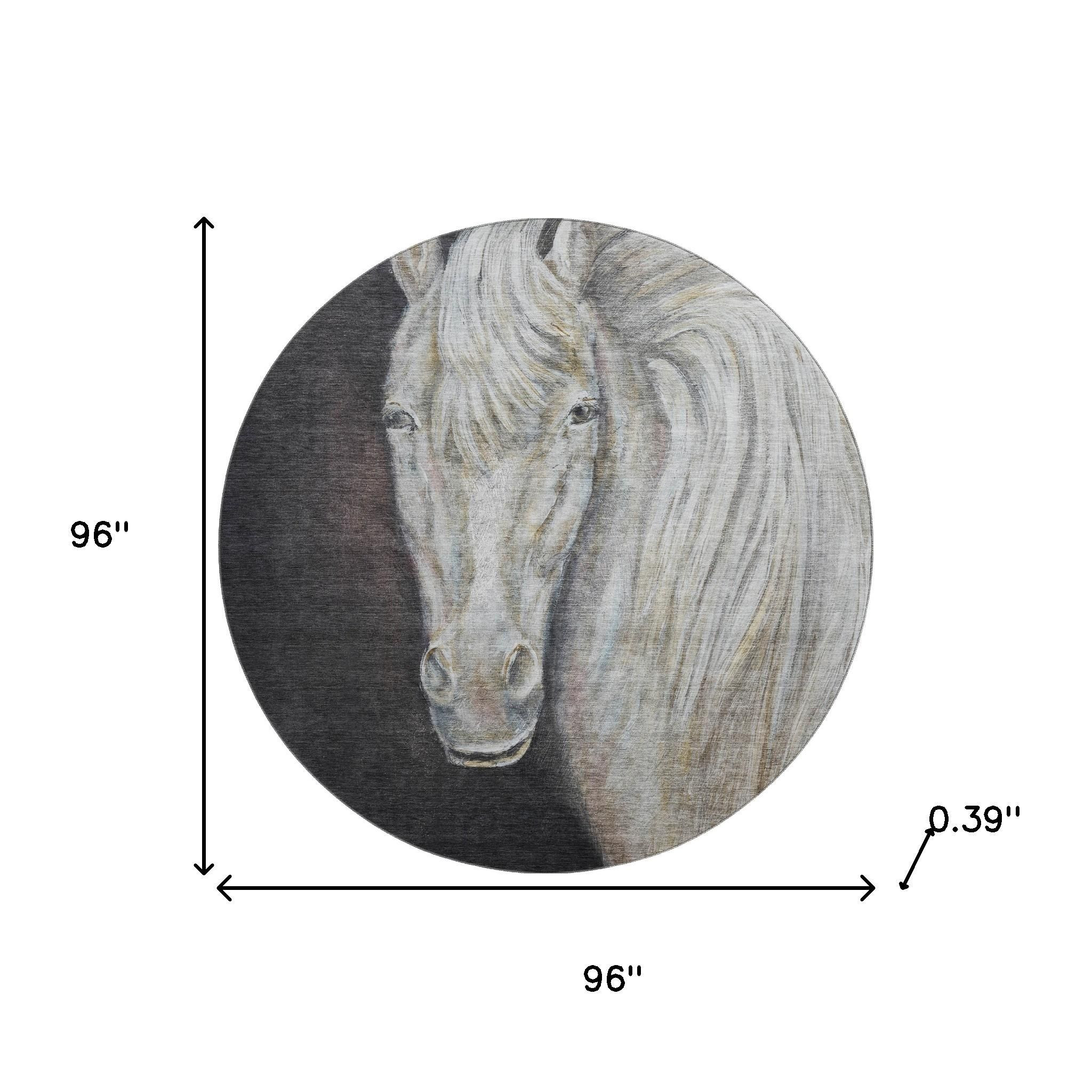 Set an inviting tone in your space with this 8-foot ivory and charcoal animal print washable round rug with uv protection. Ideal for spaces with kids and pets, this rug is stain resistant to help repel dirt and spilled liquids. Built to last, this rug crafted from polyester fibers is known for its durability and long lasting appeal. Rugs are a great way to showcase your style, hide imperfections, warm your home and reduce noise. This larger sized, transitional styled rug is ready to create a focal point or statement piece in your room. 96.00-inch h x 96.00-inch w x 0.39-inch d.