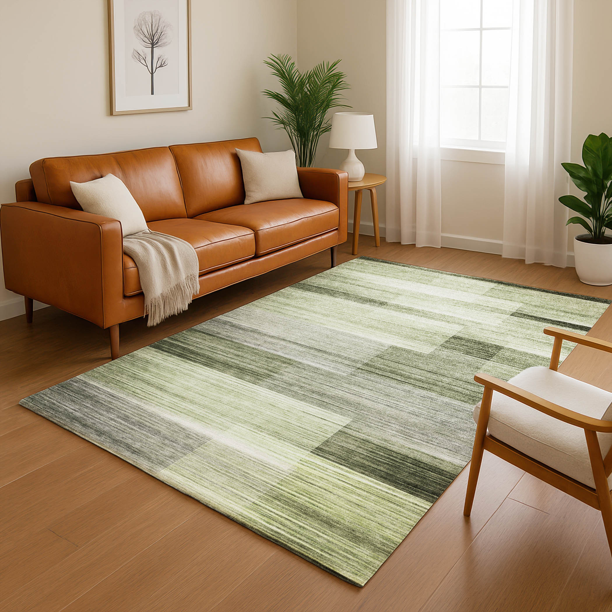 Add some artistry to your room with this 5-foot x 8-foot green and ivory striped washable area rug with uv protection. Ideal for spaces with kids and pets, this rug is stain resistant to help repel dirt and spilled liquids. Built to last, this rug crafted from polyester fibers is known for its durability and long lasting appeal. Rugs are a great way to showcase your style, hide imperfections, warm your home and reduce noise. This larger sized, transitional styled rug is ready to create a focal point or statement piece in your room. 60.00-inch h x 90.00-inch w x 0.39-inch d.